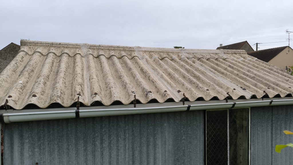 En fin d’hiver l’année dernière j’ai appliqué un produit anti-mousse BIO et très lent… j’ai terminé il y a quelques jours à démousser le toit… manuellement avec une spatule et un balai… et un bon masque car c’est du bon fibro-ciment bien amianté qui se désagrège un peu.