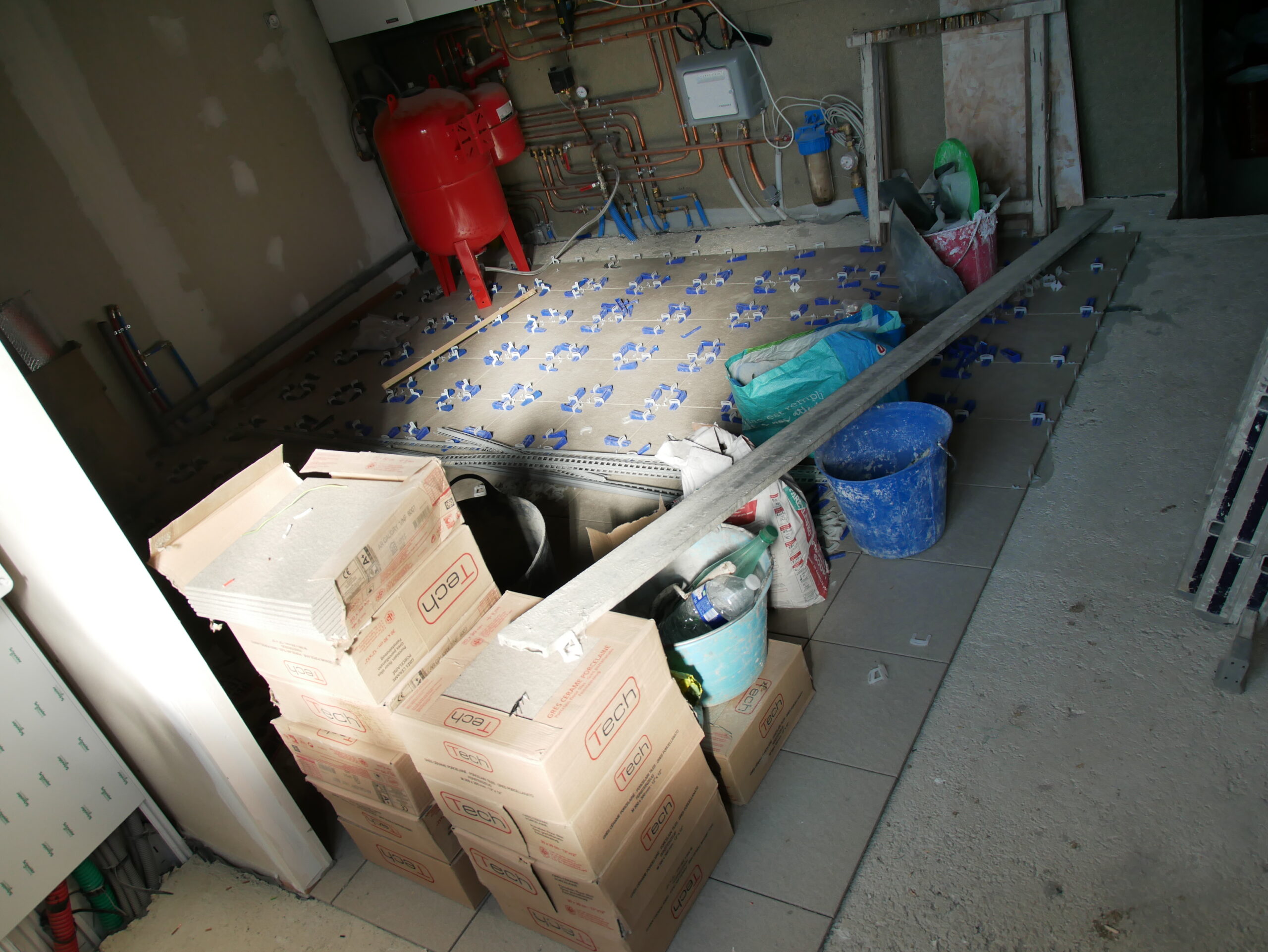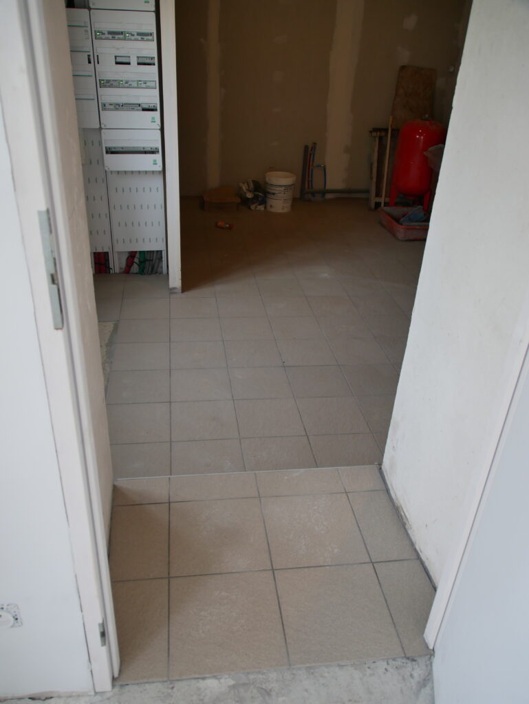 Le cellier n’a pas dérogé à la règle et une entreprise a passé 5 jours pour le poser. Cette dernière a utilisé la même technique que pour la pose du carrelage dans la chambre, à savoir des cales qui permettent de mettre les carreaux au même niveau. Ça marche pas mal sauf quand le carrelage est posé en plusieurs fois comme ce fut le cas ici. Entre chaque fois il y a un petit décalage entre les carreaux, mais rien de bien méchant.