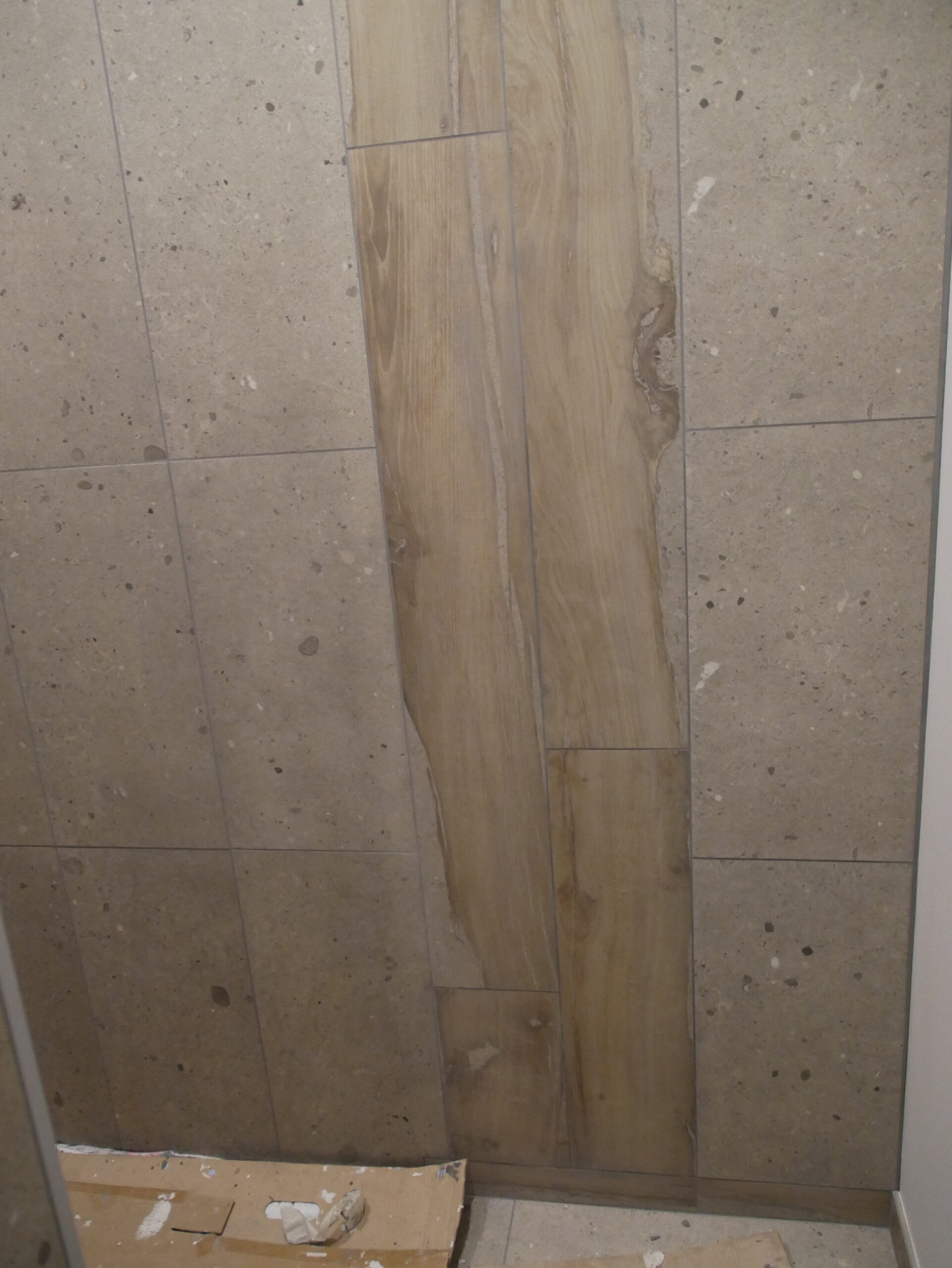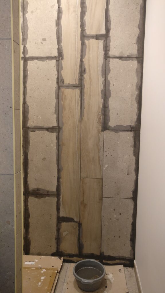 Le carrelage murale sera donc le même que celui du sol, à savoir des lames types parquet en 20*120cm et du galet en 30*60 (j’ai interdit le 60*60 au mur…)