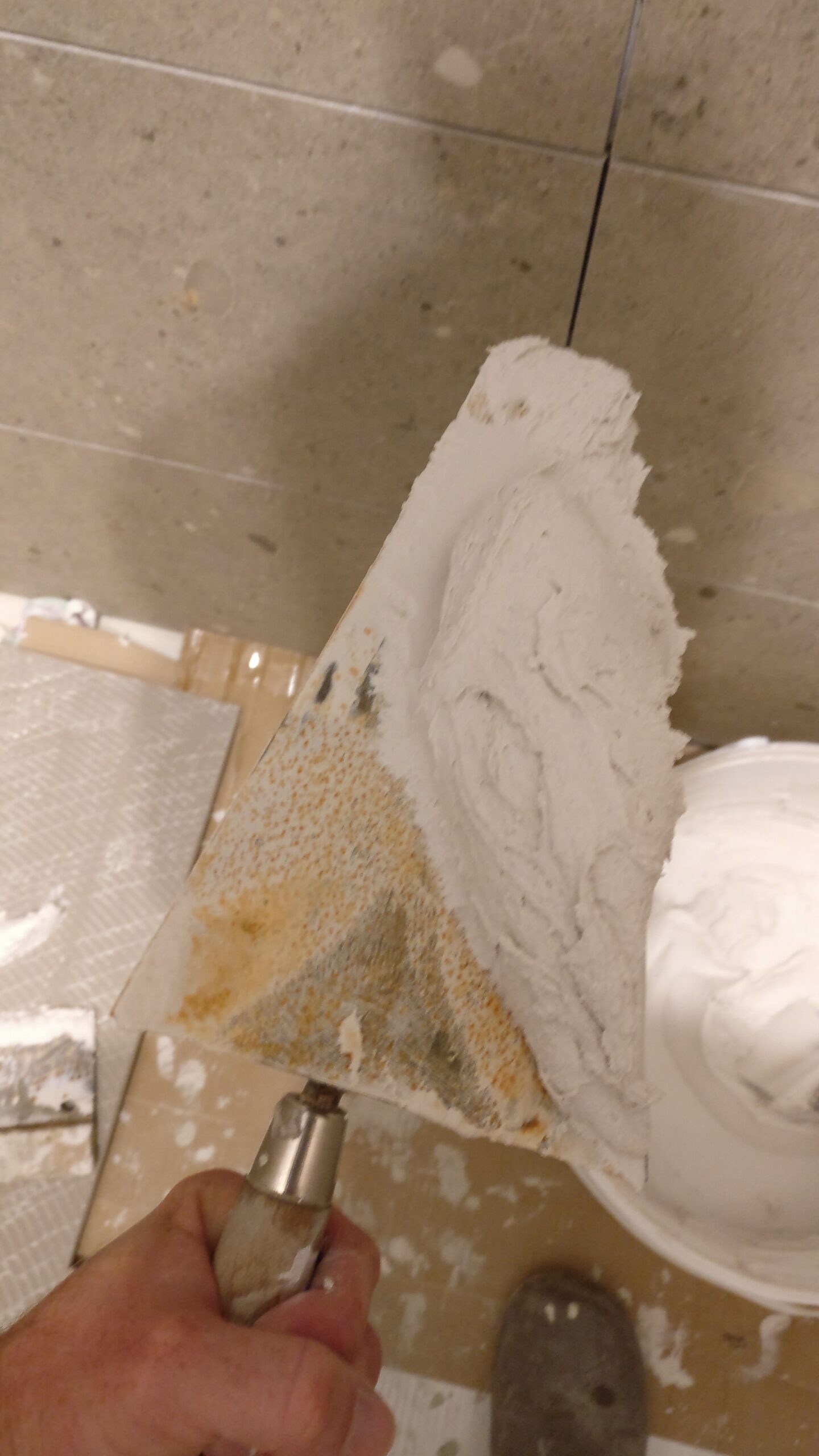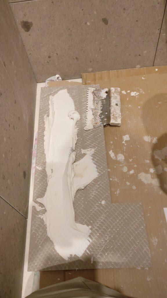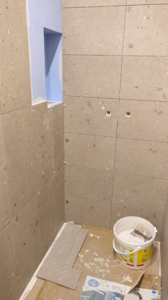 Seconde étape : pose du carrelage mur par mur. J’utilise la colle Weber Fix Plus spécial salle de bain. Pour éviter que les joints les plus épais (5mm dans les angles) ne se voient de trop, je commence par le petit mur du fond :