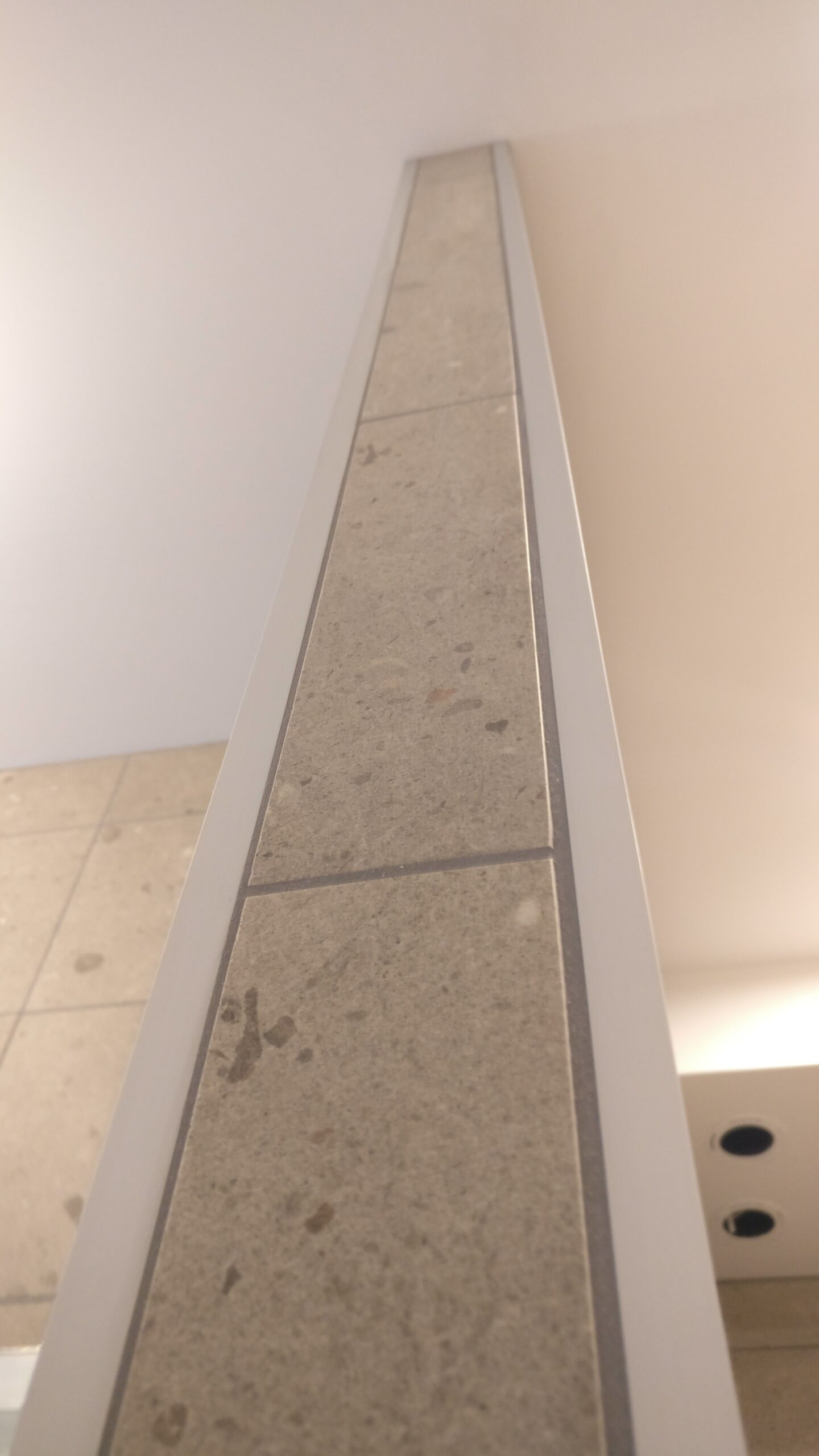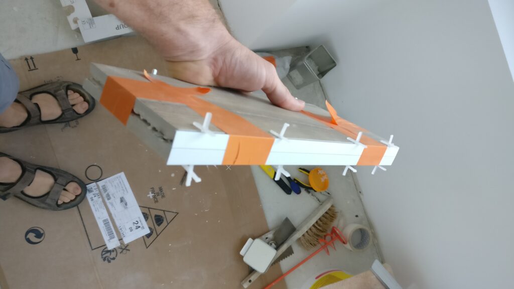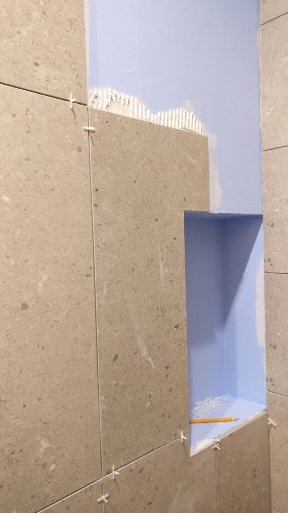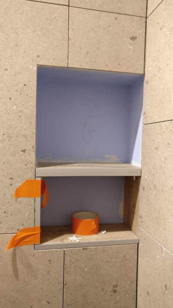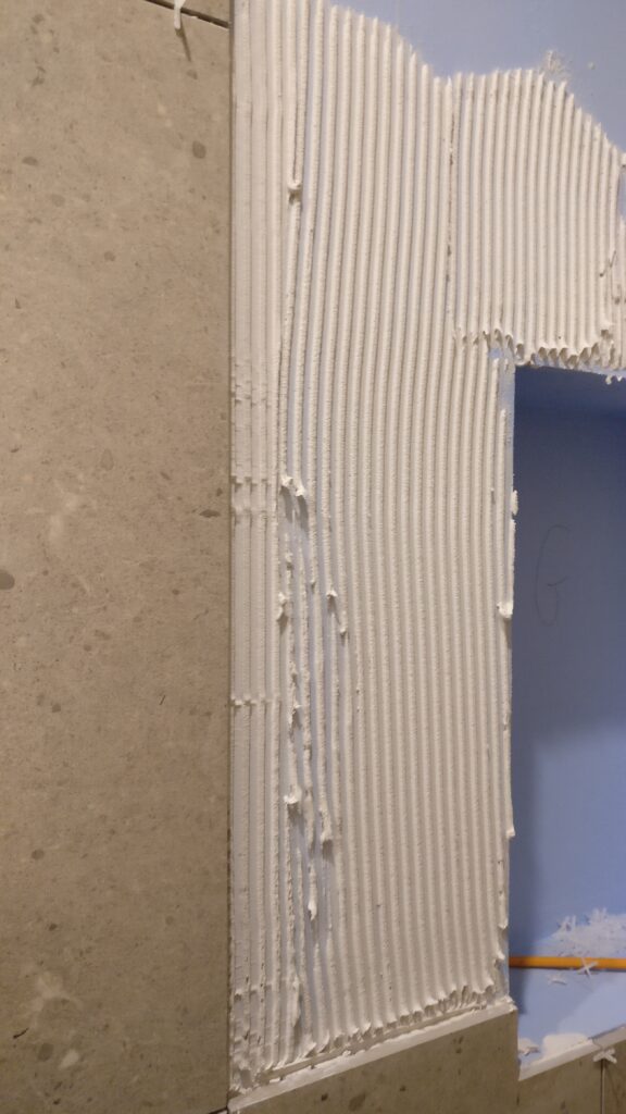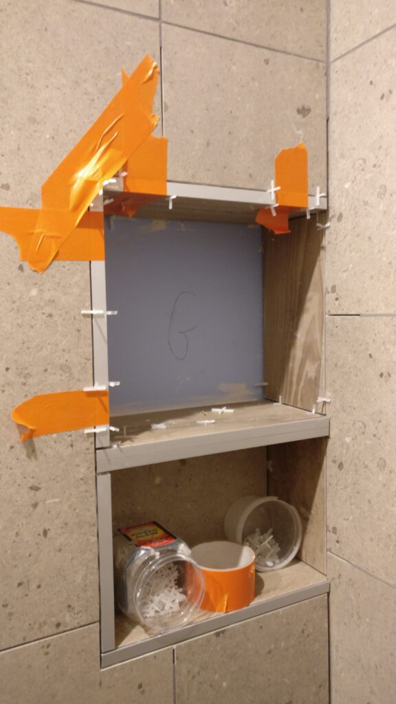 Pour la niche c’est plus compliqué car il faut la faire en plusieurs fois (je ne peux pas mettre de carreaux verticaux tant que celui du bas n’est pas sec par exemple. 1 jour un côté… c’est long. Pour la séparation du milieu j’ai décidé de la faire a part, en carrelage.