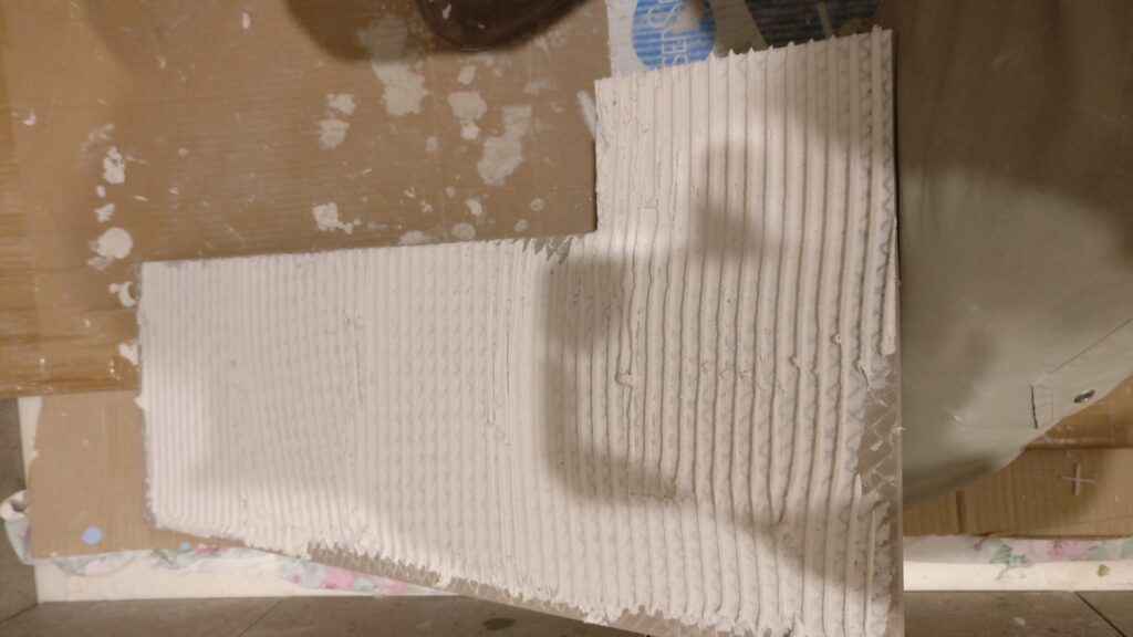 Puis le mur de gauche… Alors celui là est plus compliqué car il y a une niche à faire…. Petit focus sur comment encoller tout ça :