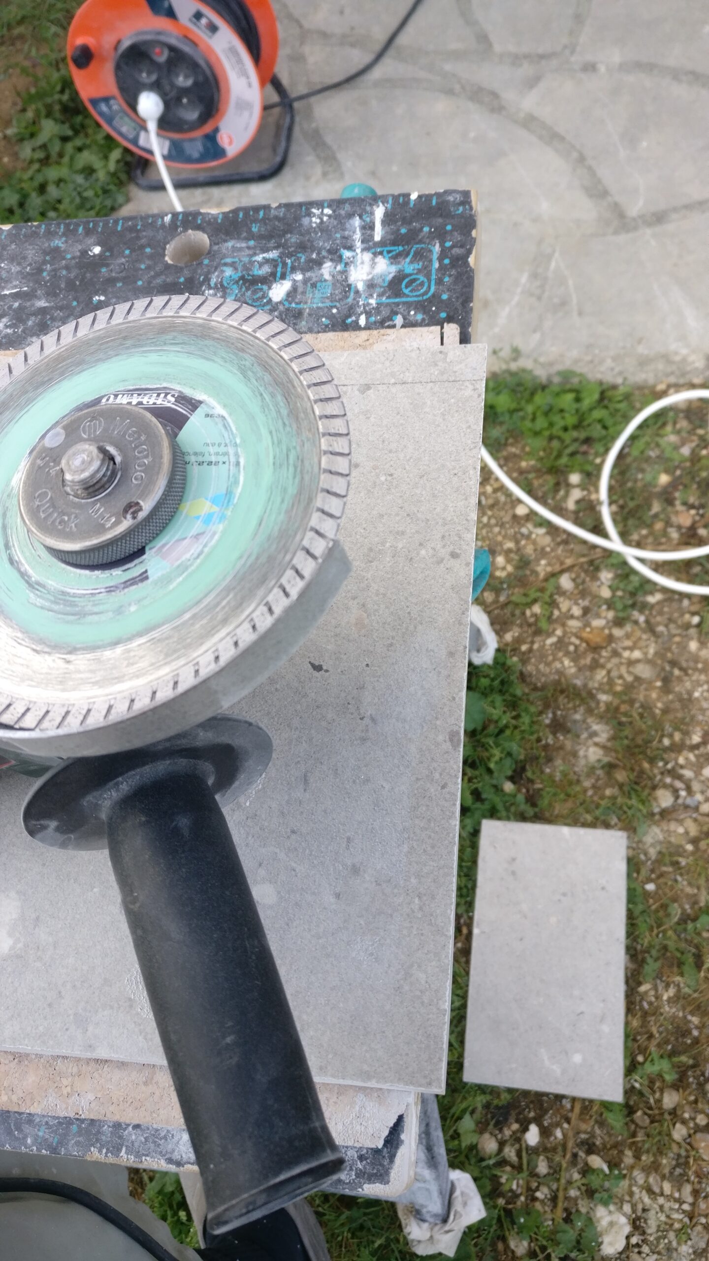 Pour la découpe des arrivées d’eau c’est assez simple. Il faut repérer l’emplacement sur le carreau en le posant à côté pour la hauteur et en dessous pour la largeur puis donner les coups de meuleuse par l’arrière. Quand la lame ressort s’arrêter. Le trou est carré mais pas grave, il sera masqué par la rosace.