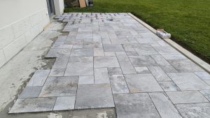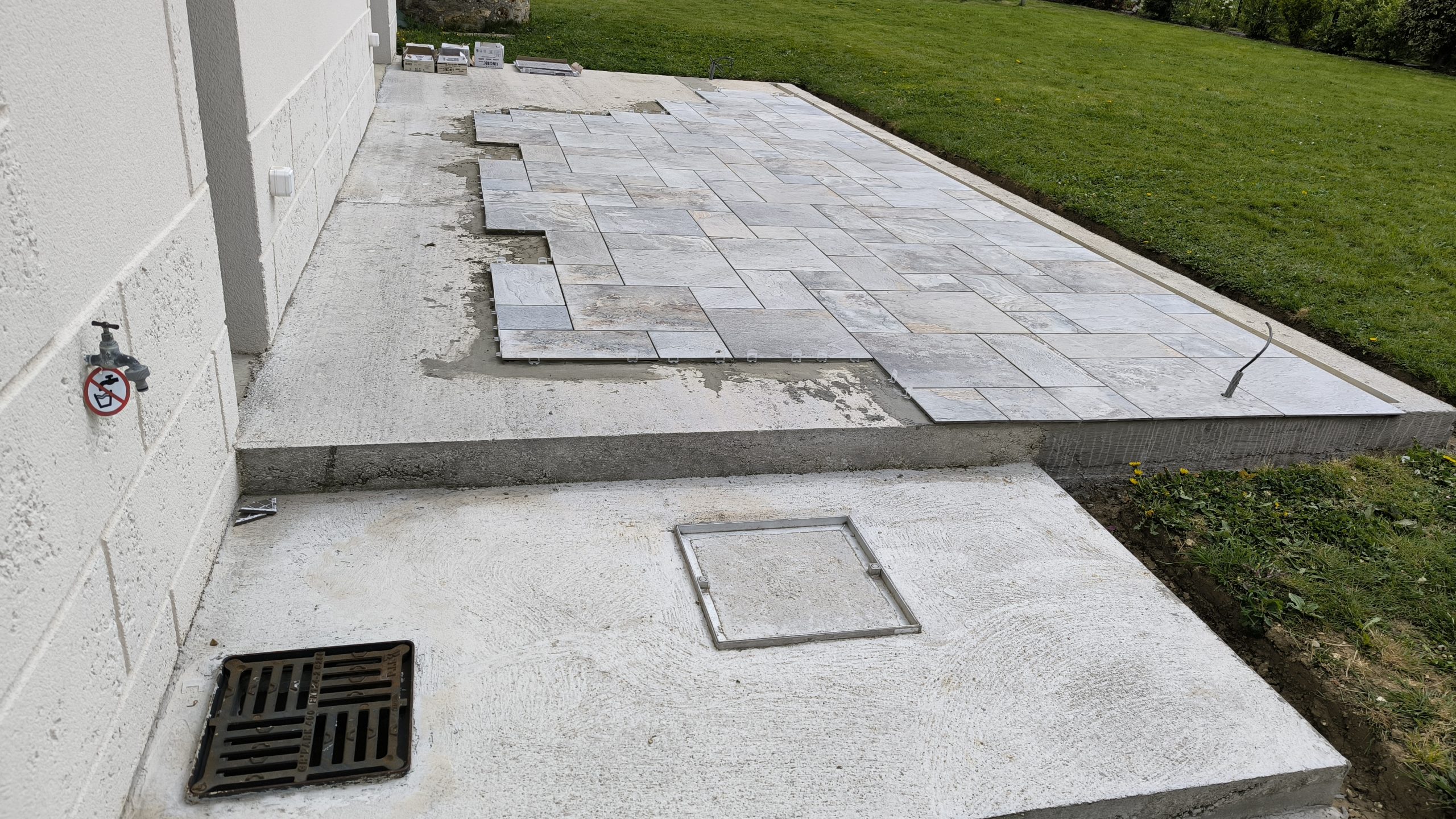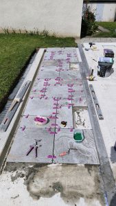 Rebelote, même chose : nettoyage de ce qui a été posé la veille, préparation de la colle et petit problème : la dalle n’est pas pile poil rectangulaire du coup on niveau du caniveau on arrive au ras d’un carreau mais au bord de la maison il y a 6cm d’écart… On décide alors de découper la dalle d’un côté et de la rallonger de l’autre :