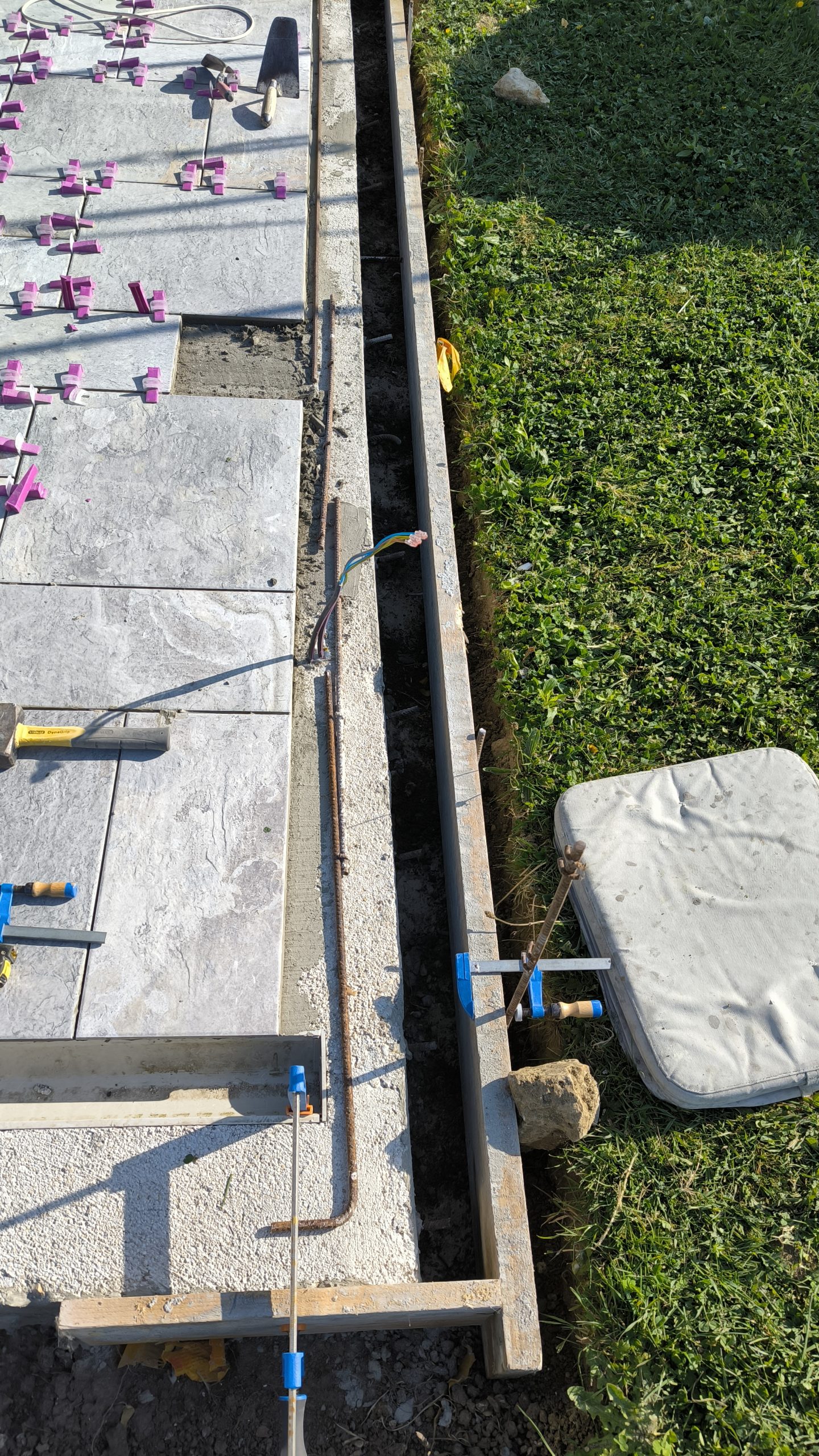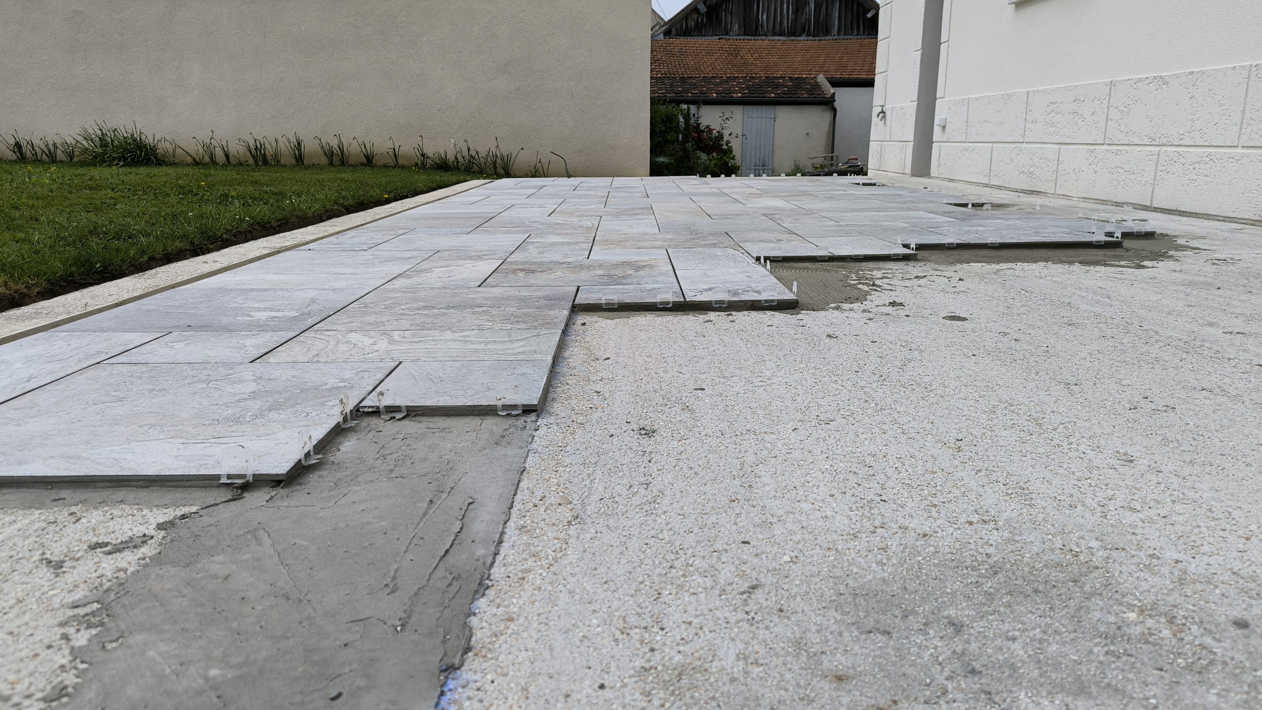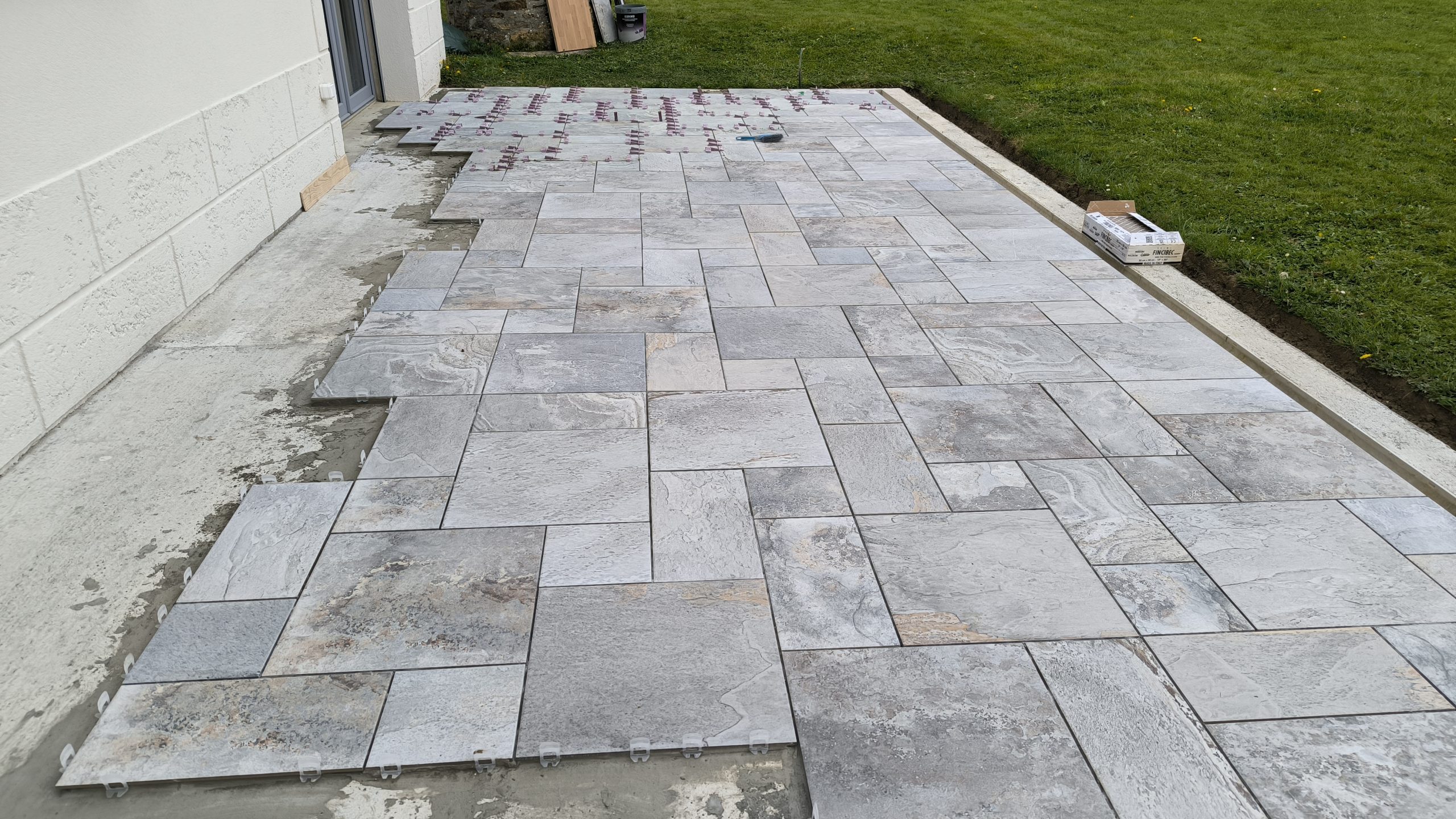 Les carreaux sont un mélange de 25cm x 25cm, de 25×50 et de 50×50. Nous avons donc fait une première ligne à 1m du caniveau et avons fixé une règle au sol pour poser la première ligne de carreau.