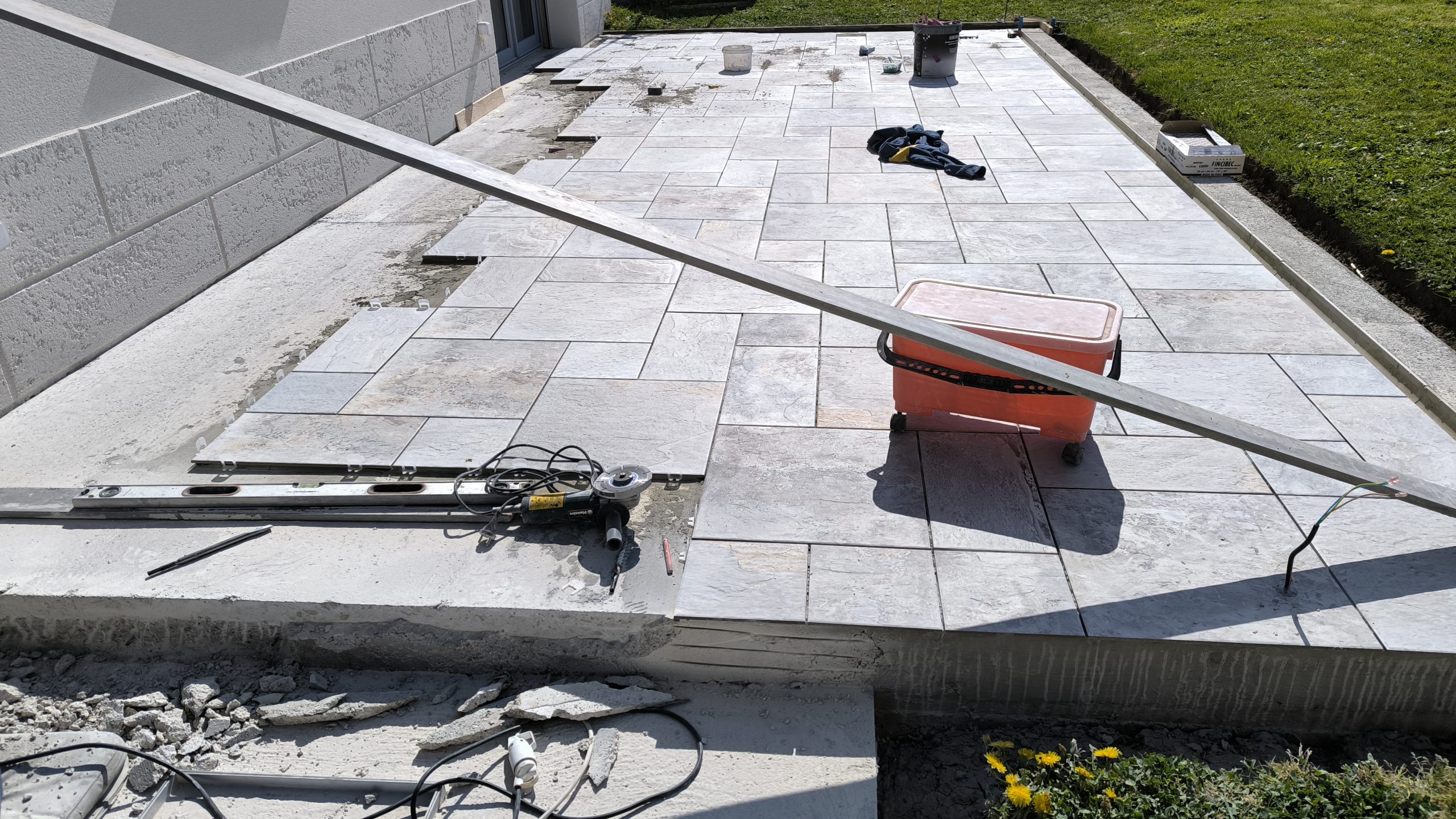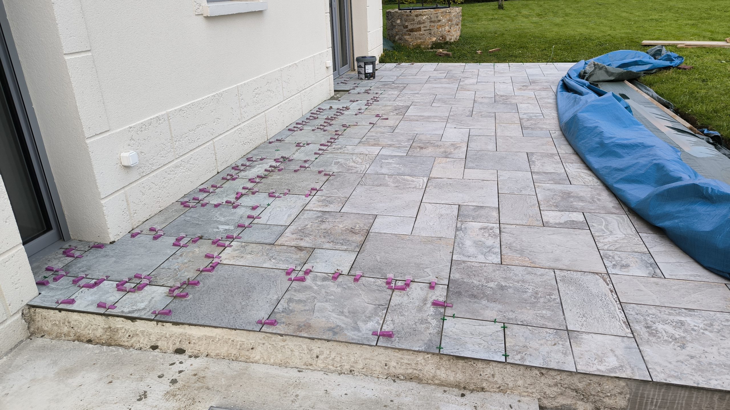 Au programme retirer toute les cales en tapant dessus puis nettoyer tous les joins au cutter … et refaire plein de colle pour coller la suite des carreaux. On a de la chance, le temps se tient.