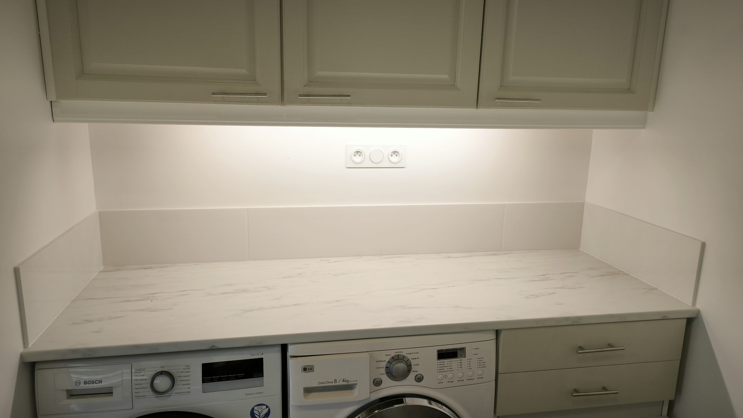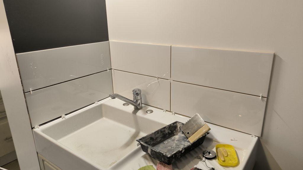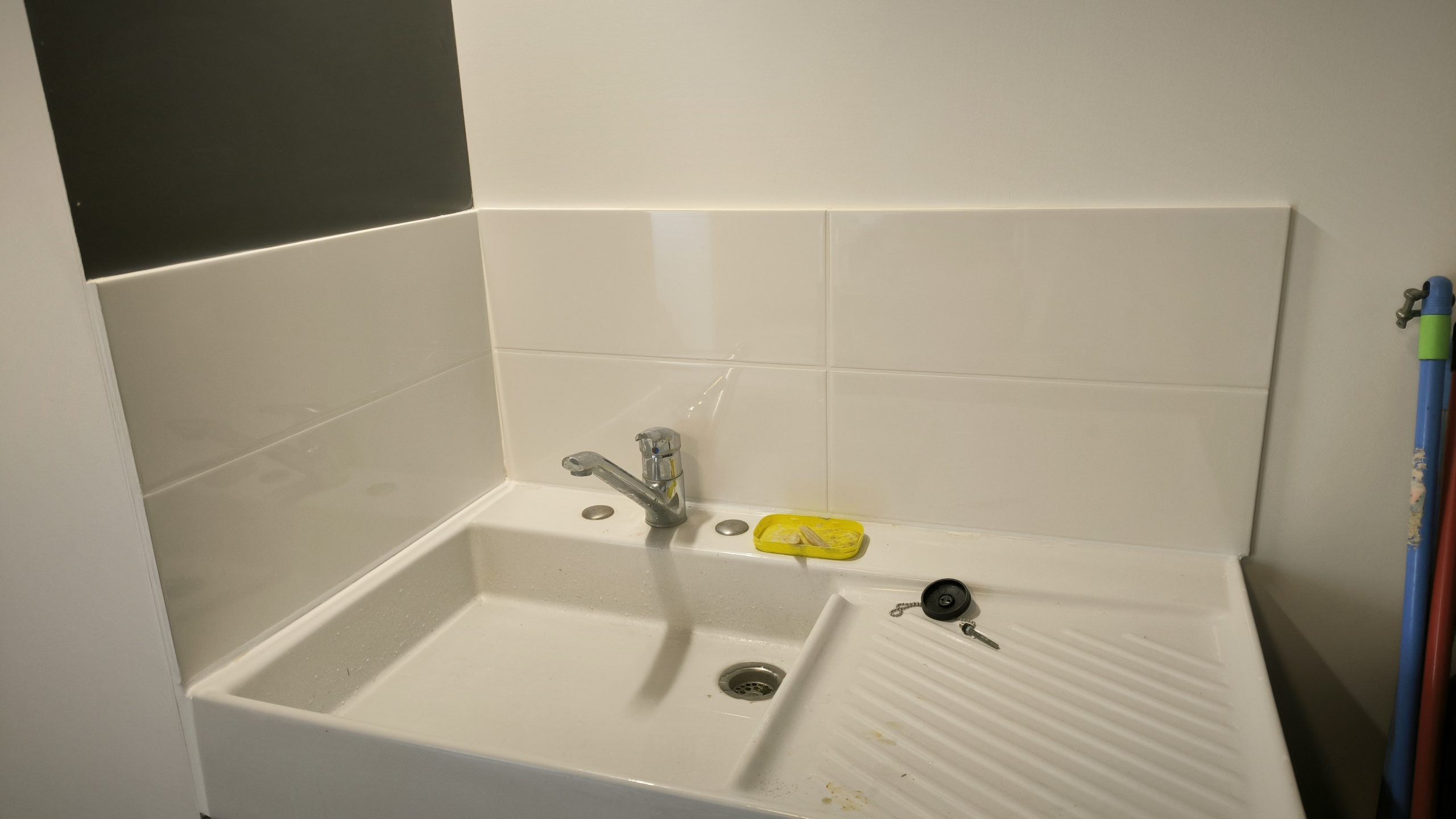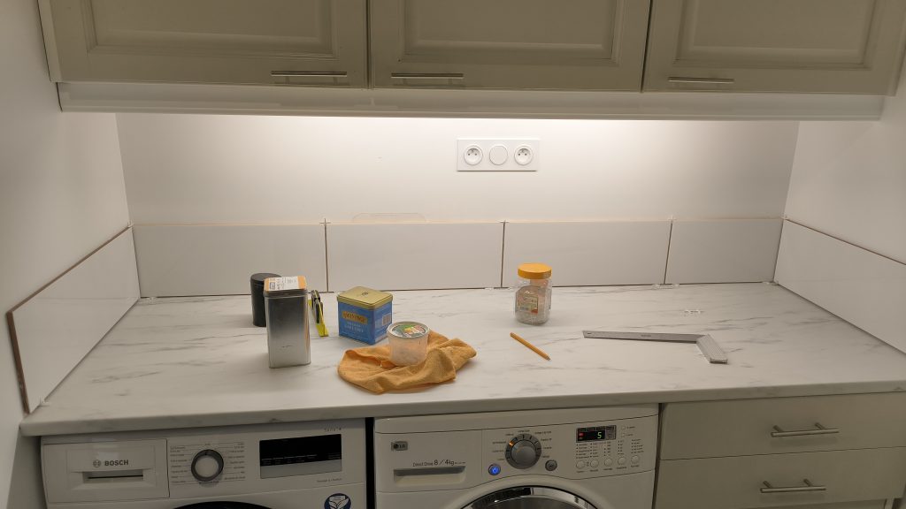 Nous sommes tombé il y a peu sur un reste de carreaux de carrelage rectangulaire blanc de 20*50. Ayant eut récemment besoin d’en poser en 20*60 blanc il m’en restait quelques carreaux. Après vérification c’est parfait, il nous reste tout juste ce qu’il faut pour faire la crédence dans le cellier… Ou plutôt les crédences car il y a celle de l’évier mais aussi celle au dessus du plan de travail des machines à laver et sécher le linge.
