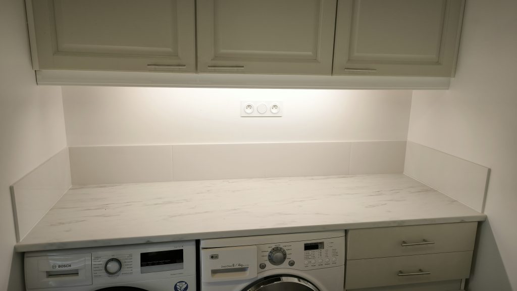 Première étape : déplacer les prises de courant. Comme d’habitude elles sont mal situées (à 20cm du plan de travail)… Elles se retrouvent en plein milieu du carreau. Je décide donc de remonter le tout franchement pour être le plus haut possible : On ne sera plus embêté par la pile de linge devant en plus !