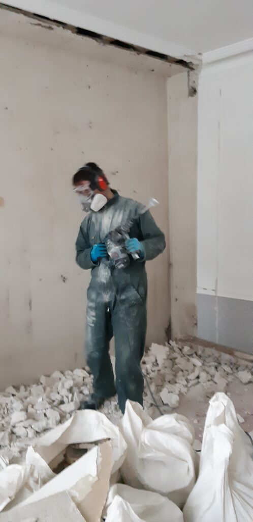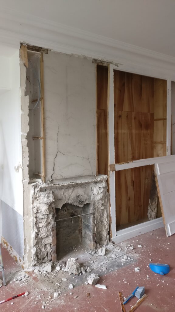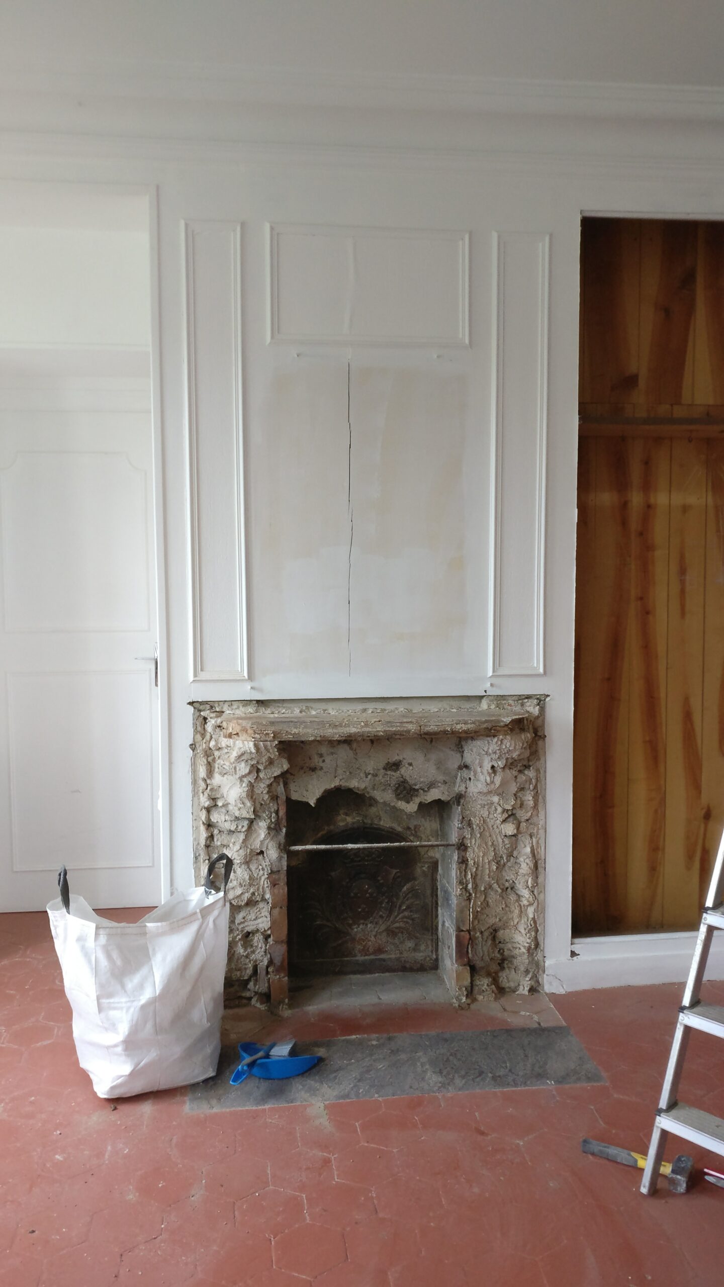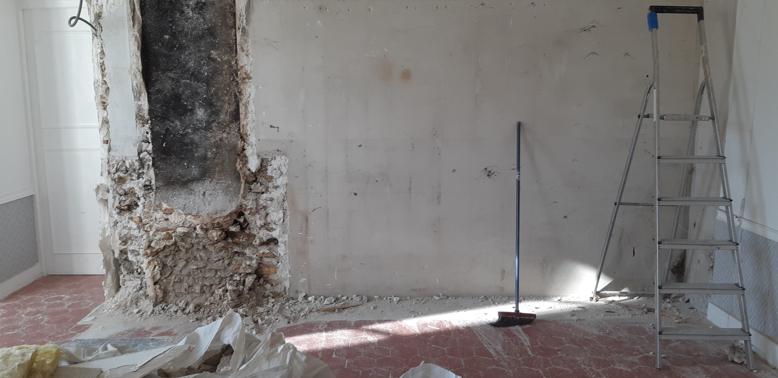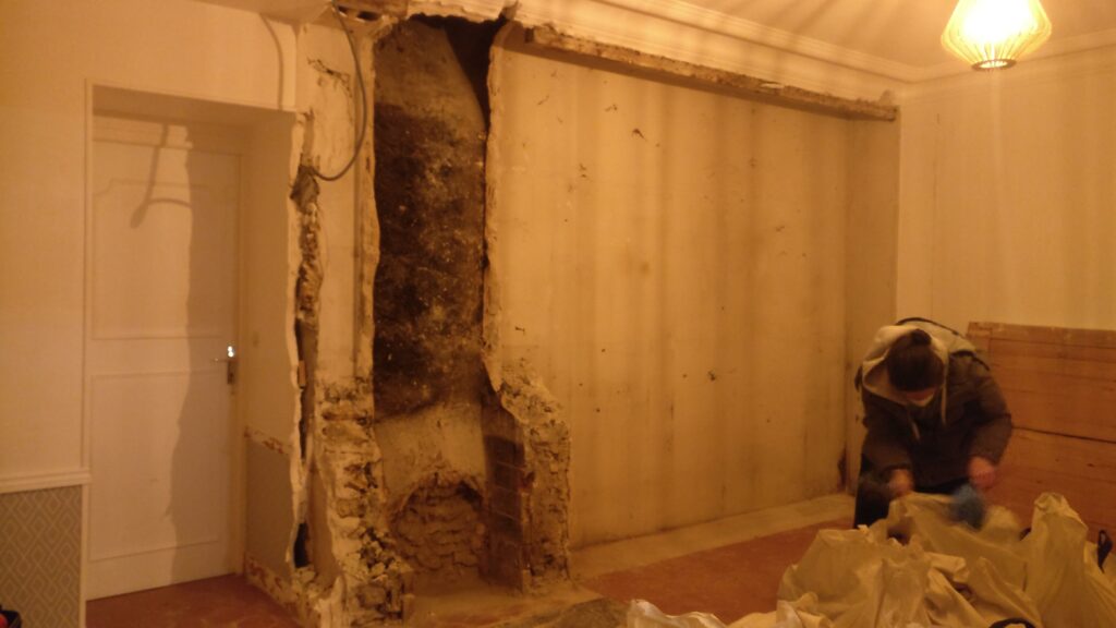 Nous entamons cette année 2021 avec la démolition de la cheminée et du placard en bois de l’ancienne chambre de la travée 2 (cf Le projet). Le conduit de la cheminée sera conservé car réutilisé pour la nouvelle cheminée entre le salon et la salle à manger.