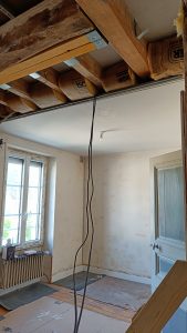 Hé oui encore de la démolition… mais ça devrait être la dernière fois. Cette démolition concerne le plafond du petit bureau, au premier étage. Le maçon avait déjà retiré un mètre de plafond pour pouvoir élargir la trémie de l’escalier.