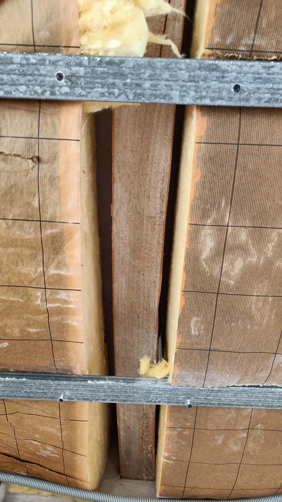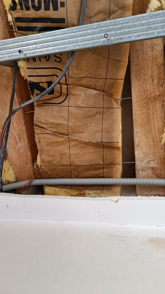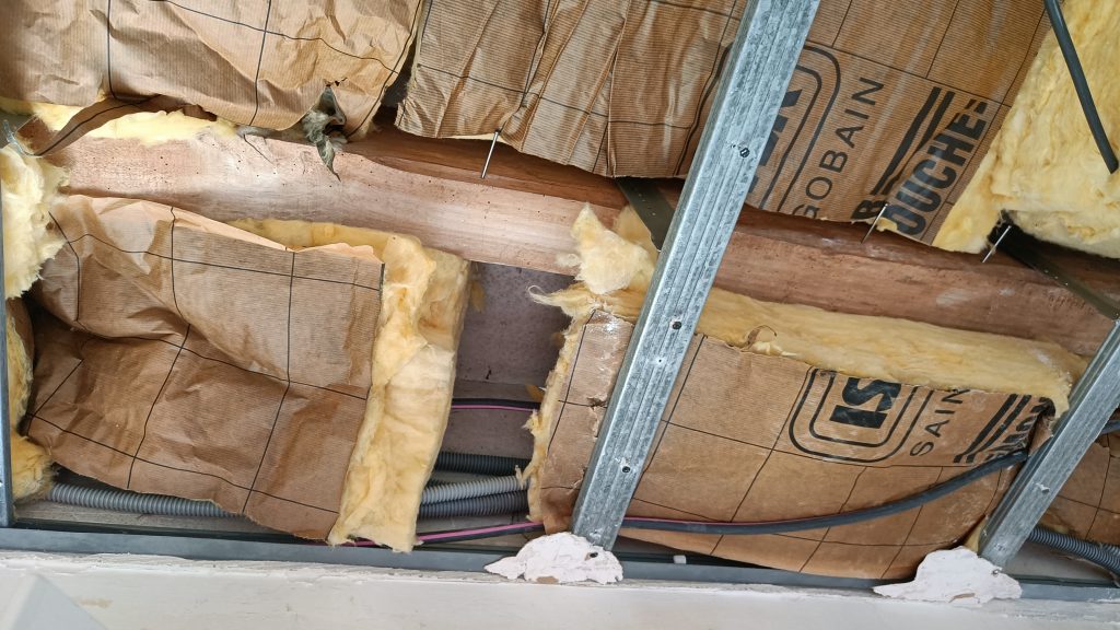 Le constat fut assez simple : alors oui y’a de la laine de verre au dessus mais comme elle ne touche pas les bords, pas sur qu’elle servent beaucoup. En plus l’électricien a fait 3 trappes dedans pour placer ses cables donc le plafond est a reprendre. Vu la surface, le refaire et isoler correctement ne demande pas beaucoup plus d’effort.