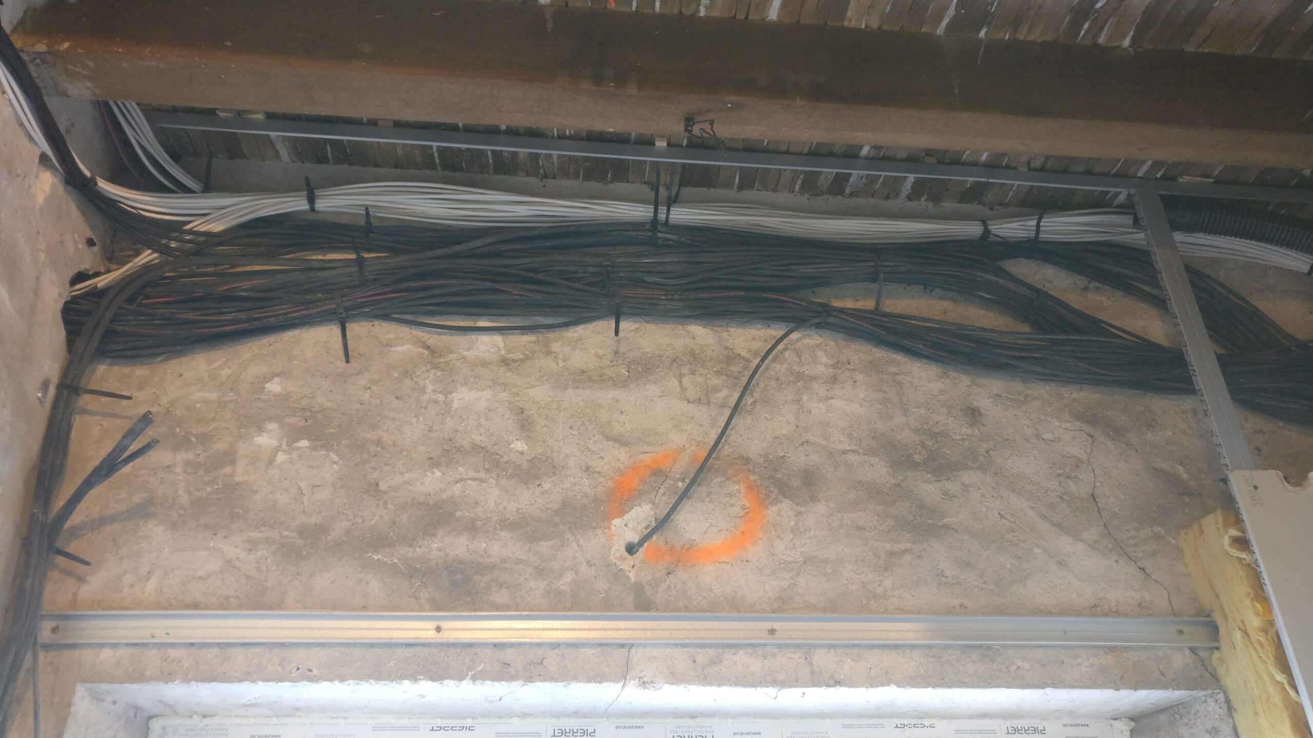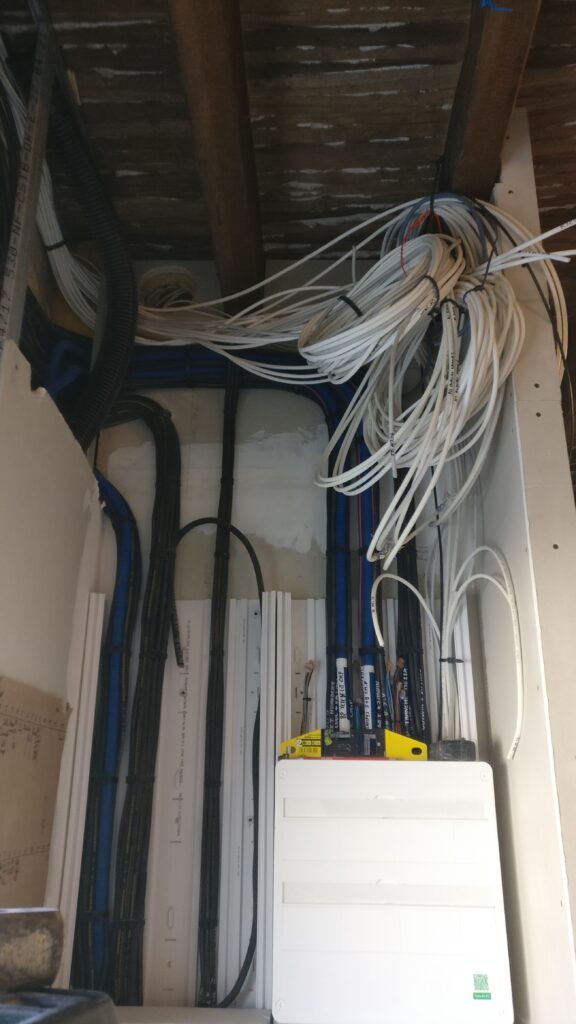 Côté cellier je ressors tout ce qui est cable réseau et je fixe certains cable élec… ça en fait du monde. En fait je voulais tout plaquer mais je vais encore attendre un peu car il me manque certains cable dont le cable d’antenne TV… et je ne peux plus monter dans le grenier.. ça va attendre cet hiver je pense.