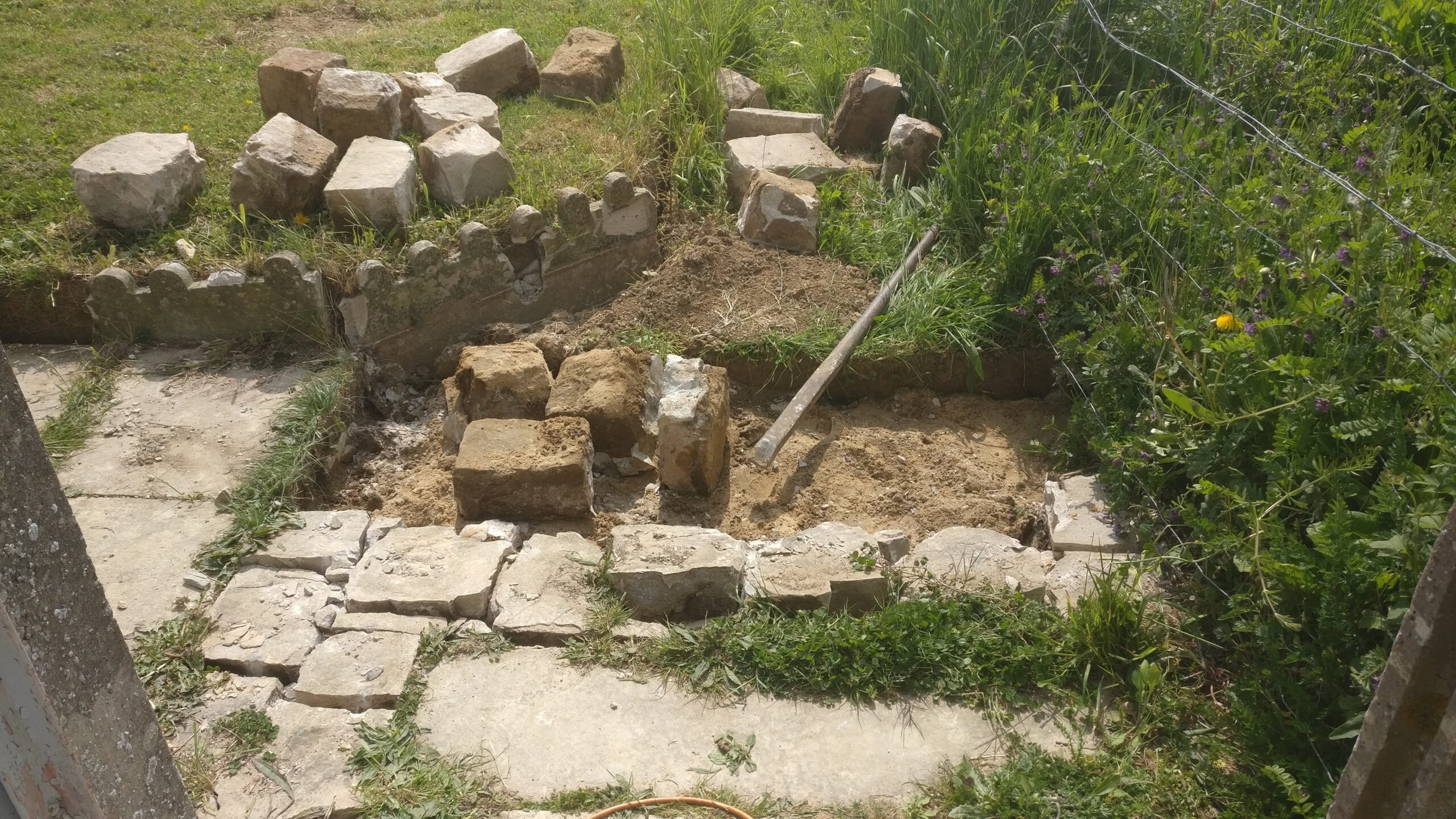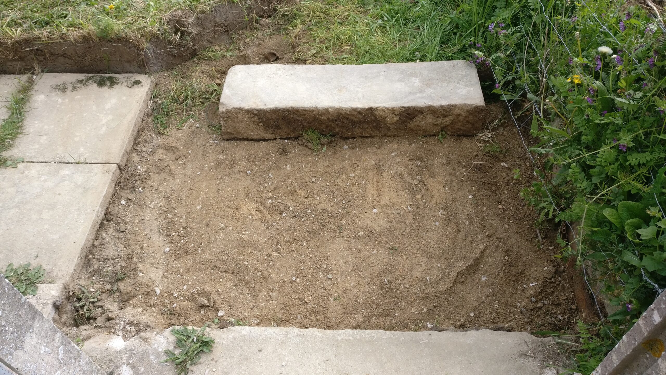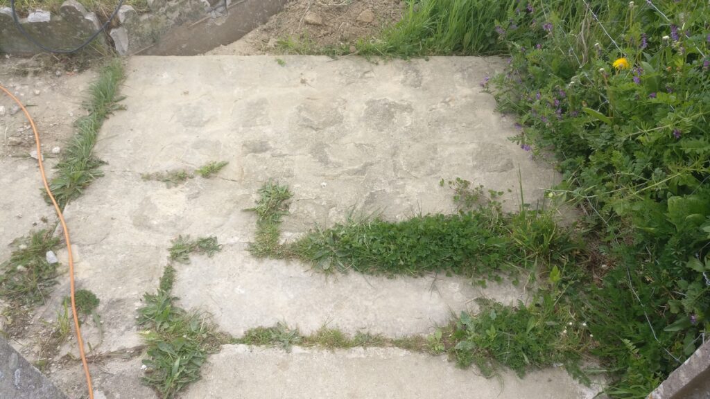 Côté jardin c’est retrait des pierres et autres cailloux partout dans la pelouse, tonte de la dite pelouse, montage du portique que mon fils à reçu pour son anniversaire fin mars et démolition de l’ancienne dalle béton/pavée d’entrée dans le jardin