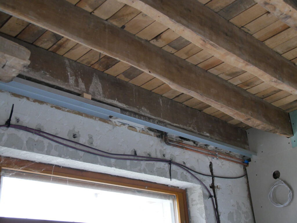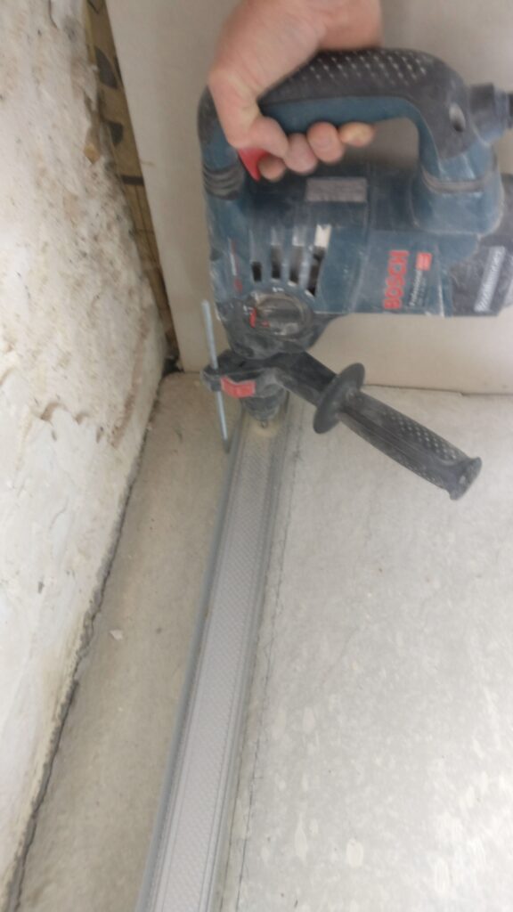 Le maçon a commencé l’isolation de l’escalier avec des montants de 100mm.. j’ai du 45mm. Ce n’est pas gênant il suffit de mettre l’un dans l’autre. Petit moment de stress par contre pour fixer le rail dans le sol, au moment de percer… normalement il n’y a pas de plancher chauffant à cet endroit ! sinon piscine 🙁 ouf. c’est passé.