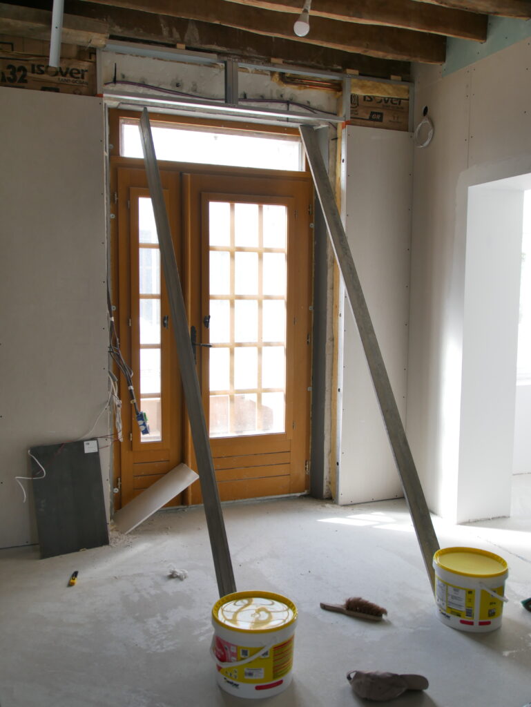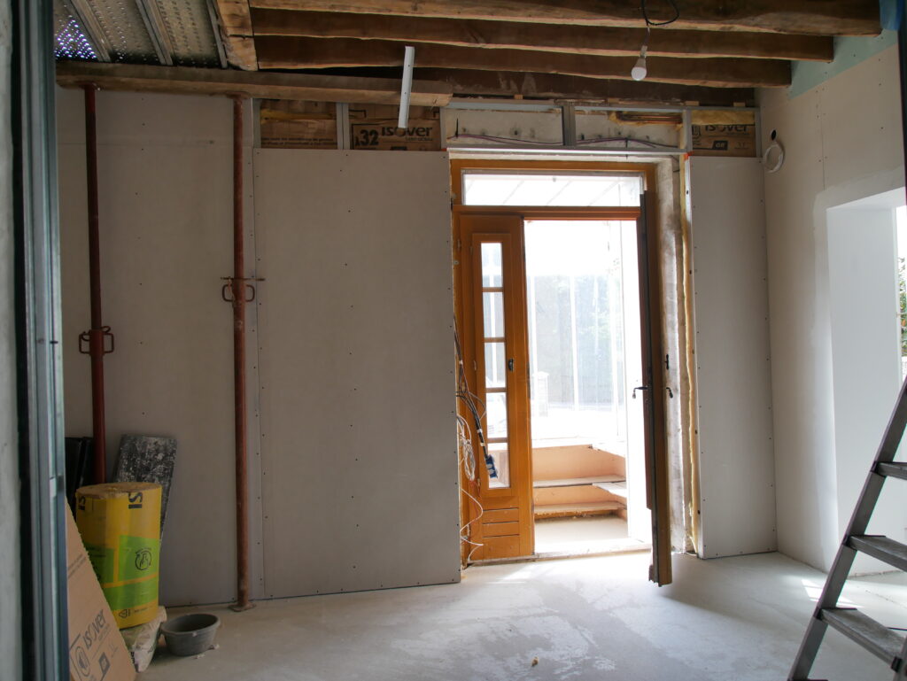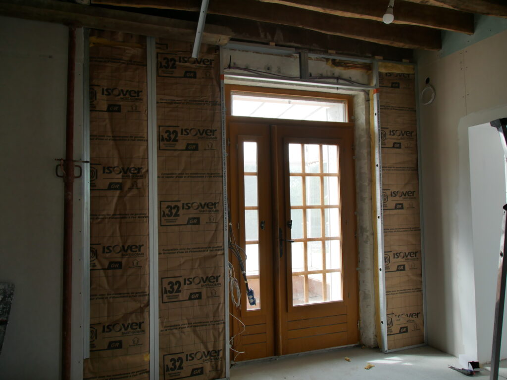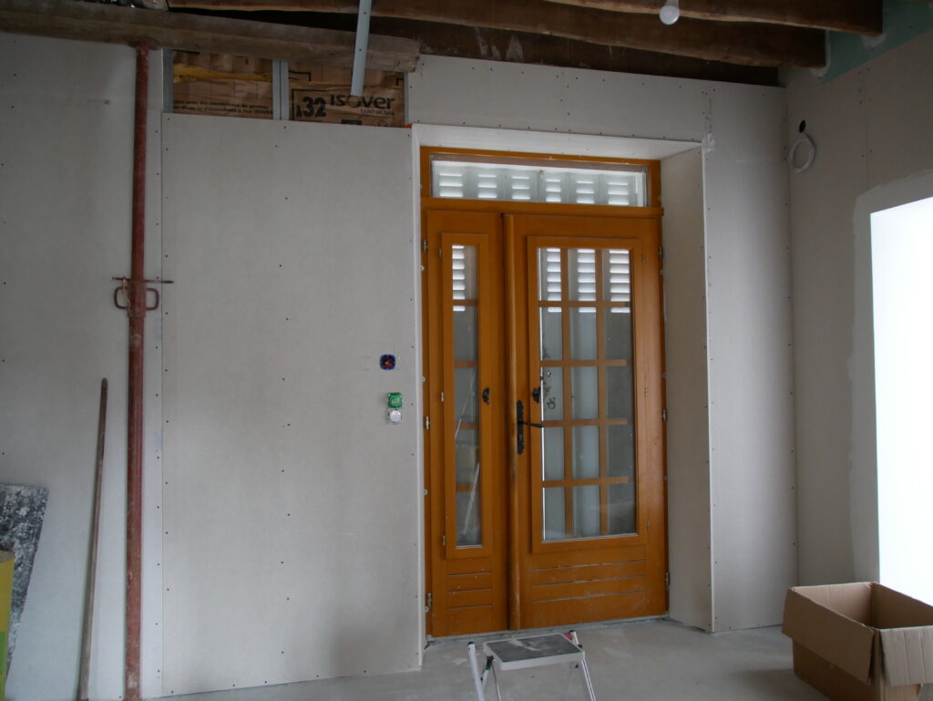 Toujours dans l’optique d’avancer au max tout ce qui touche le sol, je reprends le placo et je m’attèle à tout ce qui est encadrement. Il m’en reste 3 à faire : la porte d’entrée et les deux fenêtres du salon que nous verrons dans un autre article.