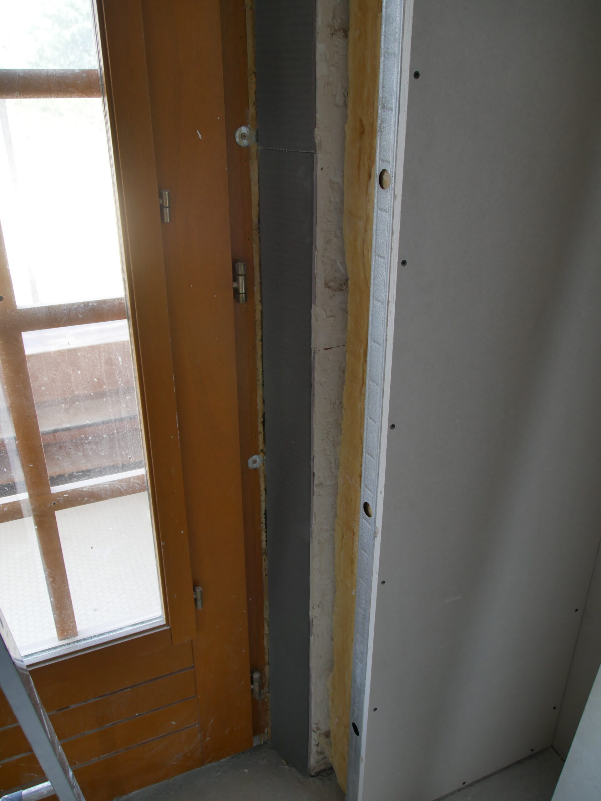 Pose ensuite de l’isolant sur le mur. Pour l’encadrement de la porte c’est un peu différent des autres. Je n’ai pas la place d’y mettre du placo avec du polystyrène (10+20). J’ai donc fixé une plaque de wedi au mur et par dessus collé le placo. J’ai du coup une couche totalement étanche entre le placo et le mur ce qui va m’éviter les remontées d’humidité par la colle.