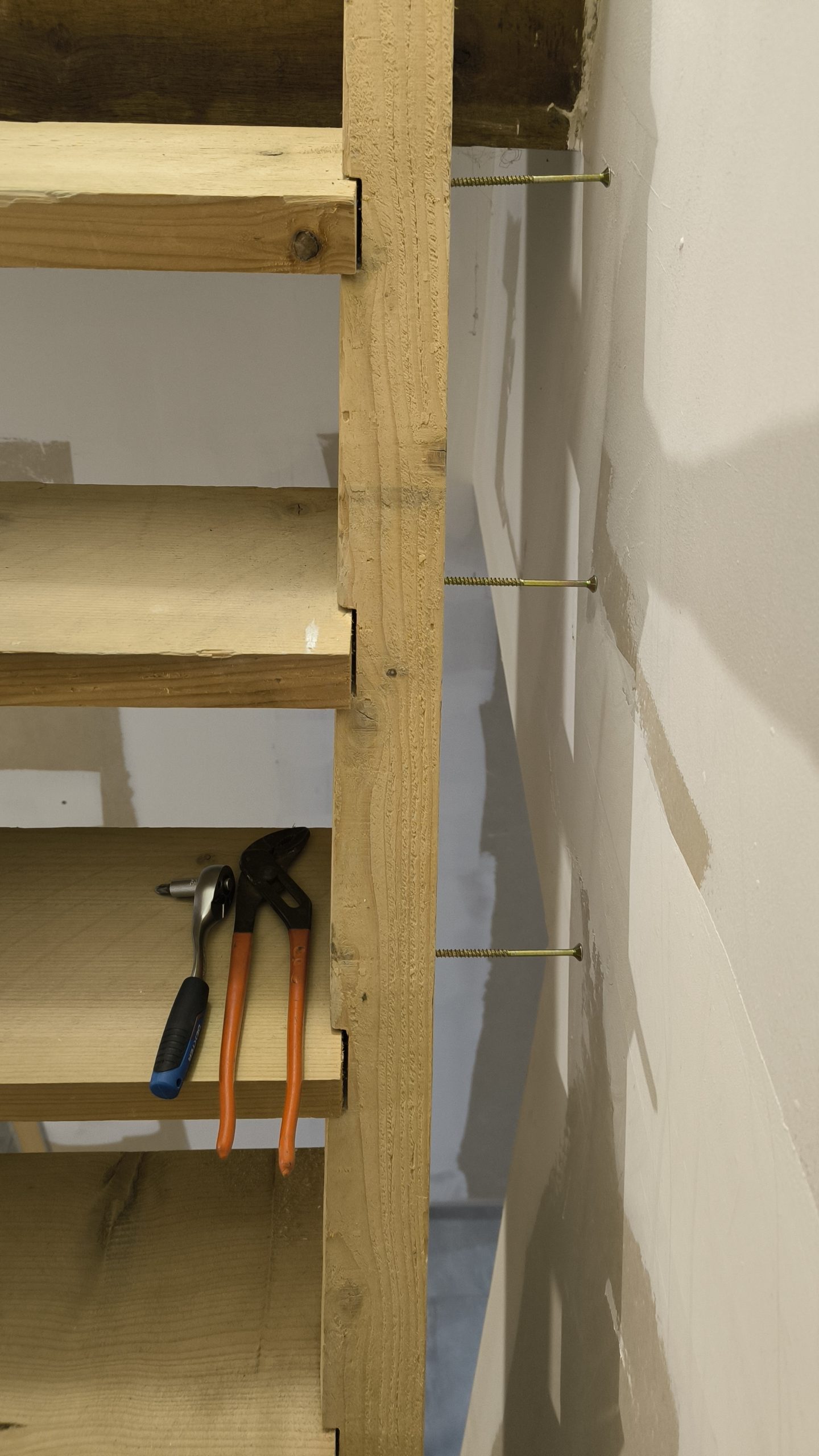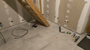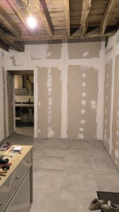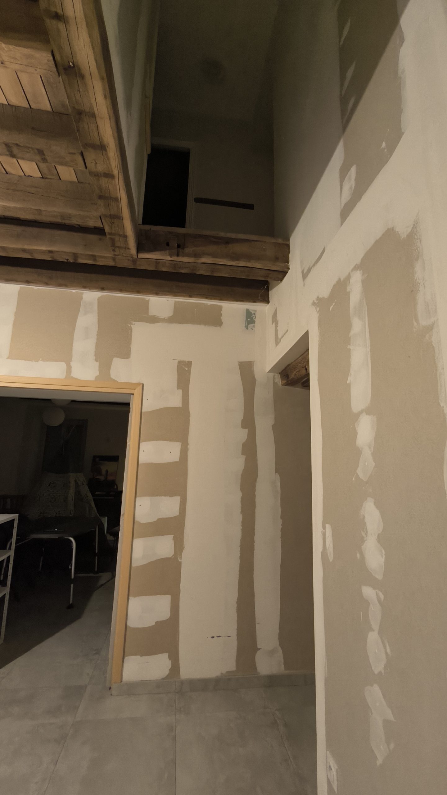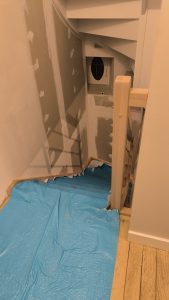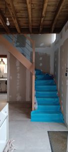 Vient ensuite le rebouchage avec de l’enduit des trous et le démontage de l’escalier (merci les vis de 120mm dans les marches que j’ai galéré à retirer (autant qu’à les mettre à la réflexion….).