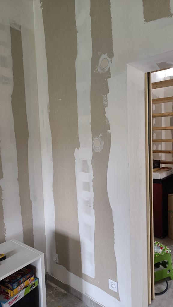 Première étape : Déplacer l’arrivée électrique que nous avions prévue pour faire un éclairage de porte. Au final je vais faire une prise commandée derrière la tv afin de pouvoir y mettre un éclairage d’ambiance.