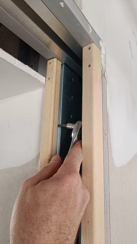 Le principe est de faire la jonction entre le placo et le coffre métallique de la porte avec un ensemble de baguette en bois. Afin de pouvoir mettre les portes (que nous n’avons toujours pas choisies) et pouvoir ajuster les réglages, une partie devra pouvoir être démontable.