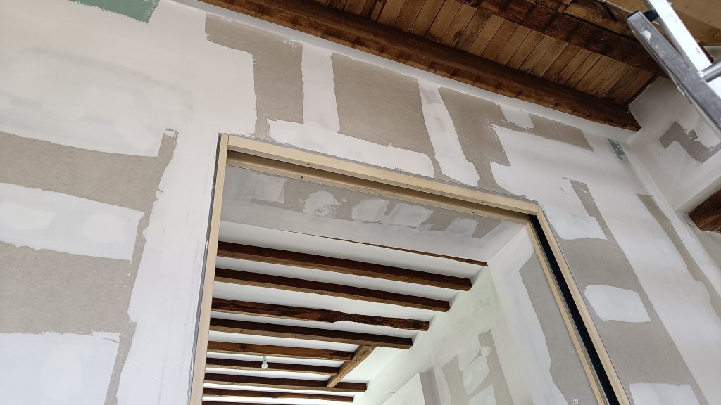 Retour dans le salon et l’entrée où je m’attaque depuis quelques jours à poser l’habillage de la double porte à galandage.