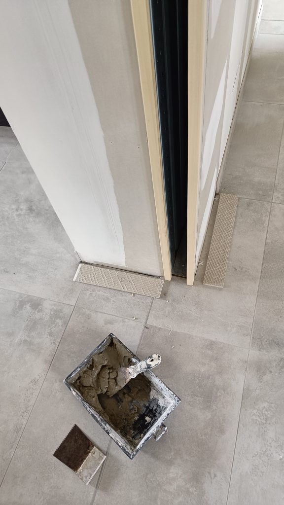 Quatrième étape : Façonnage et collage des plinthes de carrelage manquantes.
