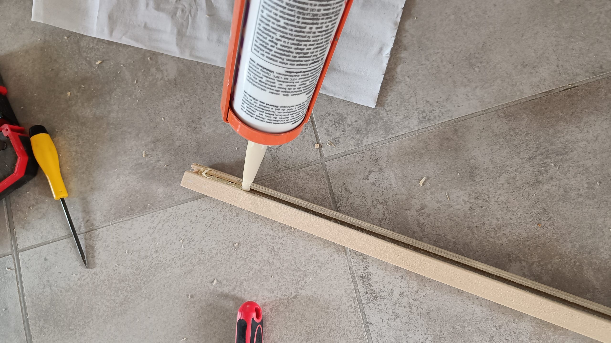 Seconde étape : coller/visser les baguettes verticales. Je découpe les baguettes à la bonne taille puis, à l’aide de mastic colle, je les fixe à leur emplacement. Je vis le tout avec de la petite vis 2×25 que j’avais en stock.