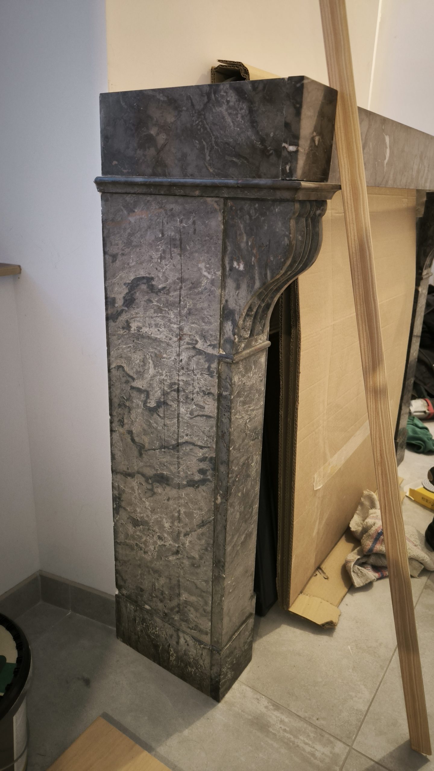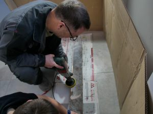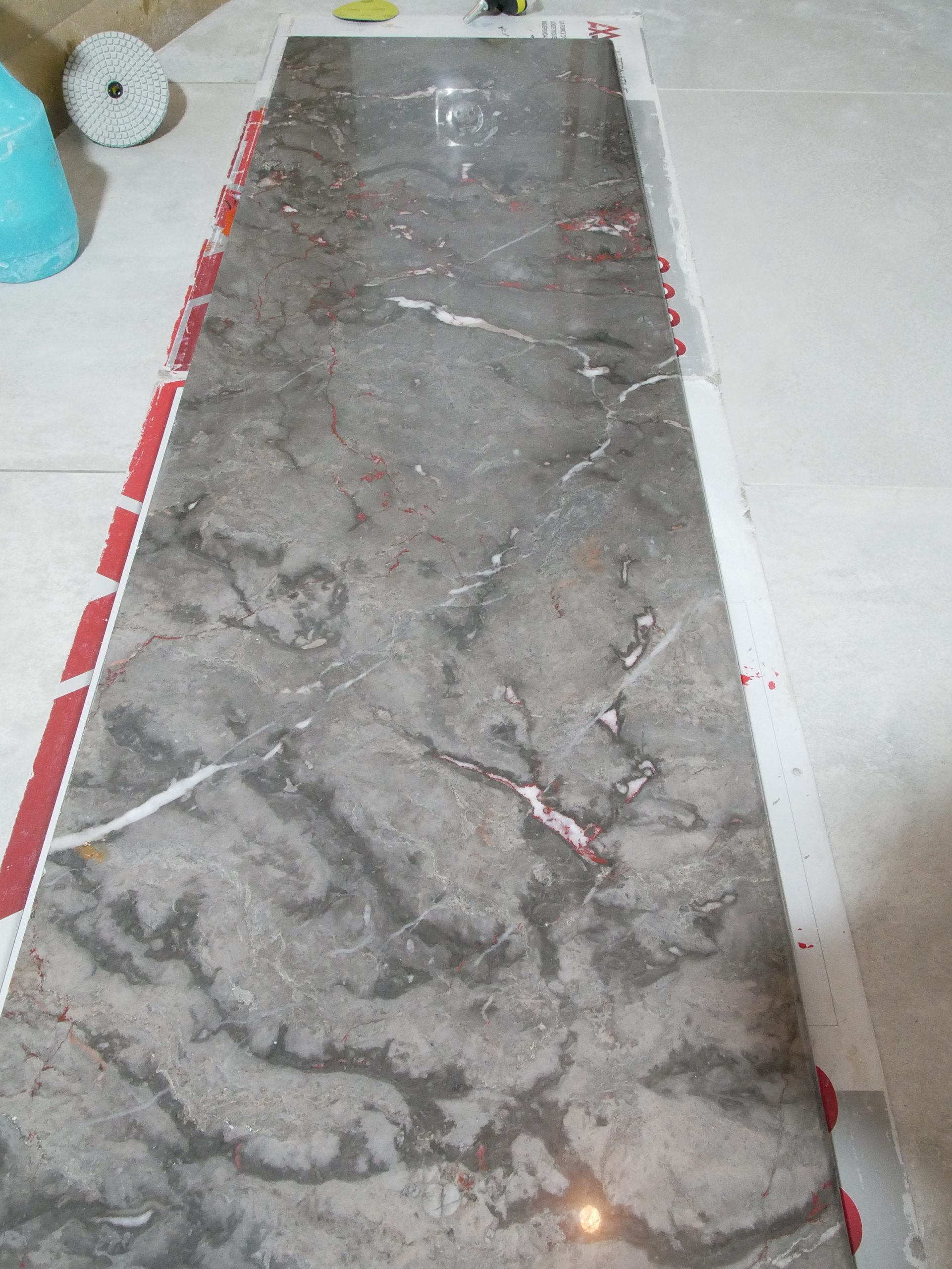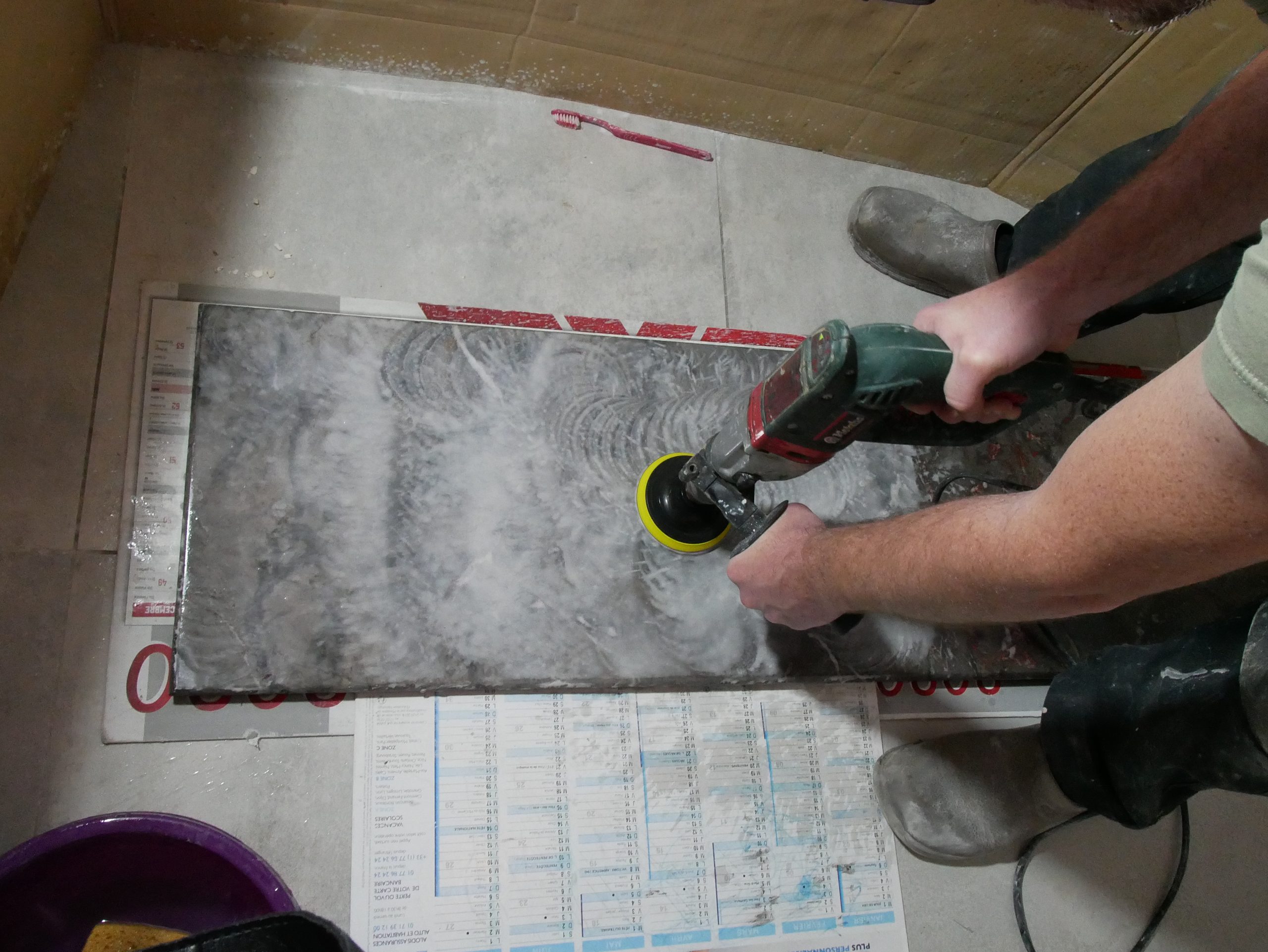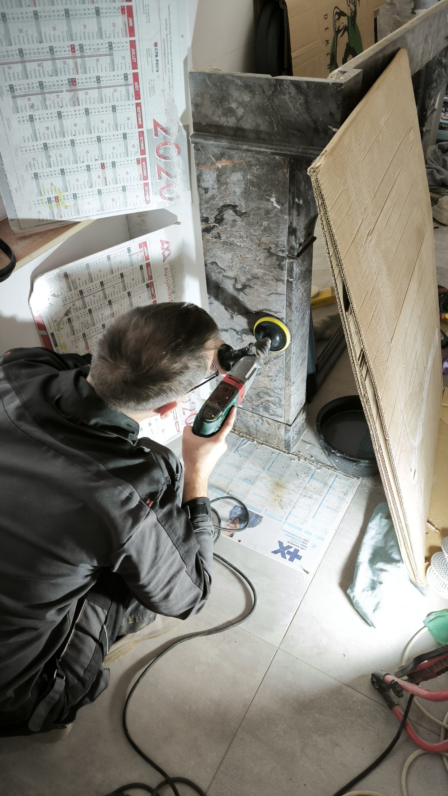 Étape suivante : Remise en état des marbres. Simple mais long : ponçage, ponçage et ponçage (à l’eau). Du grain 400 au grain 10 000.