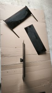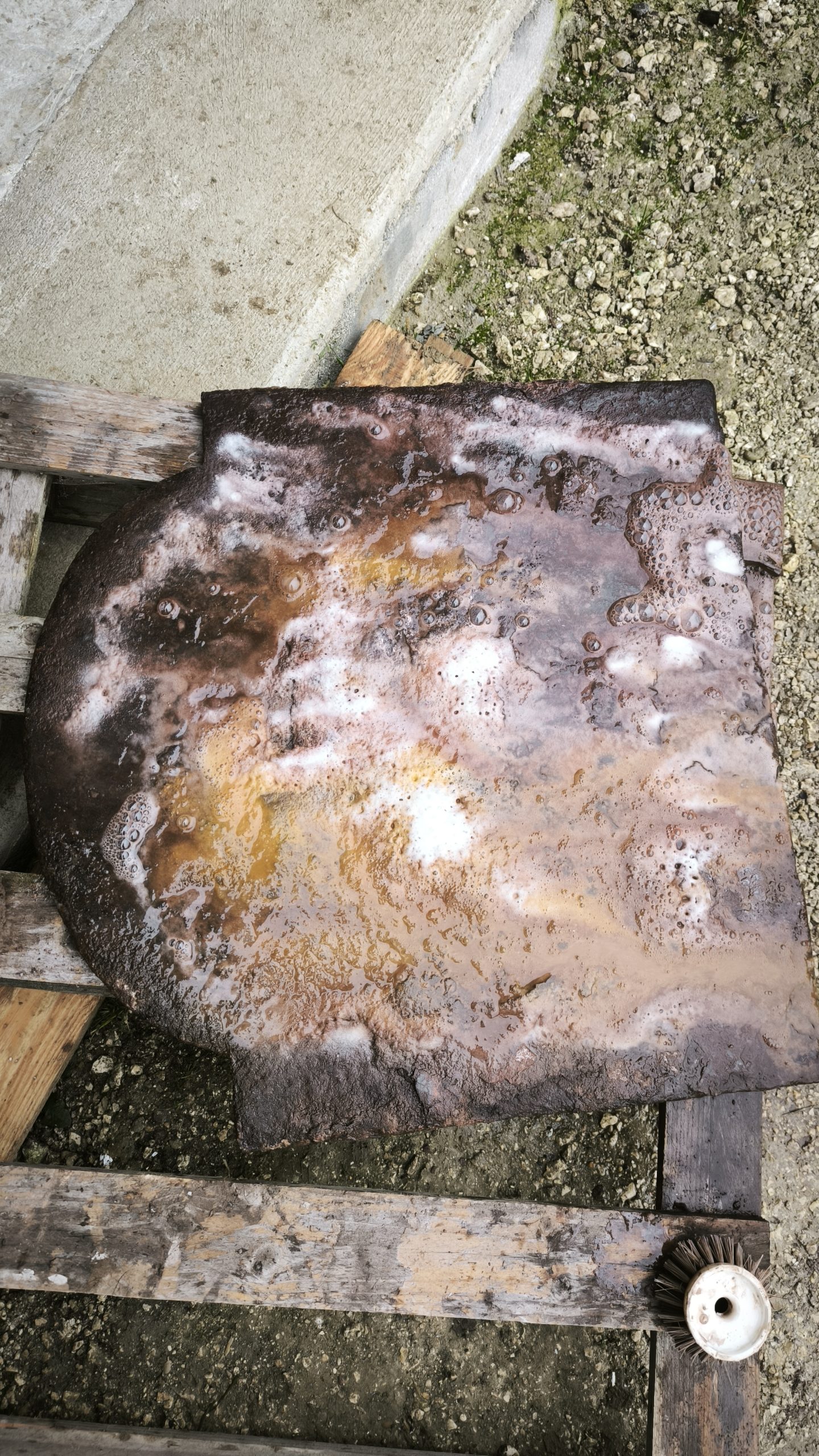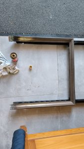 Étape suivante le cadre métallique avec le rideau qui, je dois l’avouer, est plus que bouffé par la rouille. Décapage, peinture pour ce qui était déjà peint et Mirror® pour la partie brillante. J’ai utilisé un mélange bicabornate / vinaigre pour nettoyer en profondeur.
