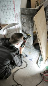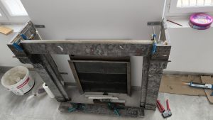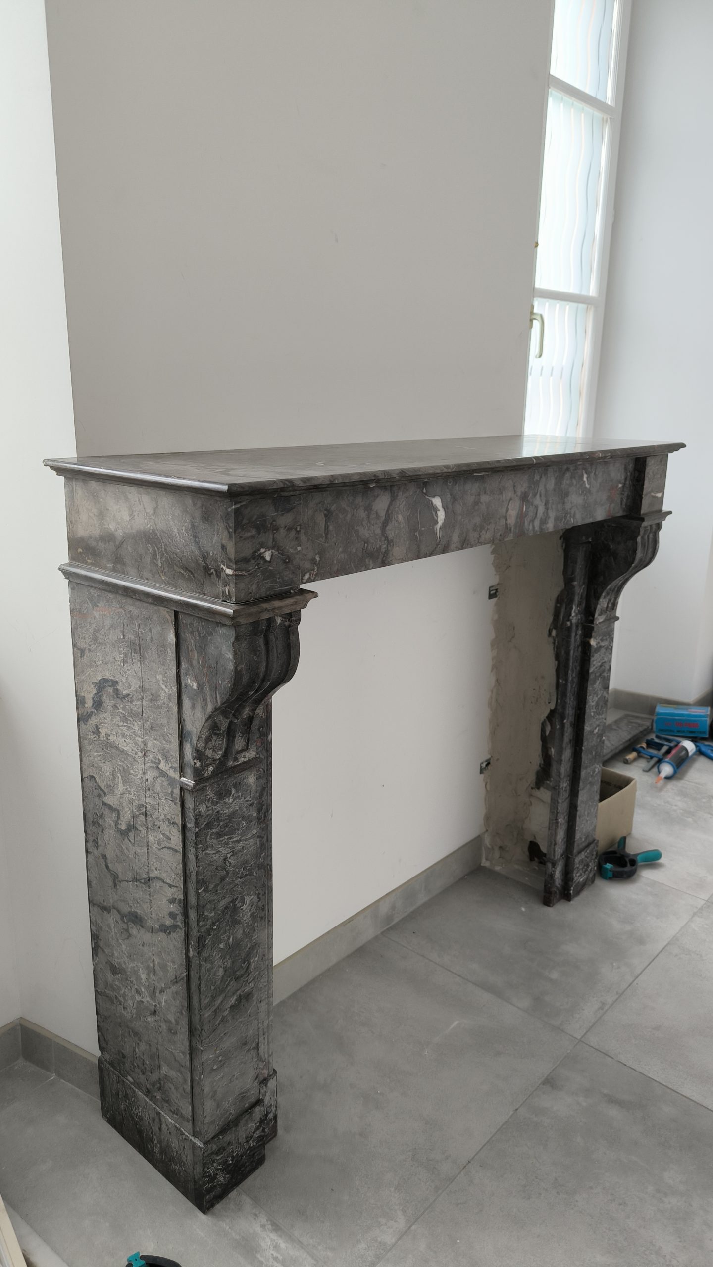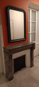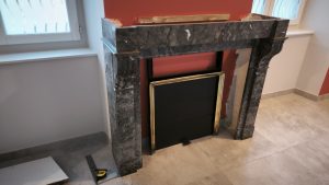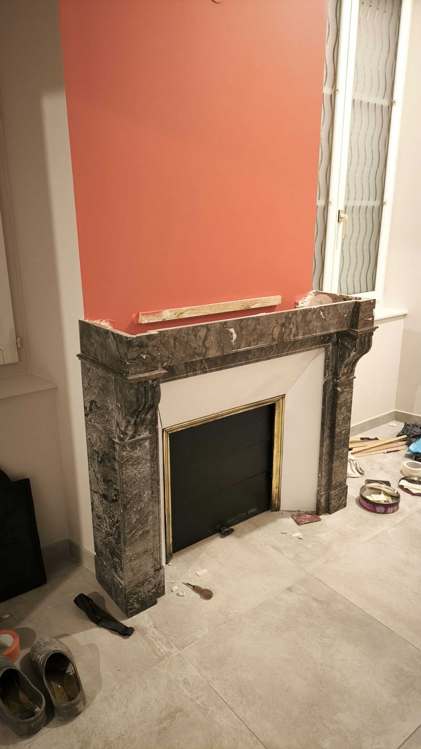 Eh non, en effet, rien de tout ça. Dans la pièce qui est maintenant le salon il y avait une ancienne cheminée type « parisienne » en marbre. A la place de cette cheminée il y a maintenant un foyer double face entre le salon et la salle à manger. J’ai démonté la cheminée en 2021 sans la casser. Elle est restée en pièces détachées tout ce temps et nous avons décidé de la reconstruire dans le couloir du bas « pour décoration ». Donc directement sur le mur sans rien derrière.