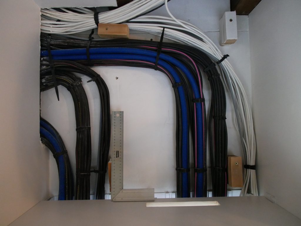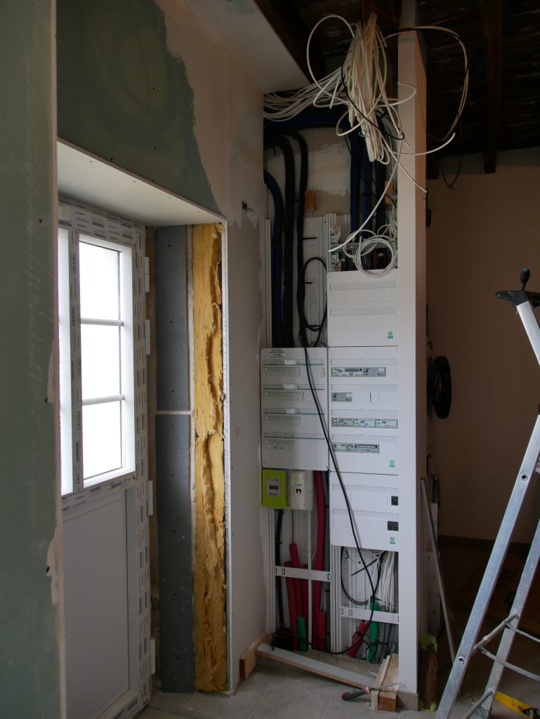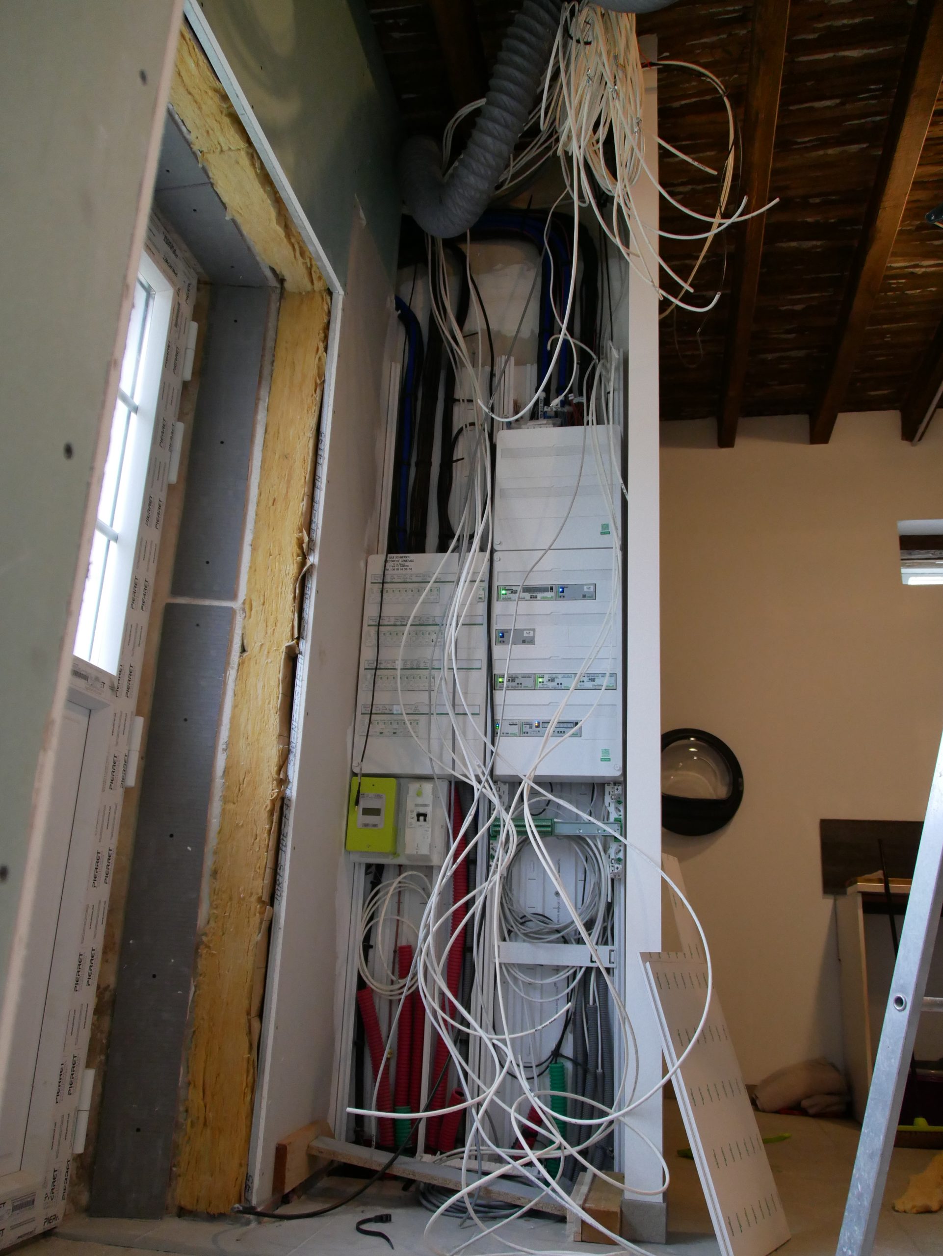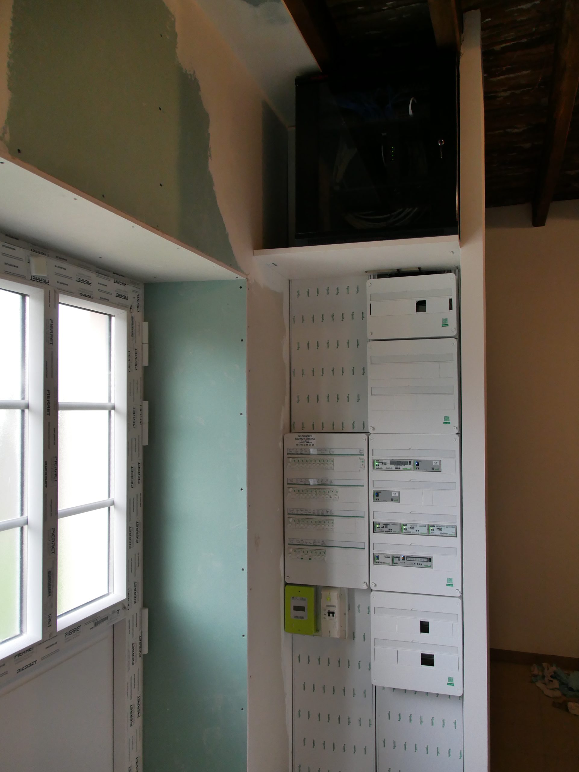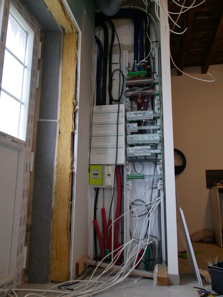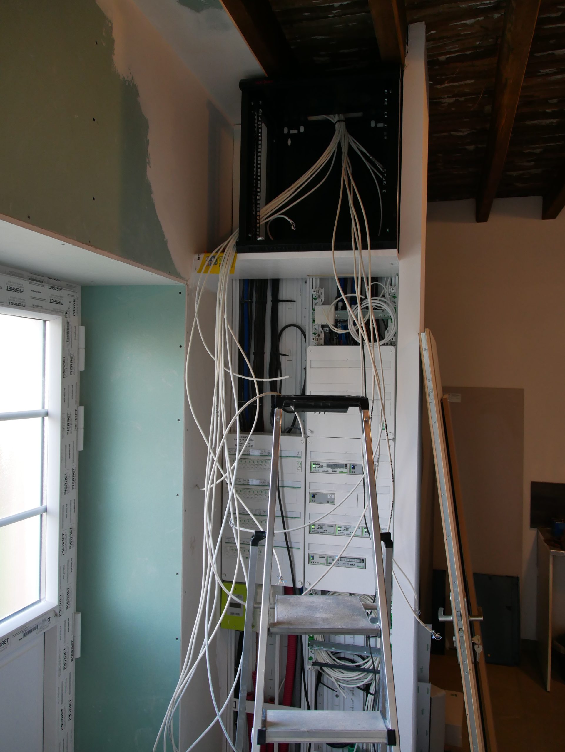 Bon le placo c’est fait, maintenant il faut que range un peu les câbles… tout ce qui est réseau informatique va rester en haut pour aller dans la baie. tout ce qui est câble « RL », c’est à dire pour des interrupteurs, des capteurs de températures ou autre va en bas du tableau.