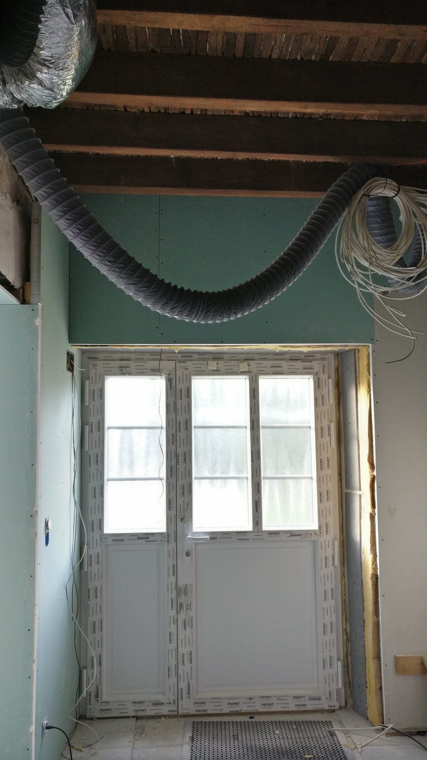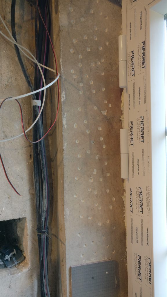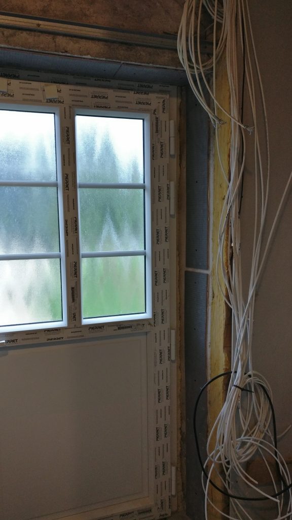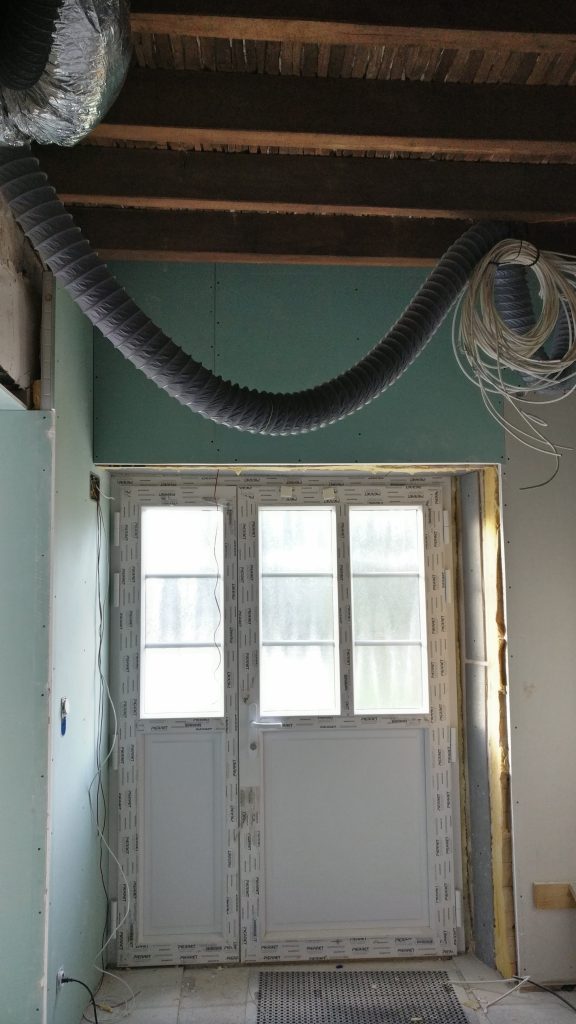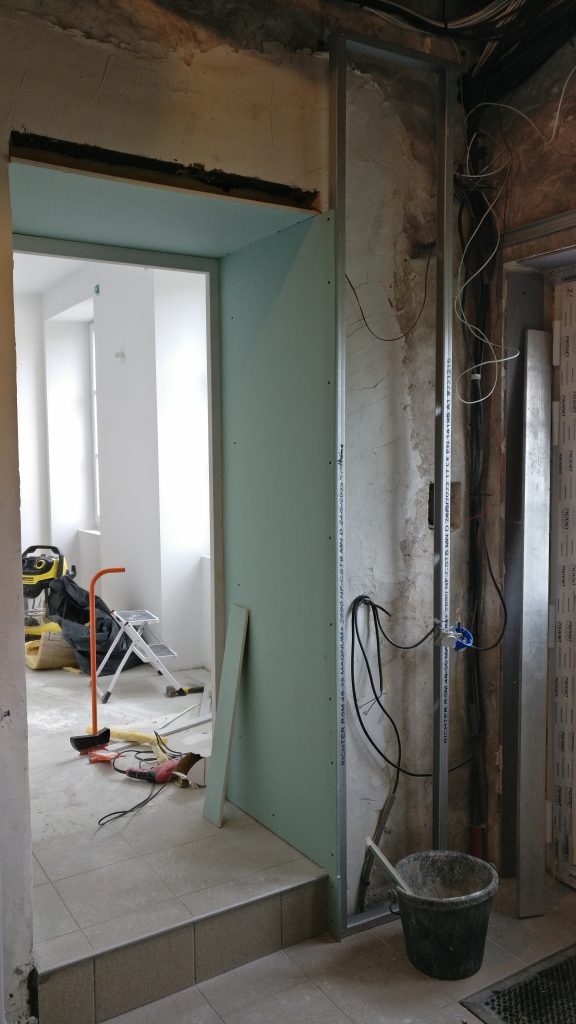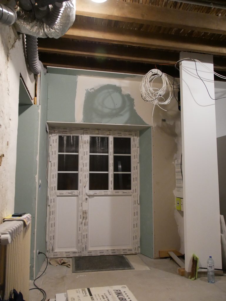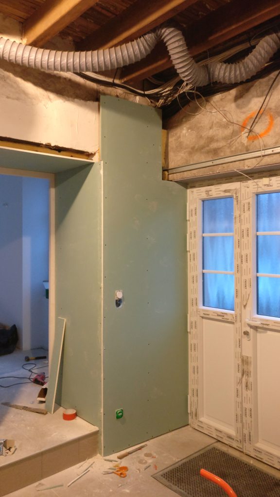 Pendant que le carrelage se posait tout seul dans le salon, l’entrée et le couloir, je me suis occupé de poser la baie informatique dans le cellier… mais pour le faire il faut je finisse de poser le placo autour de la porte d’entrée et que je fasse un peu de nettoyage dans les câbles réseaux.