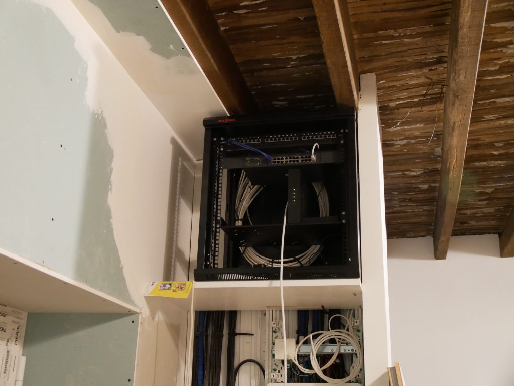 Globalement c’est fini… en haut de la baie j’ai fixé un patch panel avec les 17 câbles Ethernet cat6A SSTP raccordés (5h de boulot, 8 fils par câble à dénuder), en dessus un peigne pour cacher les câbles et en dessus un switch administrable 24 ports. A l’étage en dessous on retrouve la box et l’ONT (pour la fibre). J’ai déplacé le boitier fibre tout en haut du tableau domotique ainsi que l’antenne hertzienne.