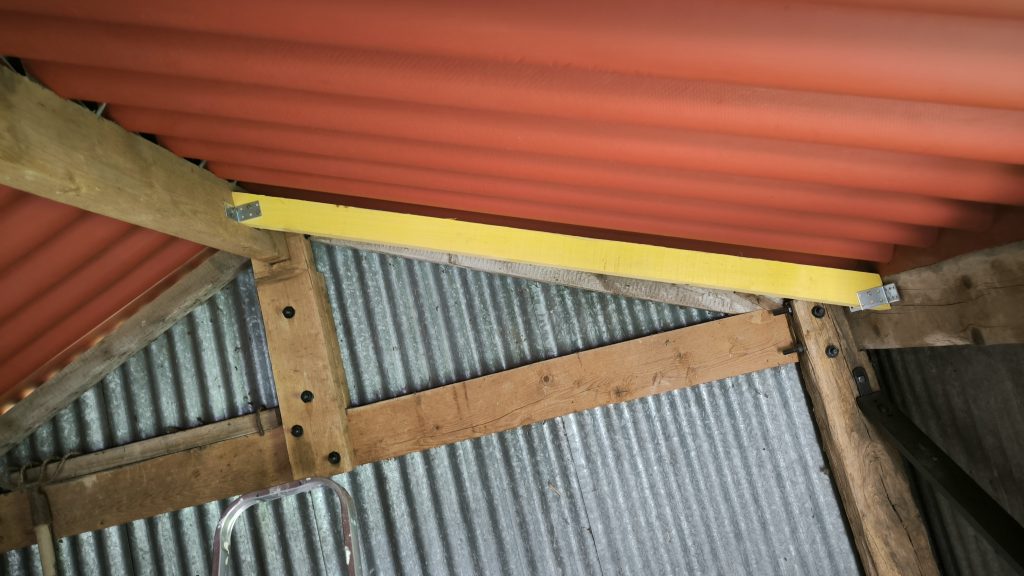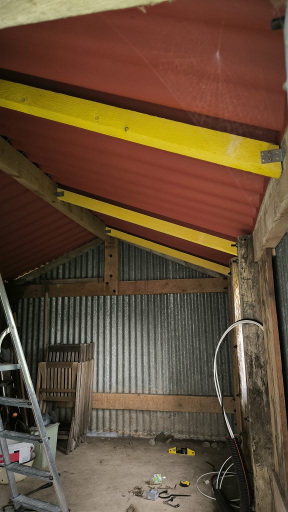Première étape : Pose de chevrons en sous-face de toiture pour supporter le poids des panneaux. J’en profite au passage pour couler un socle sous les poteaux qui sont un peu…pourris ? et je termine par poser deux planches sur un côté de l’abri pour recevoir le coffret électrique étanche. Pour ceux qui ont suivi les chevrons ont été coupés à quel angle ? 🙂 pour info ils font 153cm de long, ça peut aider les hésitants.