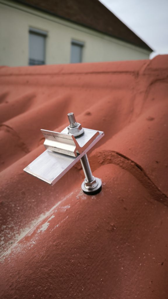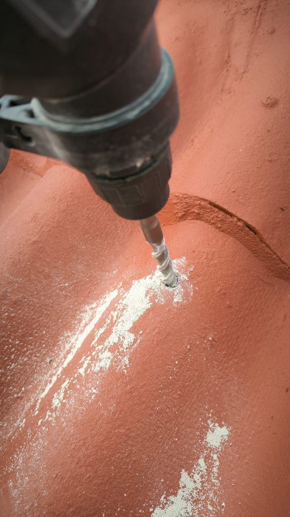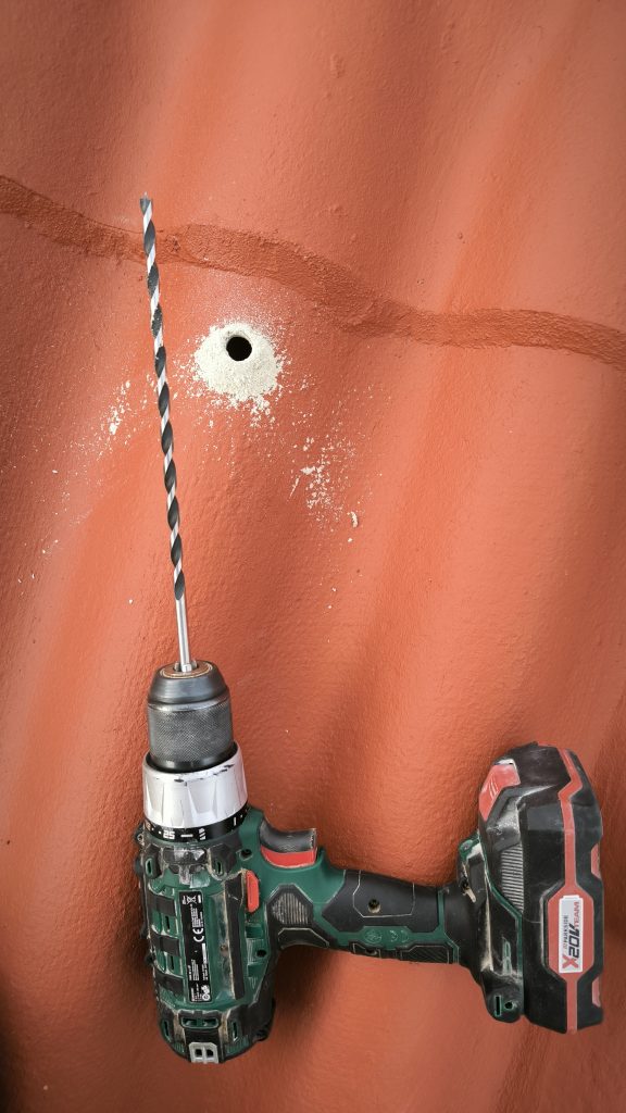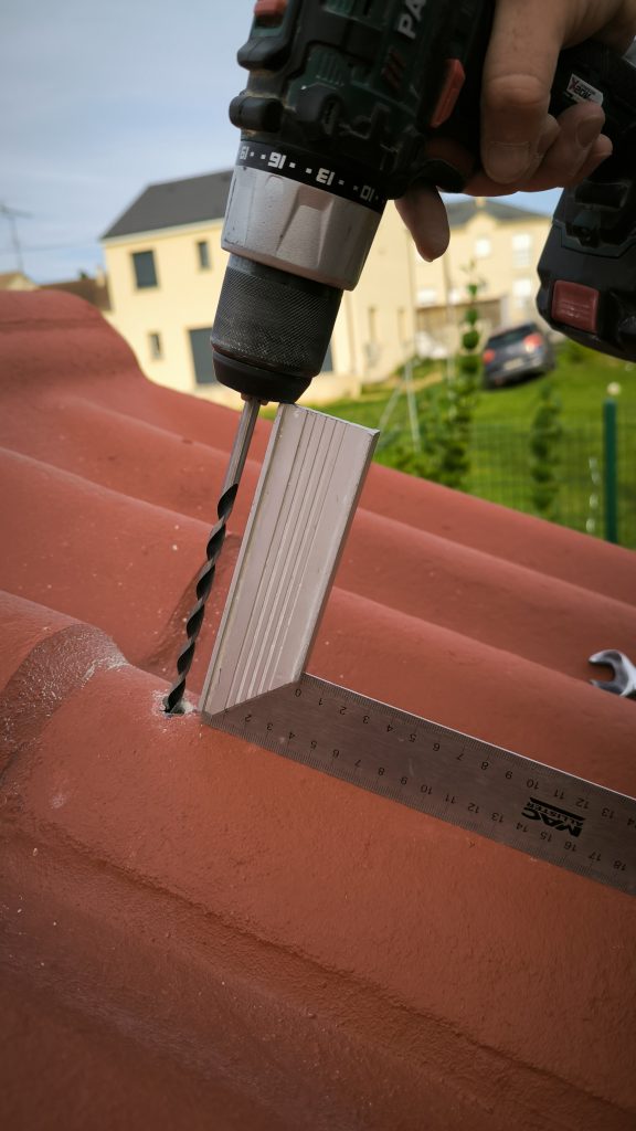 Étape 2 : Percer le toit pour y mettre les fixations. Pour ça j’ai utilisé un forêt béton de 7mm suivi d’un de 14mm (SDS…) pour percer les fibro-ciments amianté (oust la poussière oust). Puis j’ai utilisé un forêt bois de 6mm de 25cm de long pour faire un pré-trou dans les chevrons (la vis inox fait 10mm). A priori j’aurai pu faire sans mais j’ai préféré joué la sécurité. Cette seconde étape a été faite un soir après le boulot.