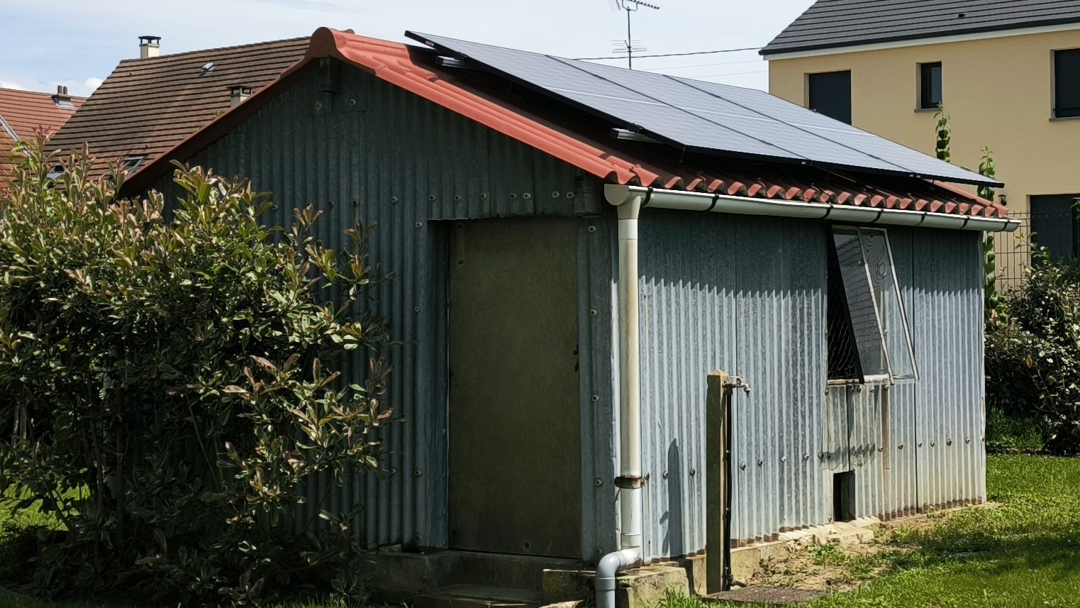 Nous voulions tester la production solaire depuis quelques temps et cette année nous avons pu le faire en installant trois panneaux sur le toit de l’abri de jardin. L’orientation n’est pas idéale (Ouest), la pente pas hyper adaptée (25°) et le soir la maison fait de l’ombre sur le bâtiment… mais l’idée est déjà de voir concrètement comment ça marche et ce qu’on peut changer sur notre consommation pour mieux utiliser l’énergie solaire (hé oui par défaut c’est énedis qui récupère le surplus gratuitement, le but est donc de tout consommer).