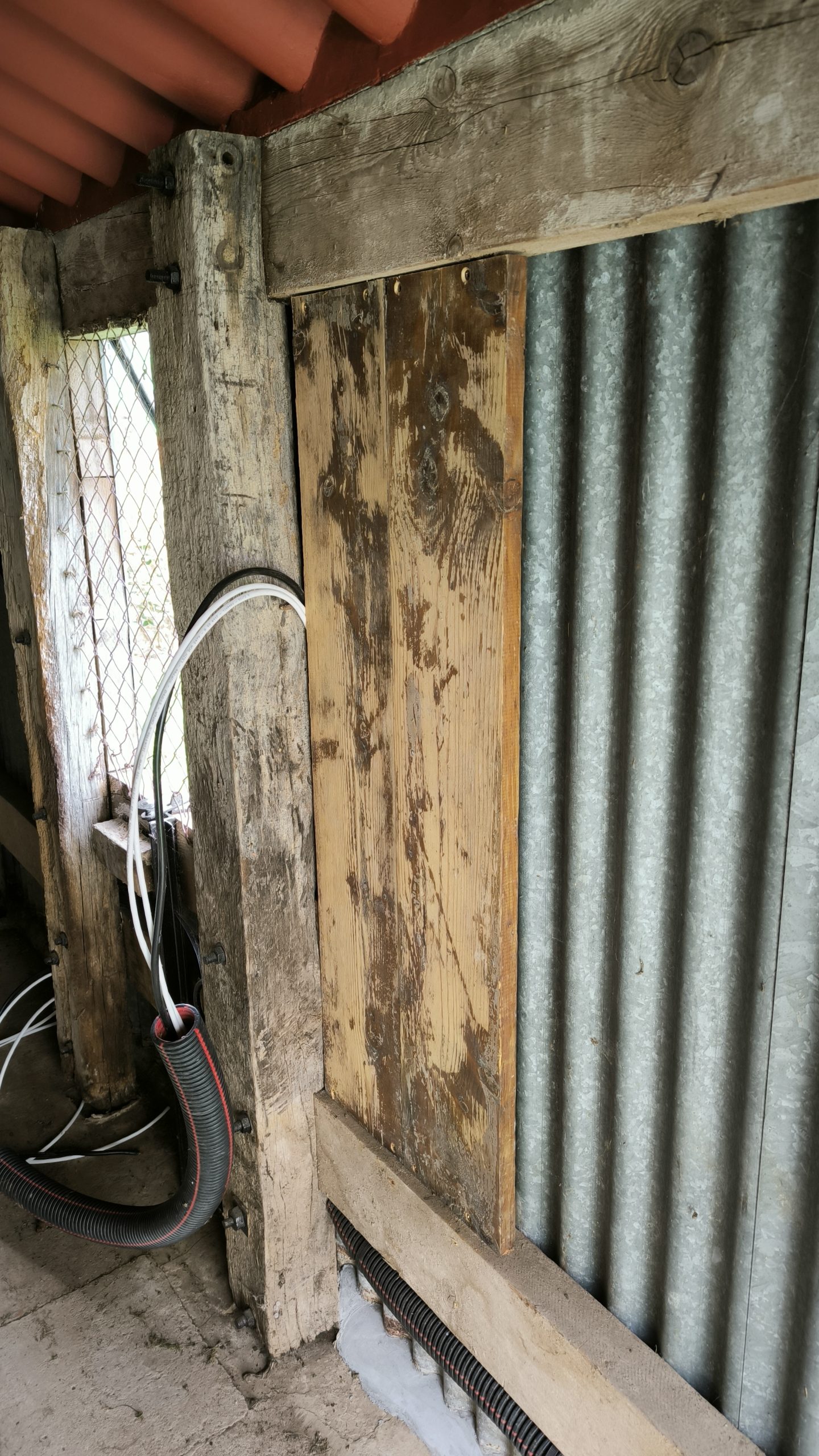 Première étape : Pose de chevrons en sous-face de toiture pour supporter le poids des panneaux. J’en profite au passage pour couler un socle sous les poteaux qui sont un peu…pourris ? et je termine par poser deux planches sur un côté de l’abri pour recevoir le coffret électrique étanche. Pour ceux qui ont suivi les chevrons ont été coupés à quel angle ? 🙂 pour info ils font 153cm de long, ça peut aider les hésitants.