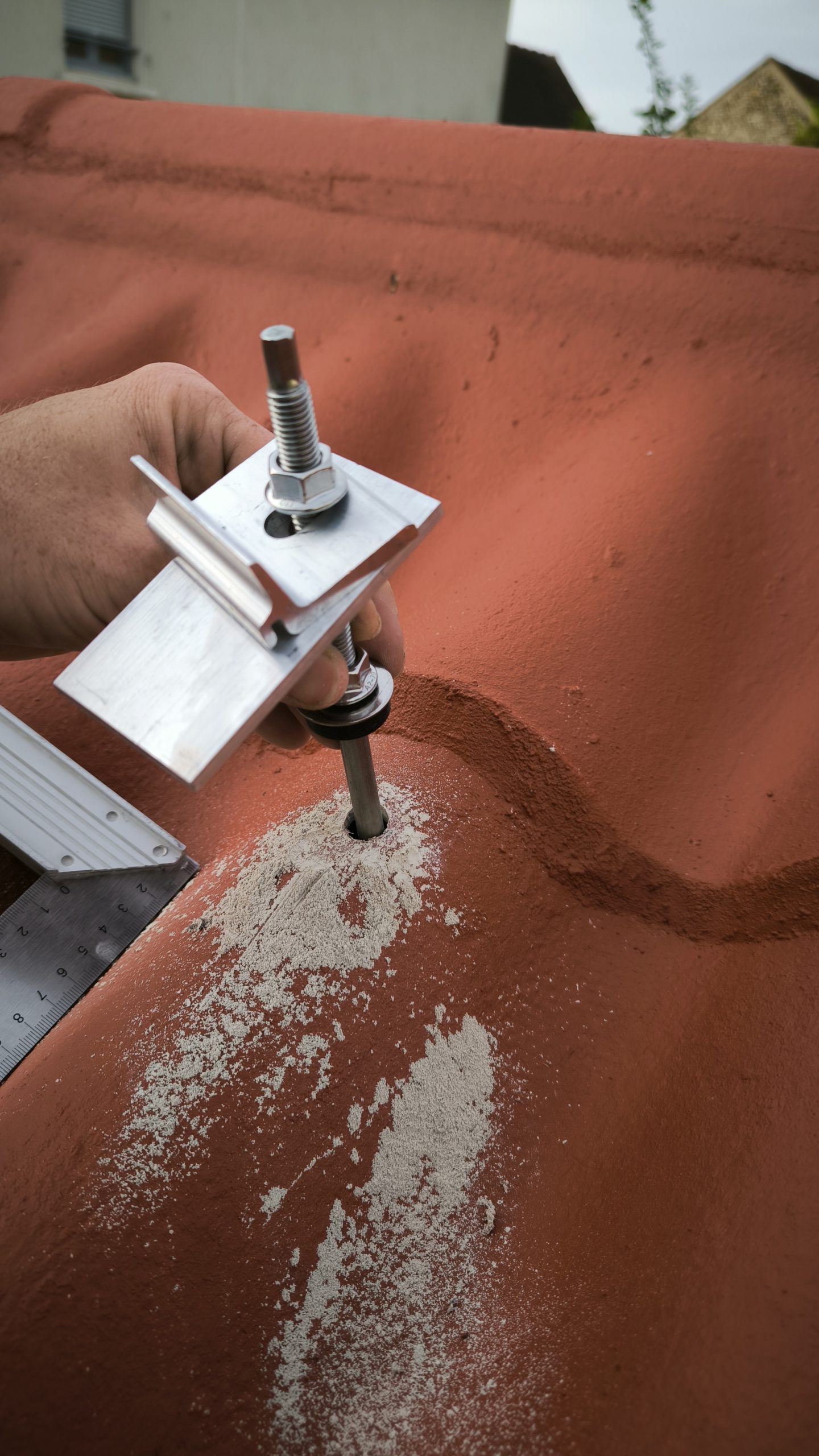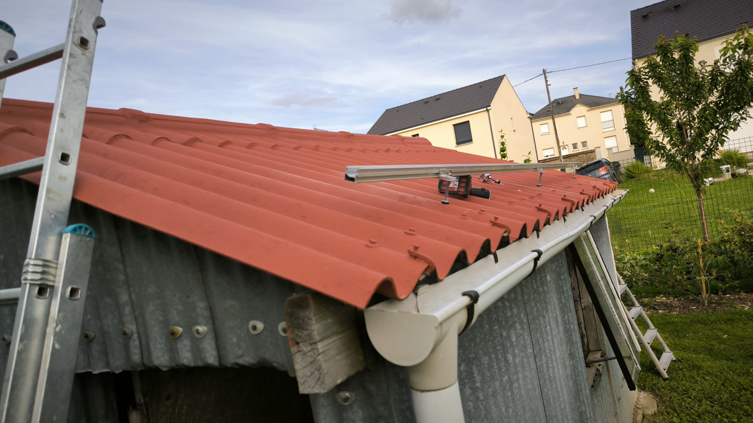 Étape 2 : Percer le toit pour y mettre les fixations. Pour ça j’ai utilisé un forêt béton de 7mm suivi d’un de 14mm (SDS…) pour percer les fibro-ciments amianté (oust la poussière oust). Puis j’ai utilisé un forêt bois de 6mm de 25cm de long pour faire un pré-trou dans les chevrons (la vis inox fait 10mm). A priori j’aurai pu faire sans mais j’ai préféré joué la sécurité. Cette seconde étape a été faite un soir après le boulot.