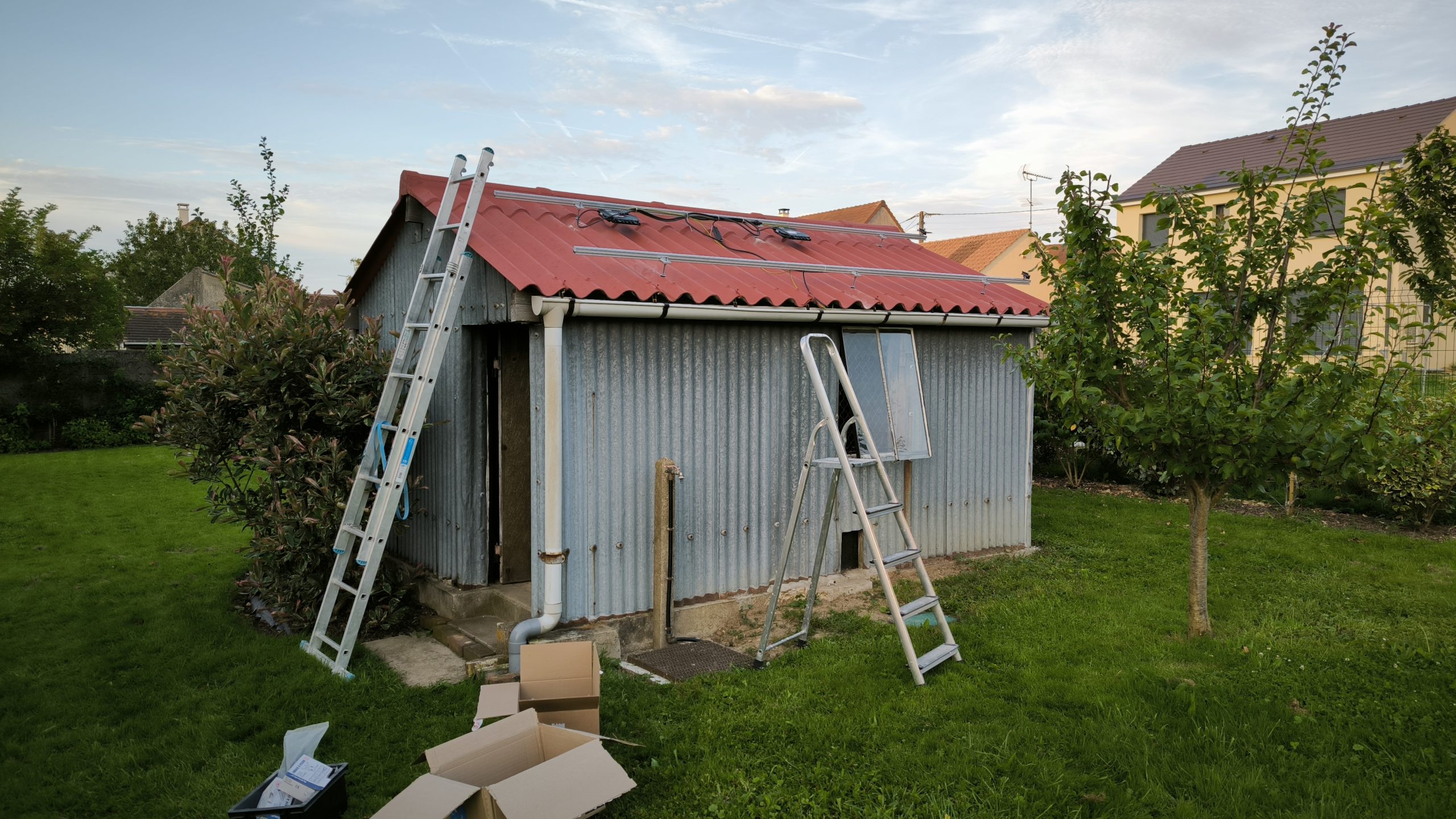 21h30 les onduleurs sont posés, 22h30 les panneaux le sont aussi. On verra demain si ça marche :