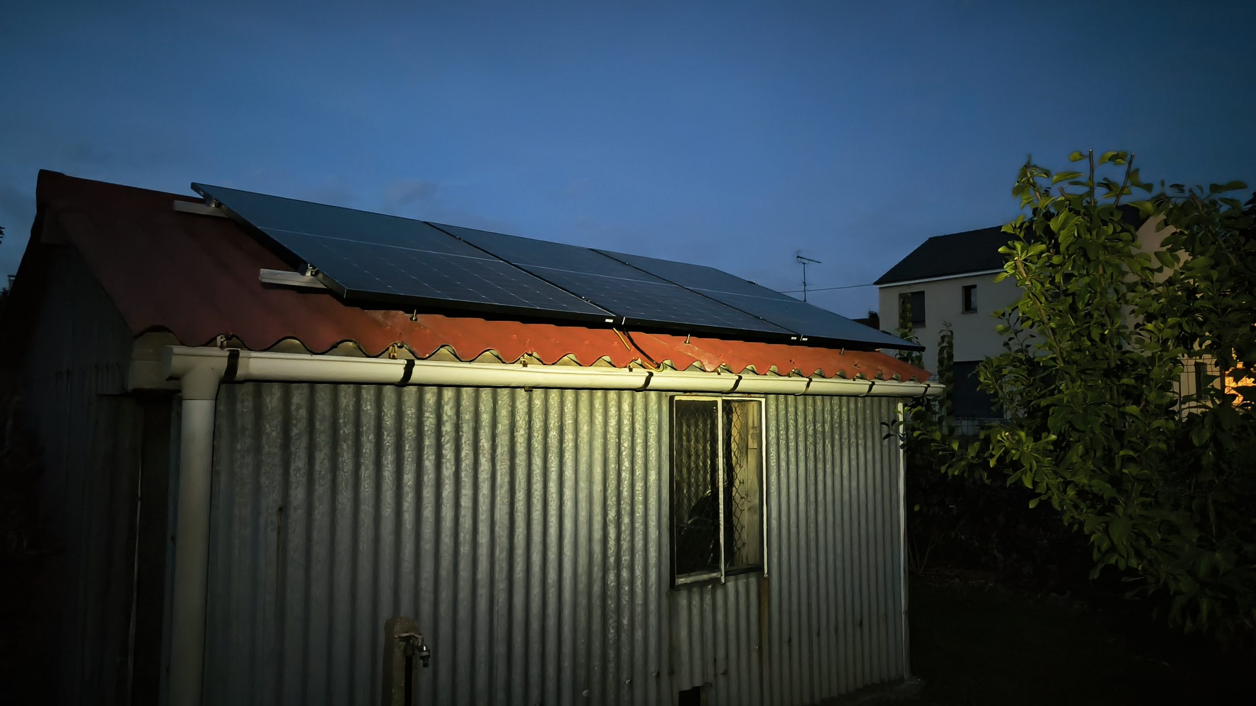Nous voulions tester la production solaire depuis quelques temps et cette année nous avons pu le faire en installant trois panneaux sur le toit de l’abri de jardin. L’orientation n’est pas idéale (Ouest), la pente pas hyper adaptée (25°) et le soir la maison fait de l’ombre sur le bâtiment… mais l’idée est déjà de voir concrètement comment ça marche et ce qu’on peut changer sur notre consommation pour mieux utiliser l’énergie solaire (hé oui par défaut c’est énedis qui récupère le surplus gratuitement, le but est donc de tout consommer).