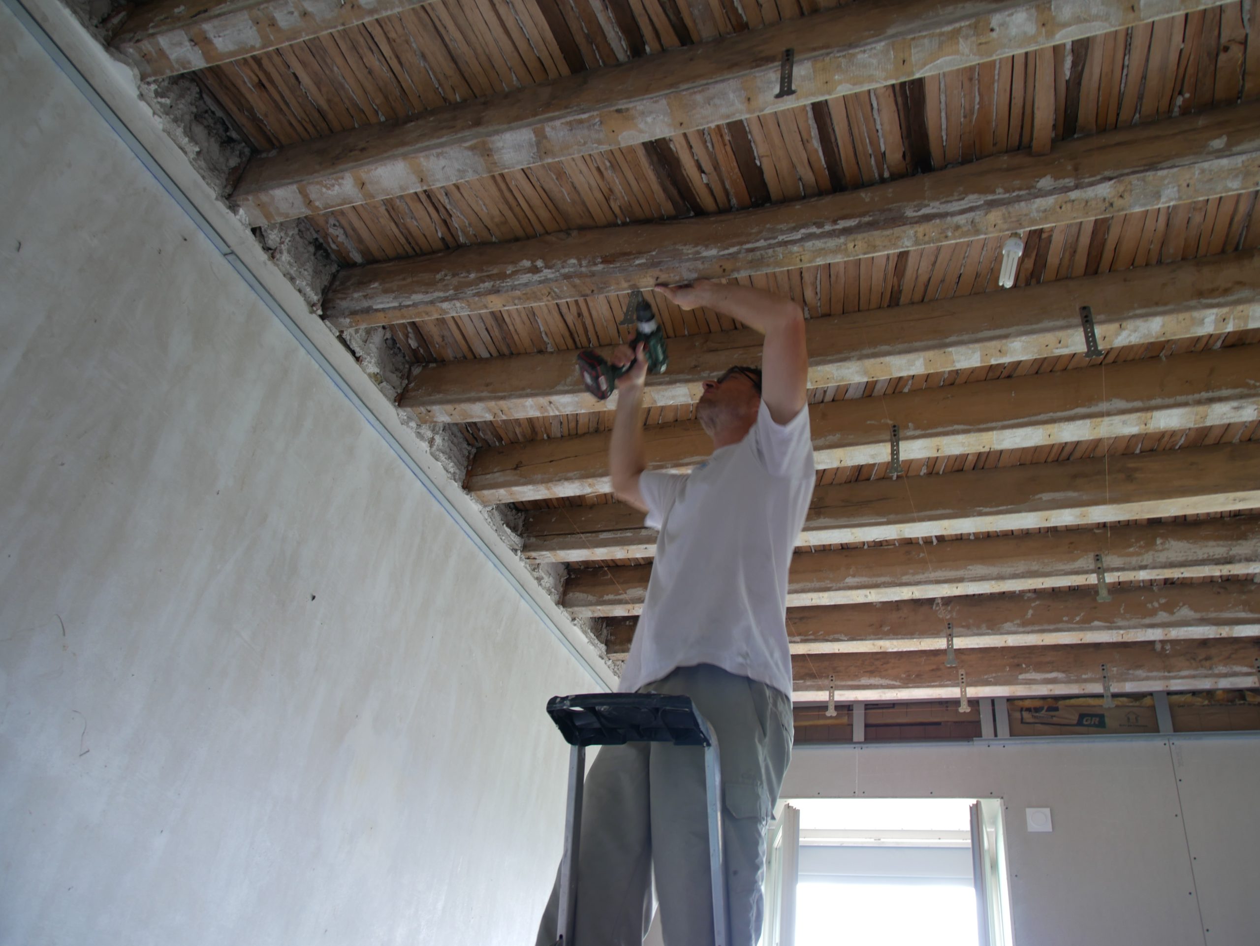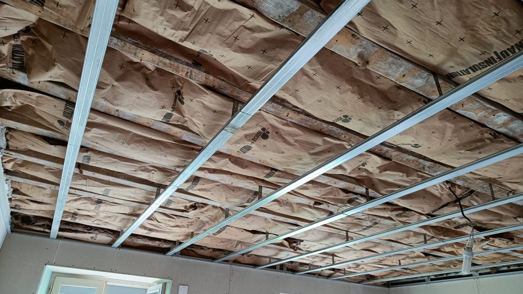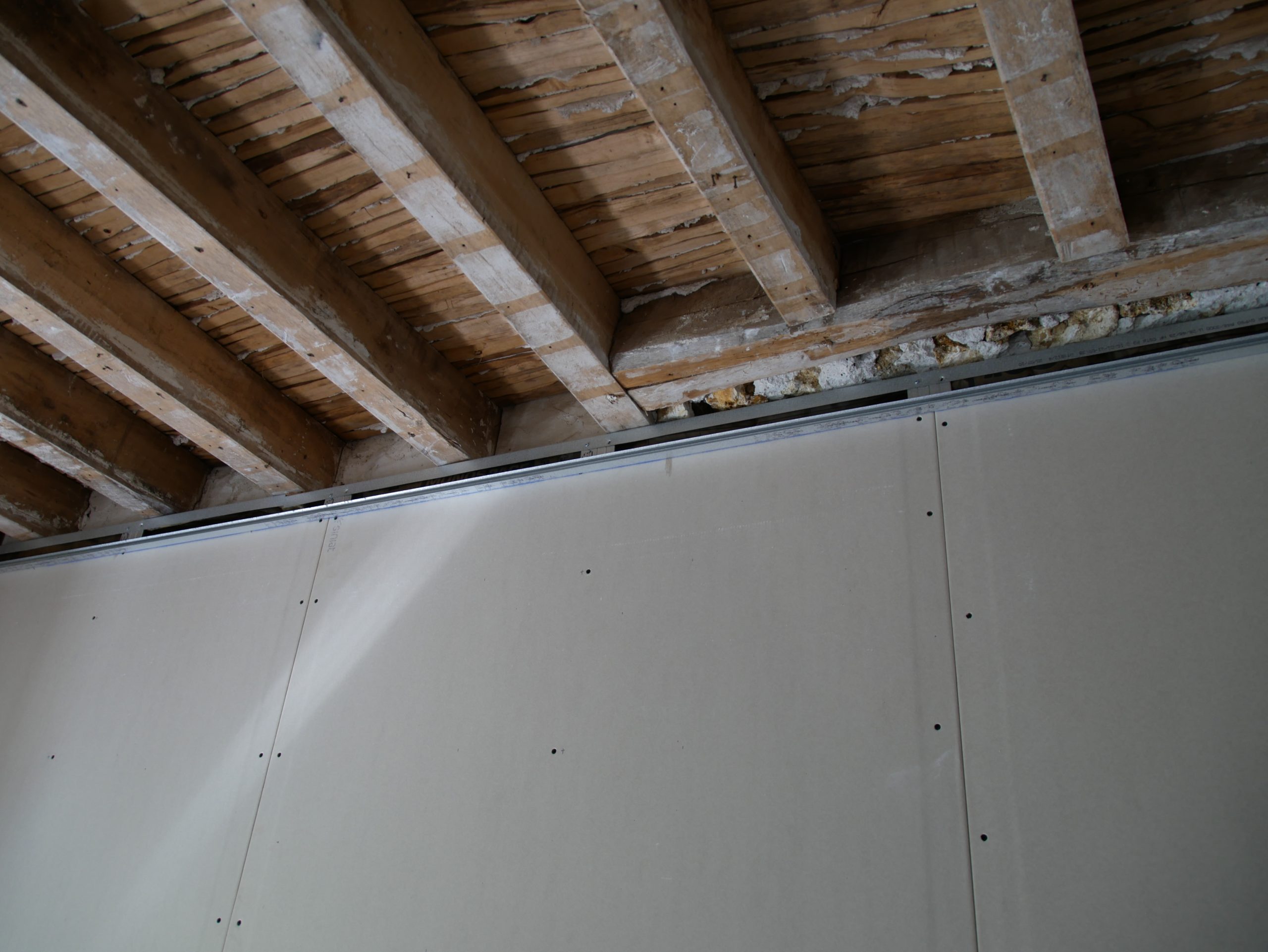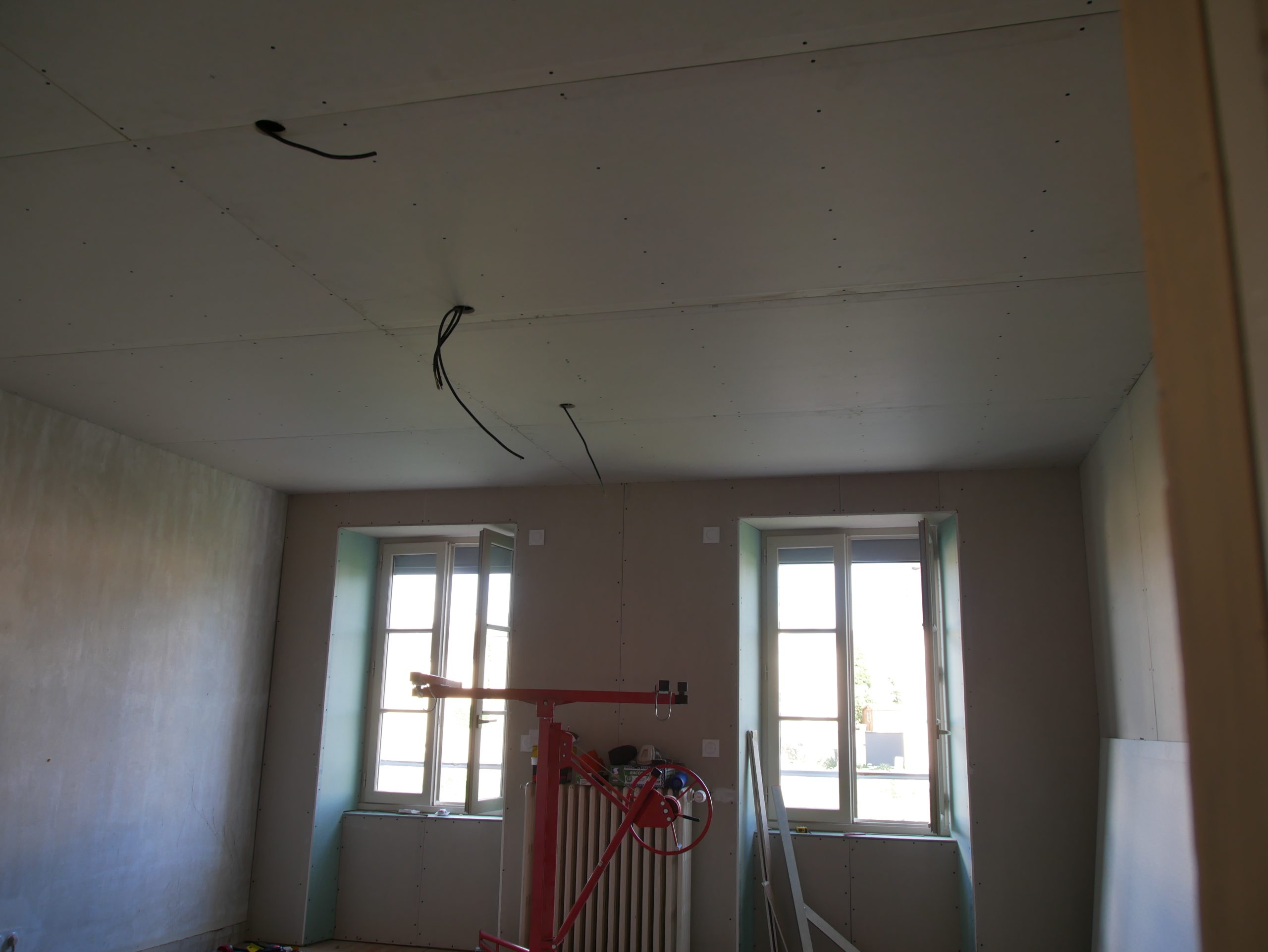 Je continue cette semaine la partie isolation avec le plafond du bureau. Bien que j’ai 40cm de laine de verre au dessus dans le grenier, le fait d’avoir retiré l’année dernière le plafond en plâtre à eu un effet de bord : régulièrement du plâtre et de la poussière tombe du plafond. Vraiment pas super, surtout pour le parquet ou le matériel informatique.