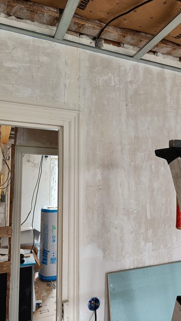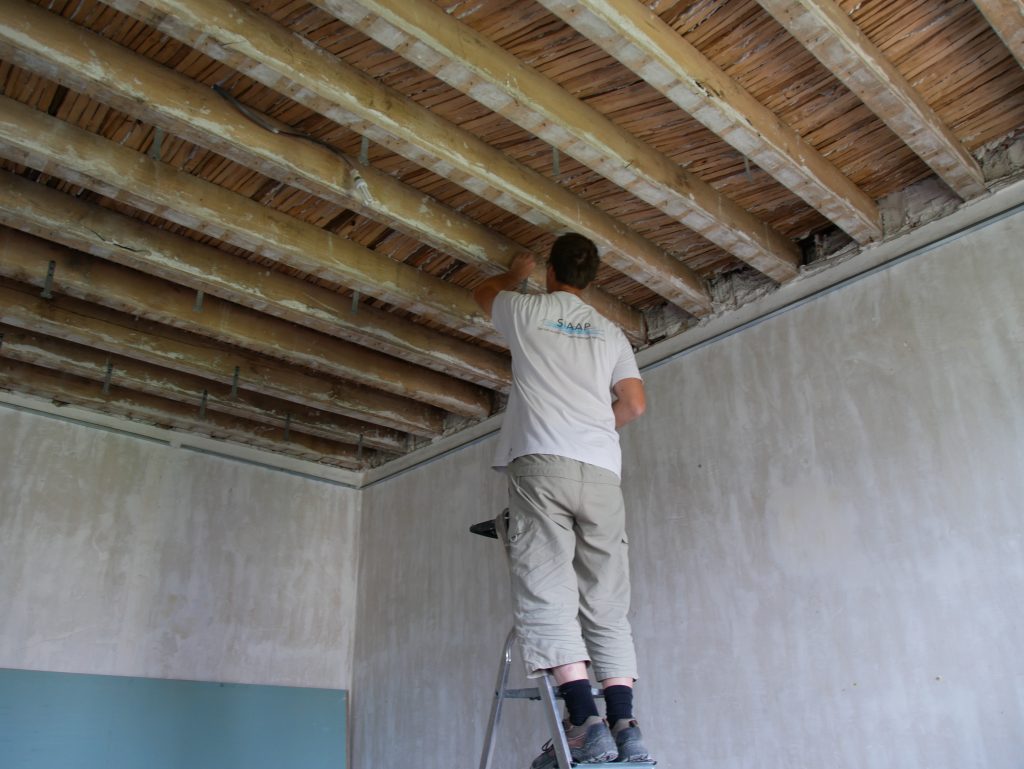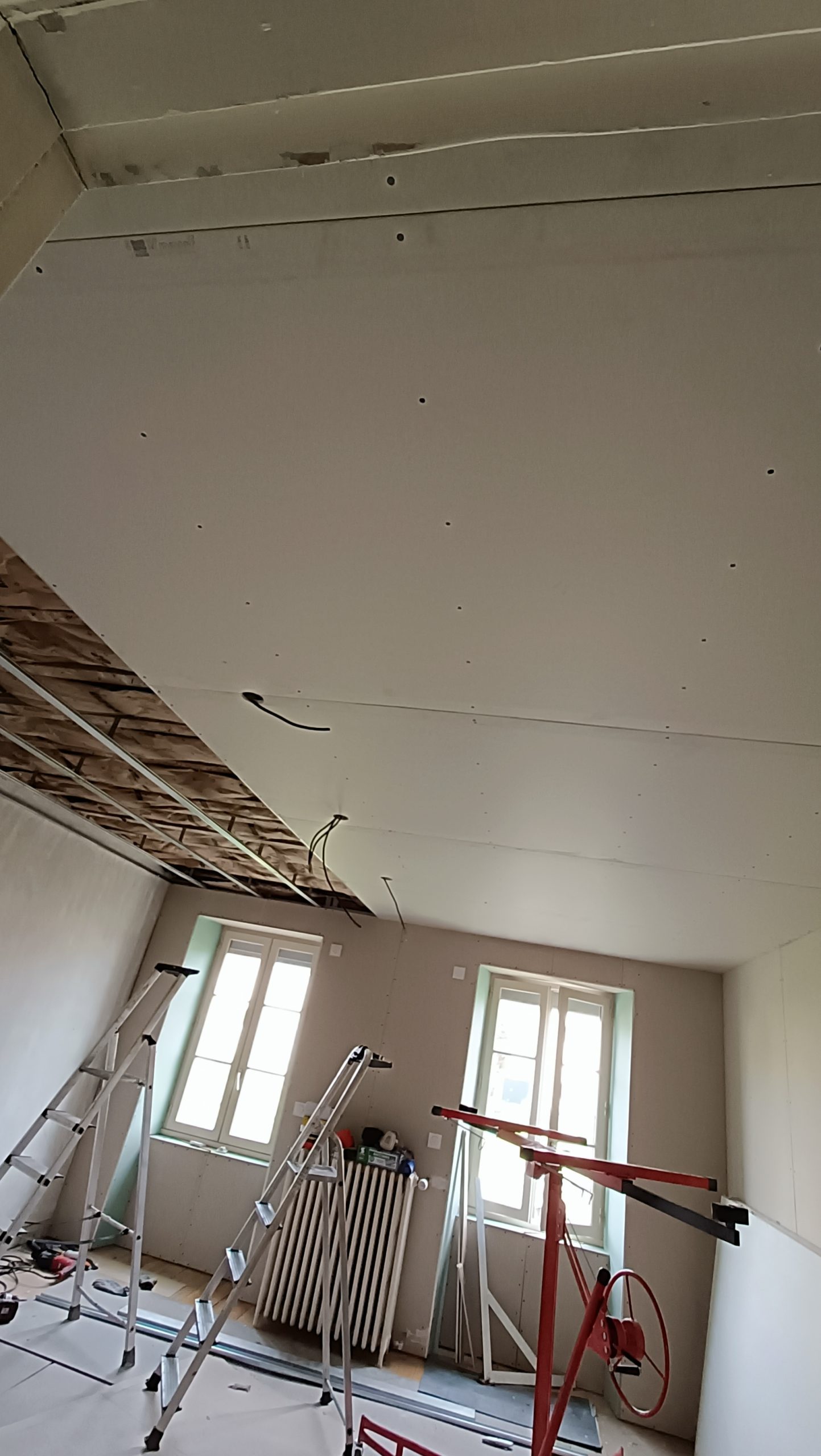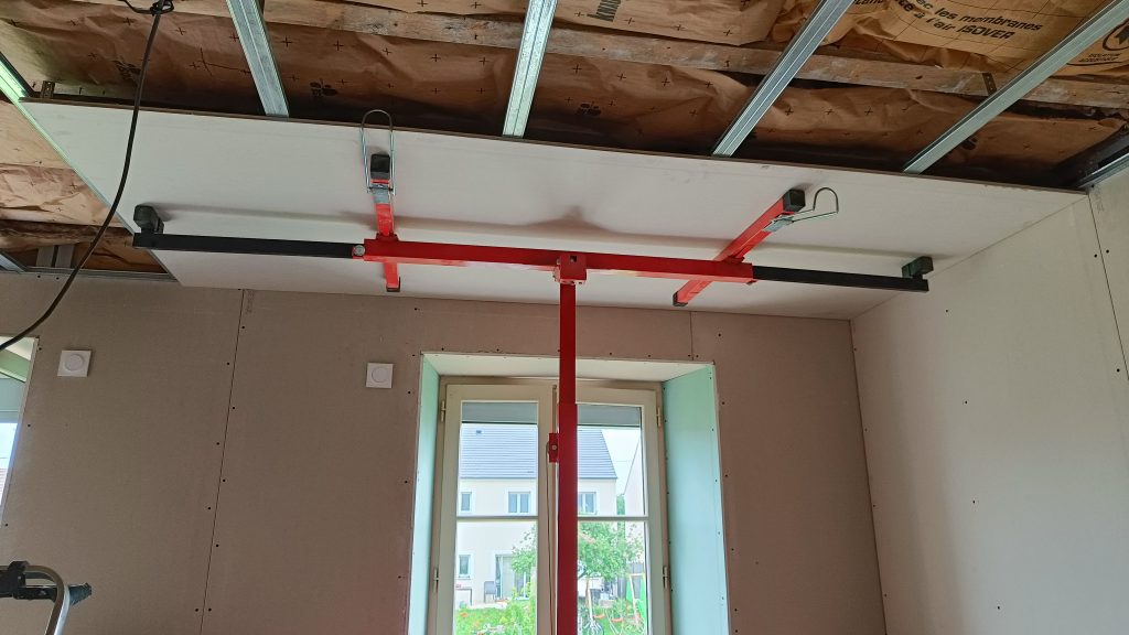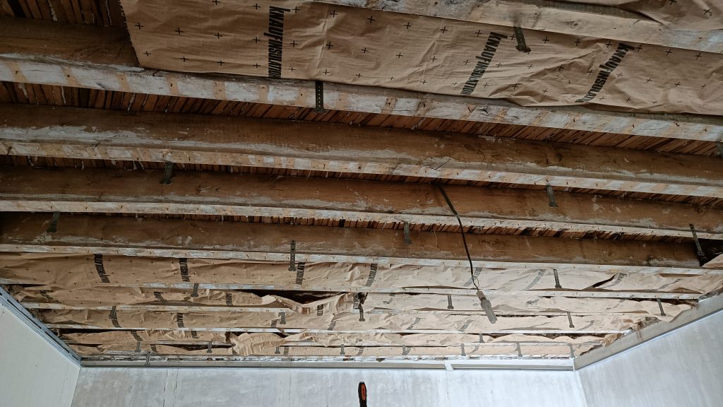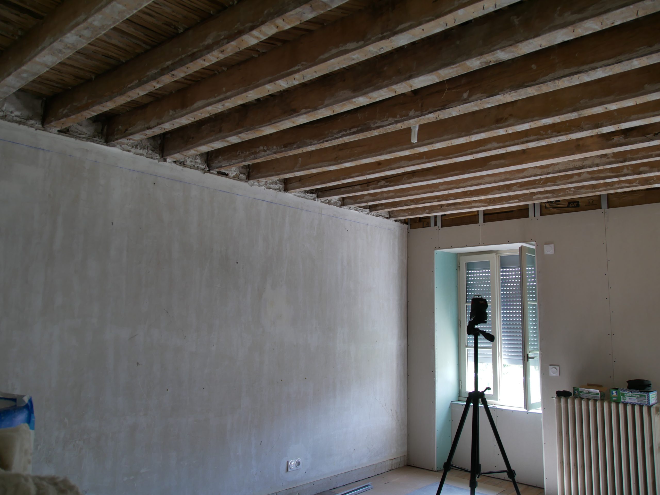 Je continue cette semaine la partie isolation avec le plafond du bureau. Bien que j’ai 40cm de laine de verre au dessus dans le grenier, le fait d’avoir retiré l’année dernière le plafond en plâtre à eu un effet de bord : régulièrement du plâtre et de la poussière tombe du plafond. Vraiment pas super, surtout pour le parquet ou le matériel informatique.