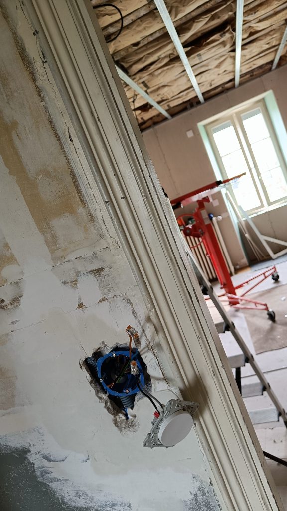 Et au final la gaine de 16mm est courbée tellement fortement que je n’arrive pas à passer le nouveau câble : conclusion j’ai du ouvrir le mur au niveau des interrupteurs, déplacer les raccords dans celui du couloir pour me faire de la place et ouvrir le mur en haut pour récupérer la gaine, la couper et la faire passer dans le faux plafond que je suis en train de faire (j’ai 10cm pour passer).