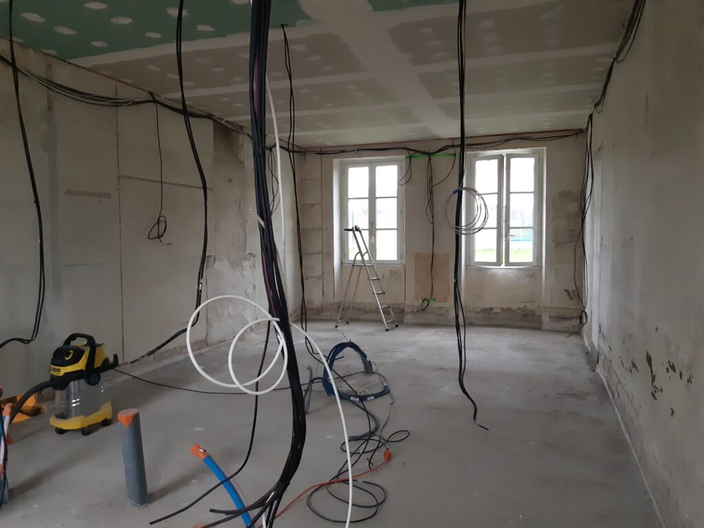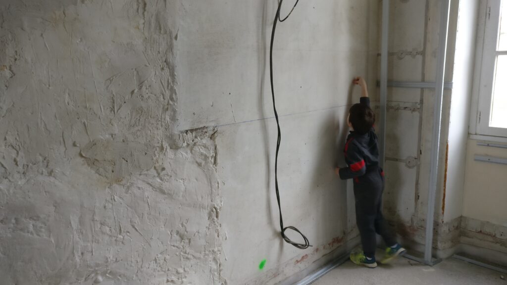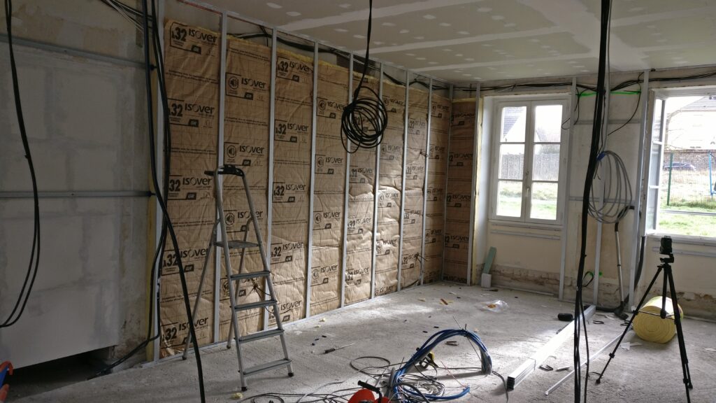 Je commence l’isolation du rez-de-chaussée par celle de la chambre dans la travée 2. Je continuerai ensuite par la salle de bain attenante, les WC et enfin le couloir. A ce moment là, la travée 2 sera totalement isolée et je passerai à la cuisine car le plombier à besoin d’avoir les nouveaux murs pour préparer les sorties d’eau ainsi que poser le chauffe-eau d’appoint.