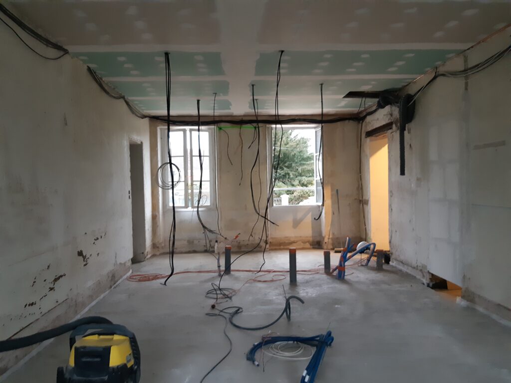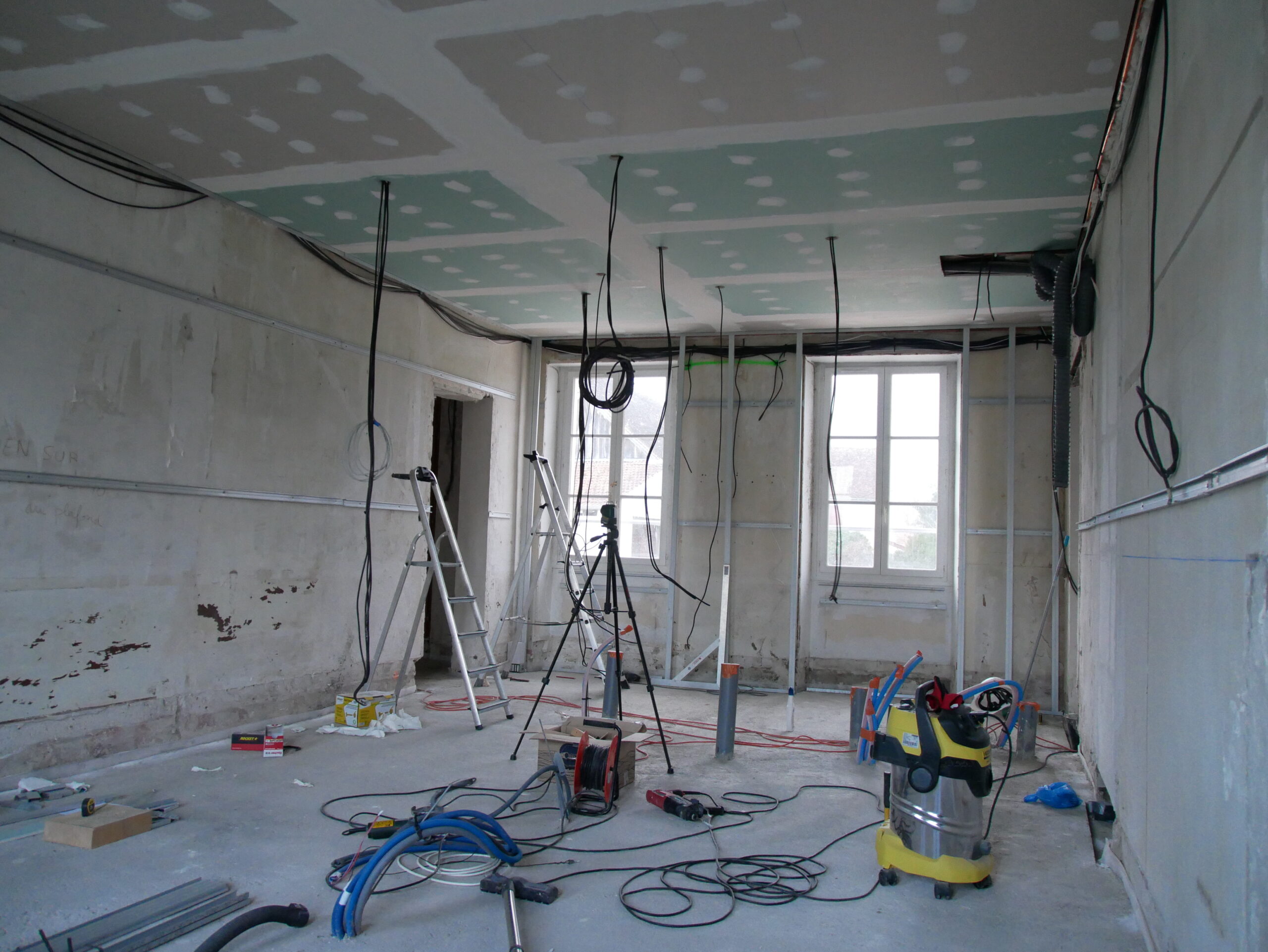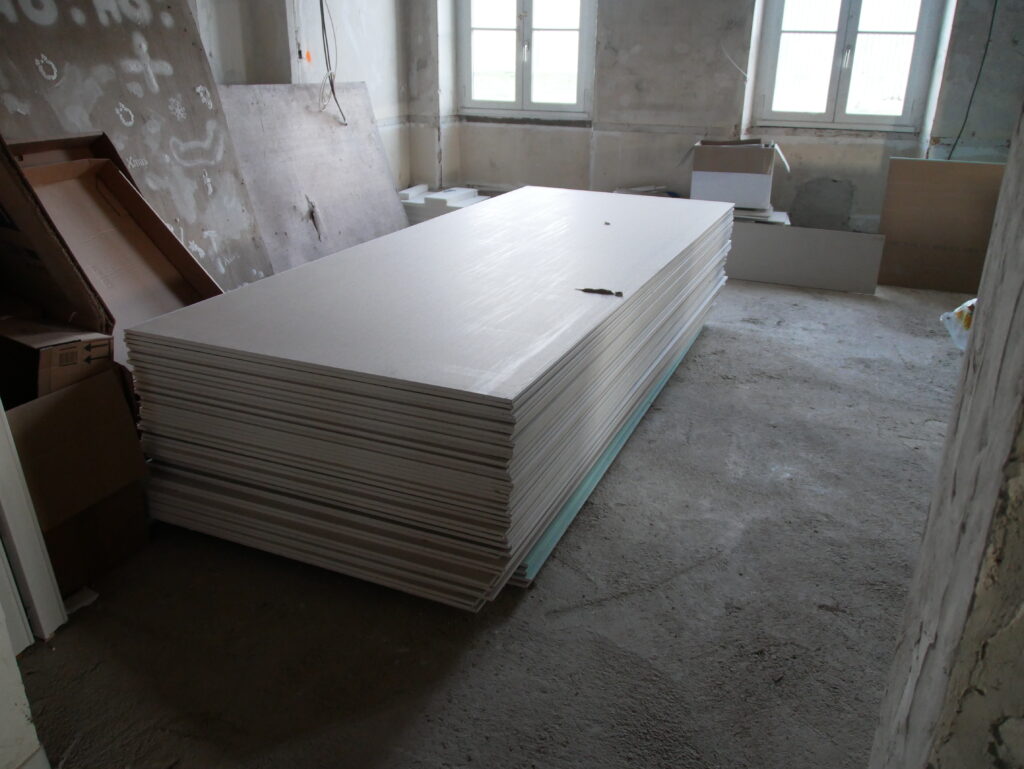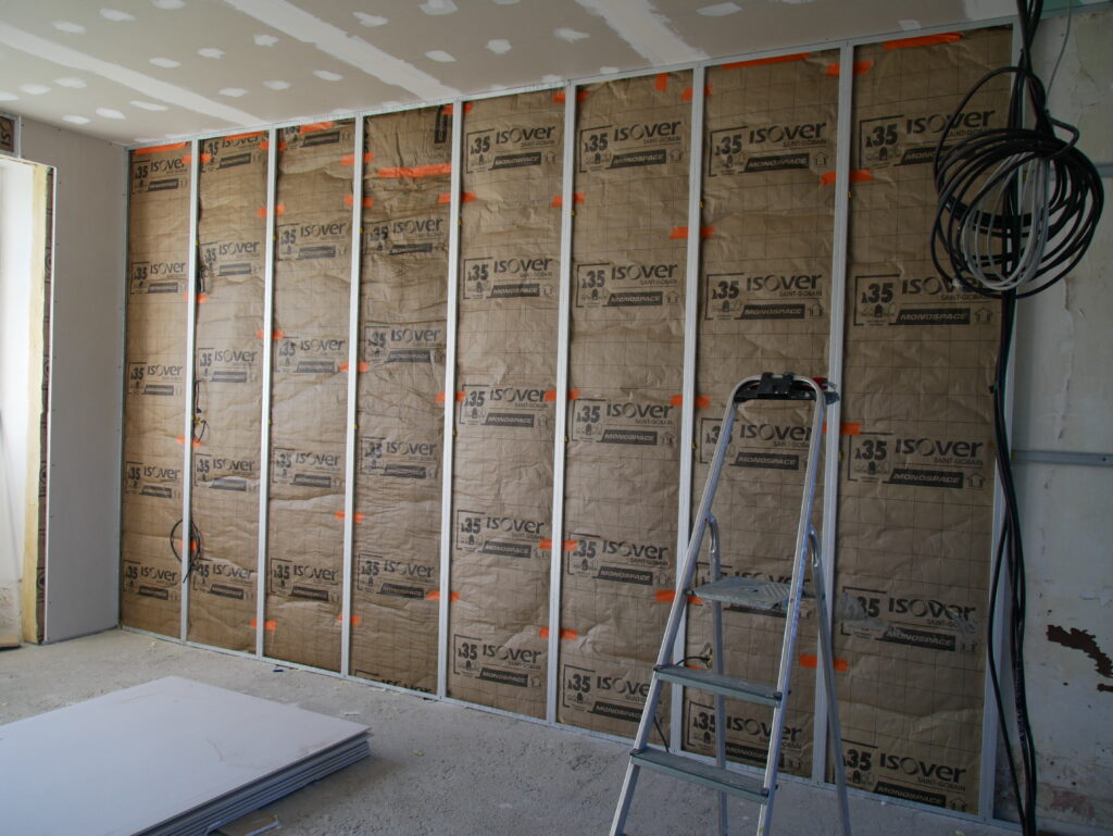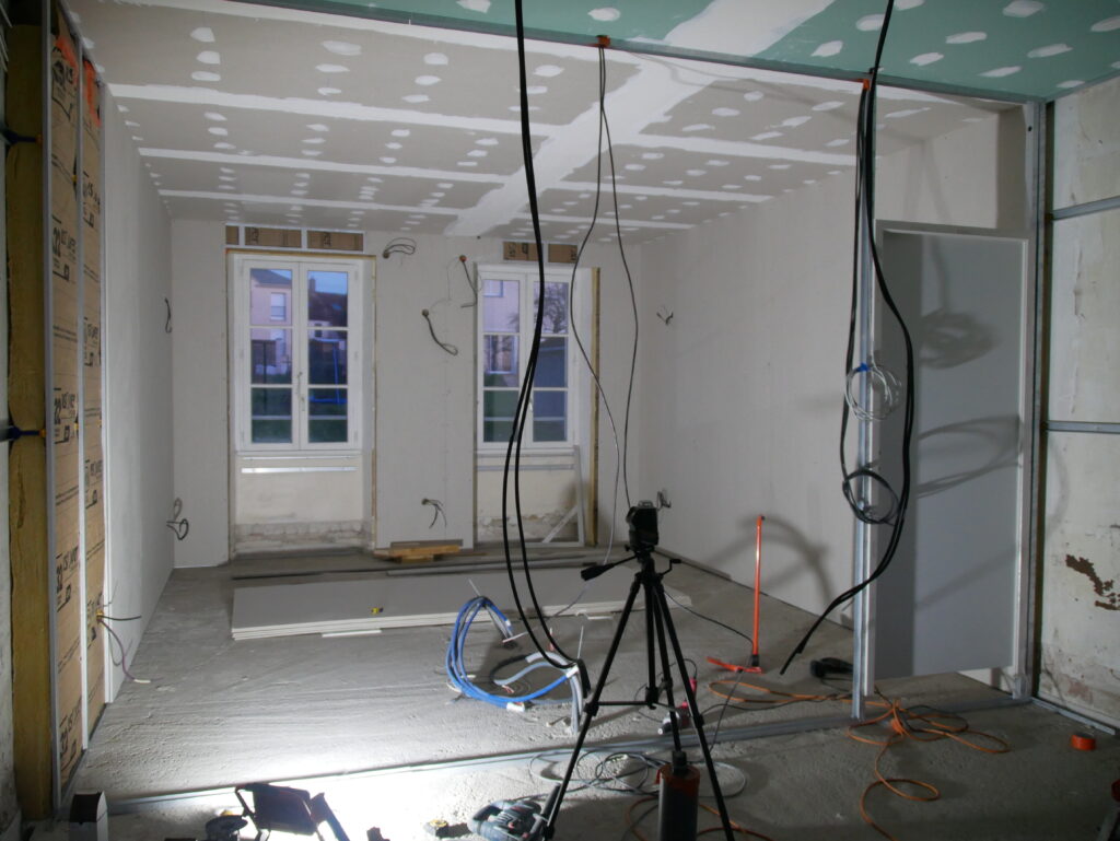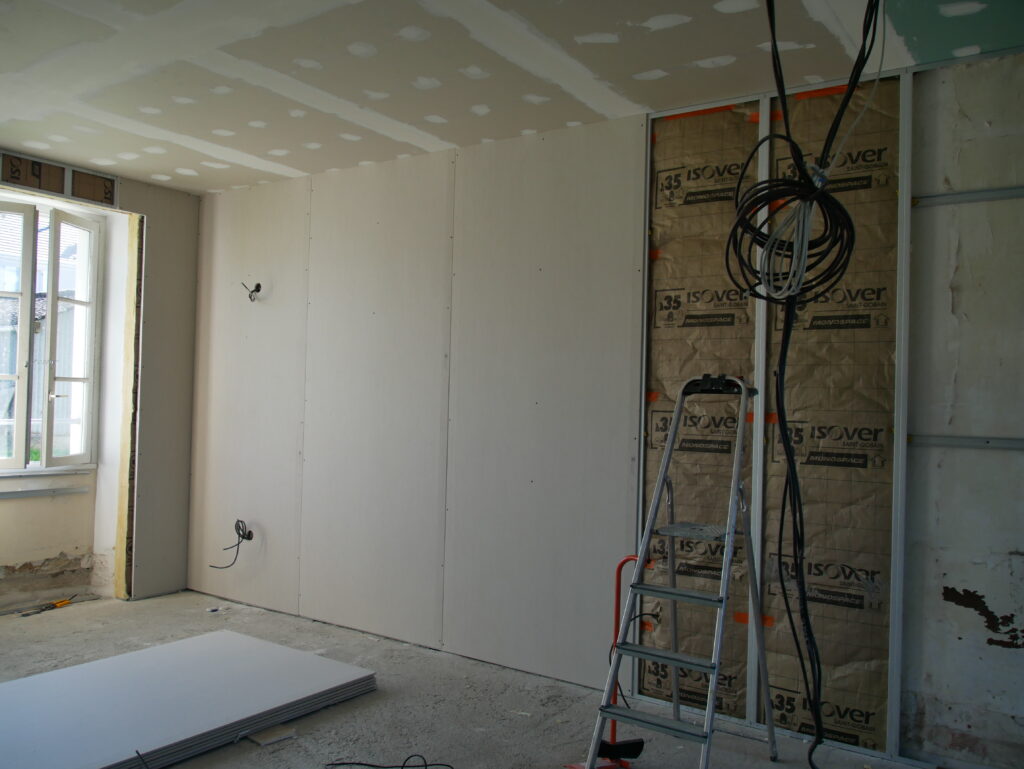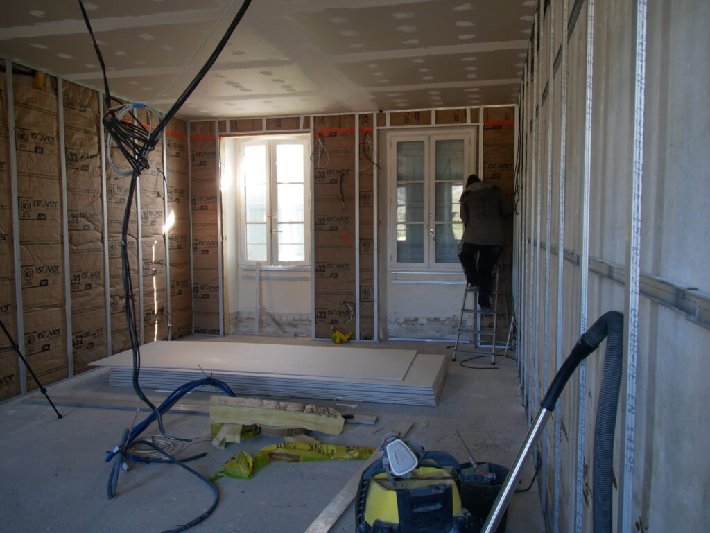 Pose des placos et du mur séparant la chambre de la salle de bain, avec pose du bloc porte.
