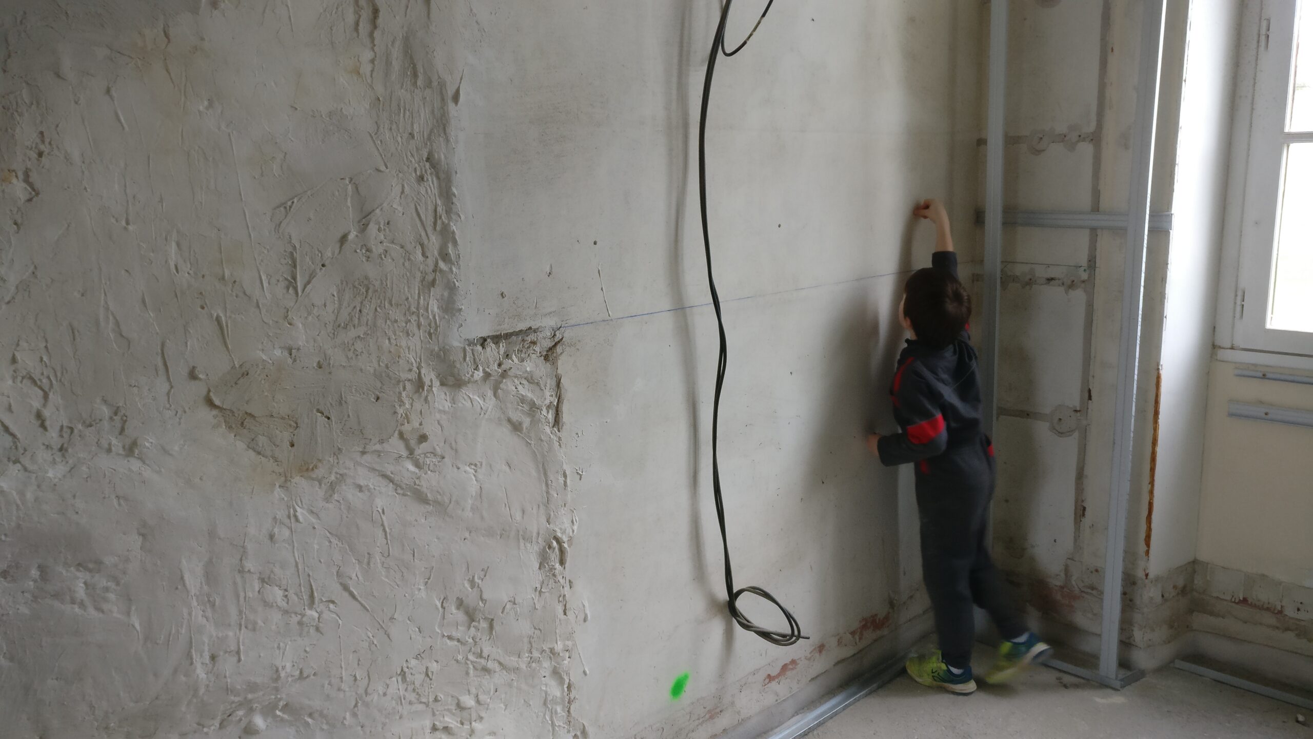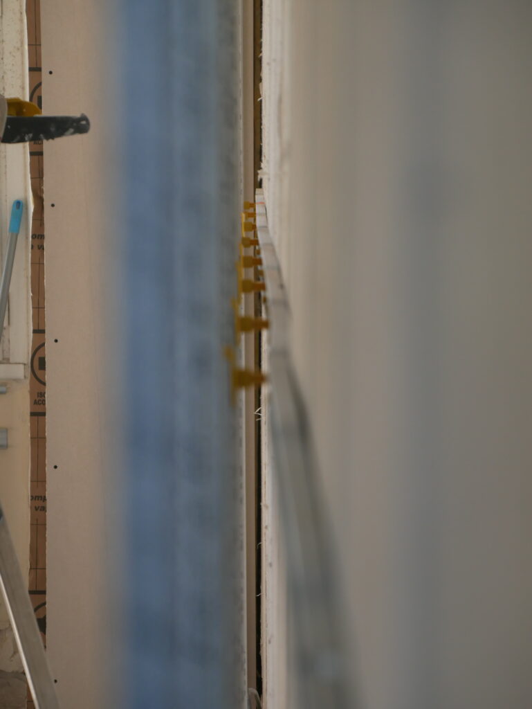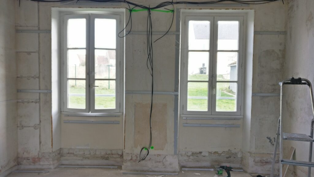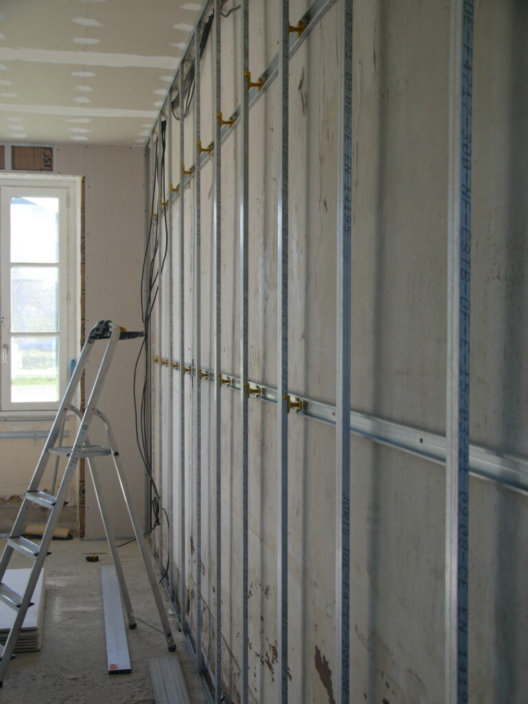 Dans un premier temps, pose des fourrures sur le mur, puis les lisses basse et haute, puis les fourrures verticales et les appuis intermédiaires.