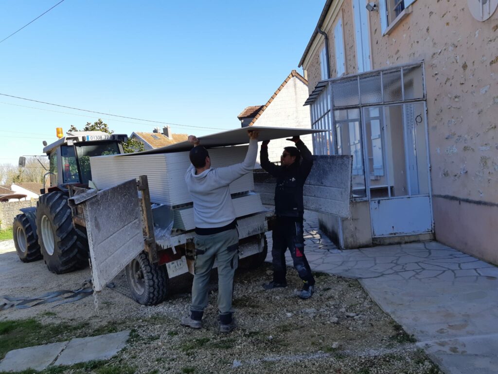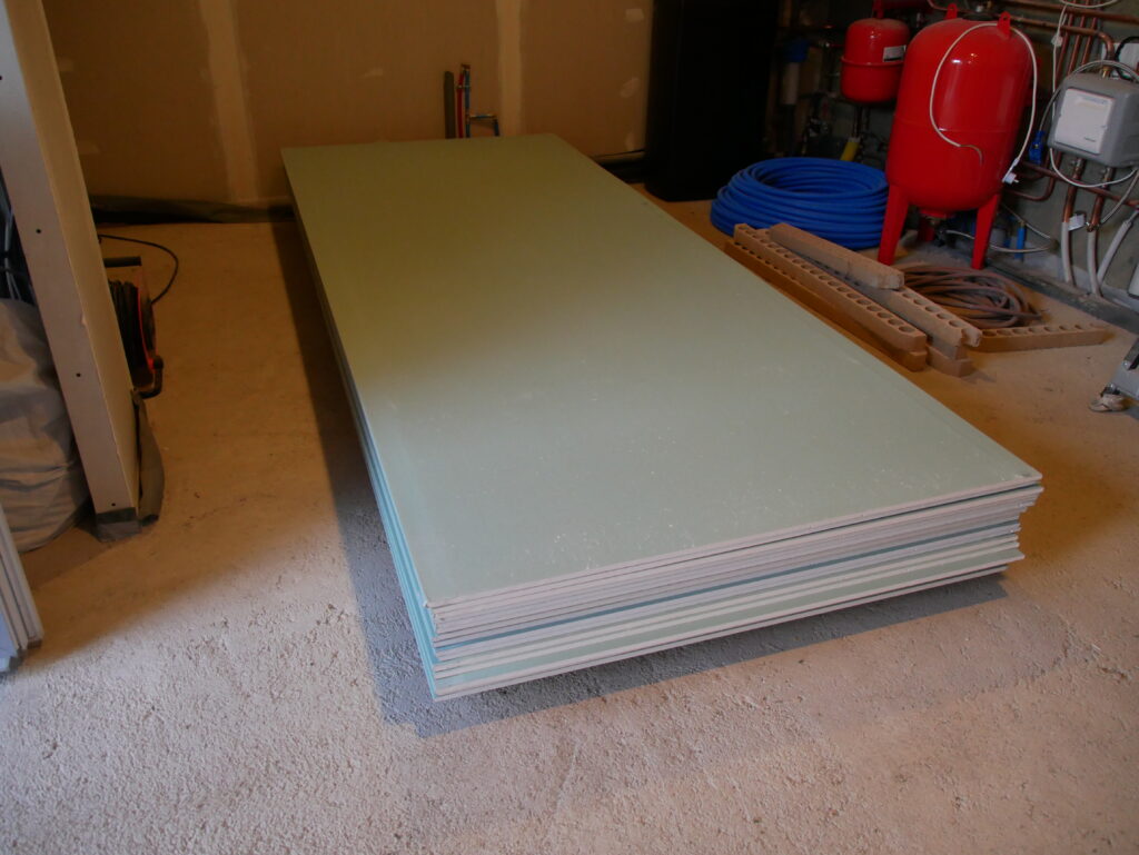 Ensuite pose de l’isolant. Côté extérieur on aura de la GR 32 en 120 mm revêtu kraft. Idem au dos de la cave. Pour les murs de refend de la monospace 35 en 45mm revêtu kraft. On remarquera au passage que je suis allé récupérer le placo (80 plaques, 11 sur ces photos). Merci au BF pour l’aide 🙂