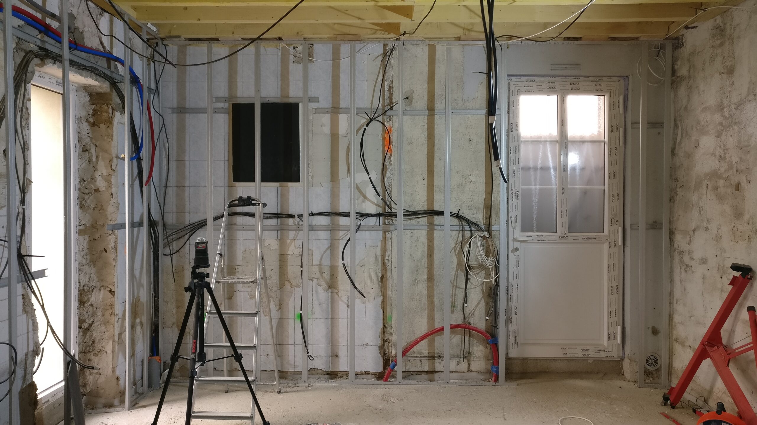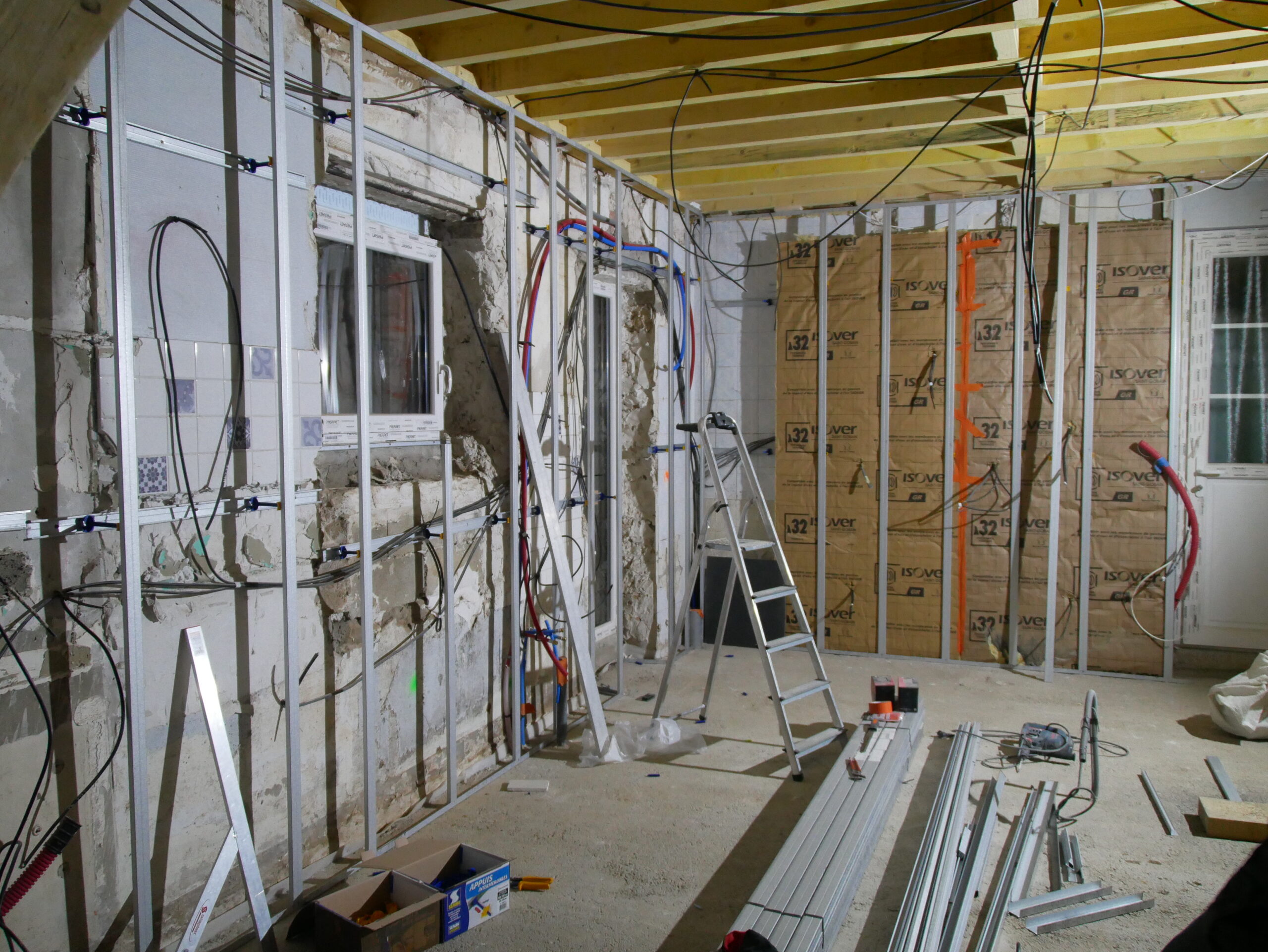 il y a 3 murs, 2 portes et 2 fenêtres… ça en fait des obstacles ! Et la cuisine est aussi un haut lieu de présence de câbles électrique et autres prises à des hauteurs toutes différentes : Four, plaques, prise plan de travail, frigo, micro-onde, lave vaisselle, ballon d’eau chaudes. Sans oublier de laisser la place pour les évacuations d’eau et les arrivées (elles sont le long de l’ancien murs et repasse donc dans le placo fini.