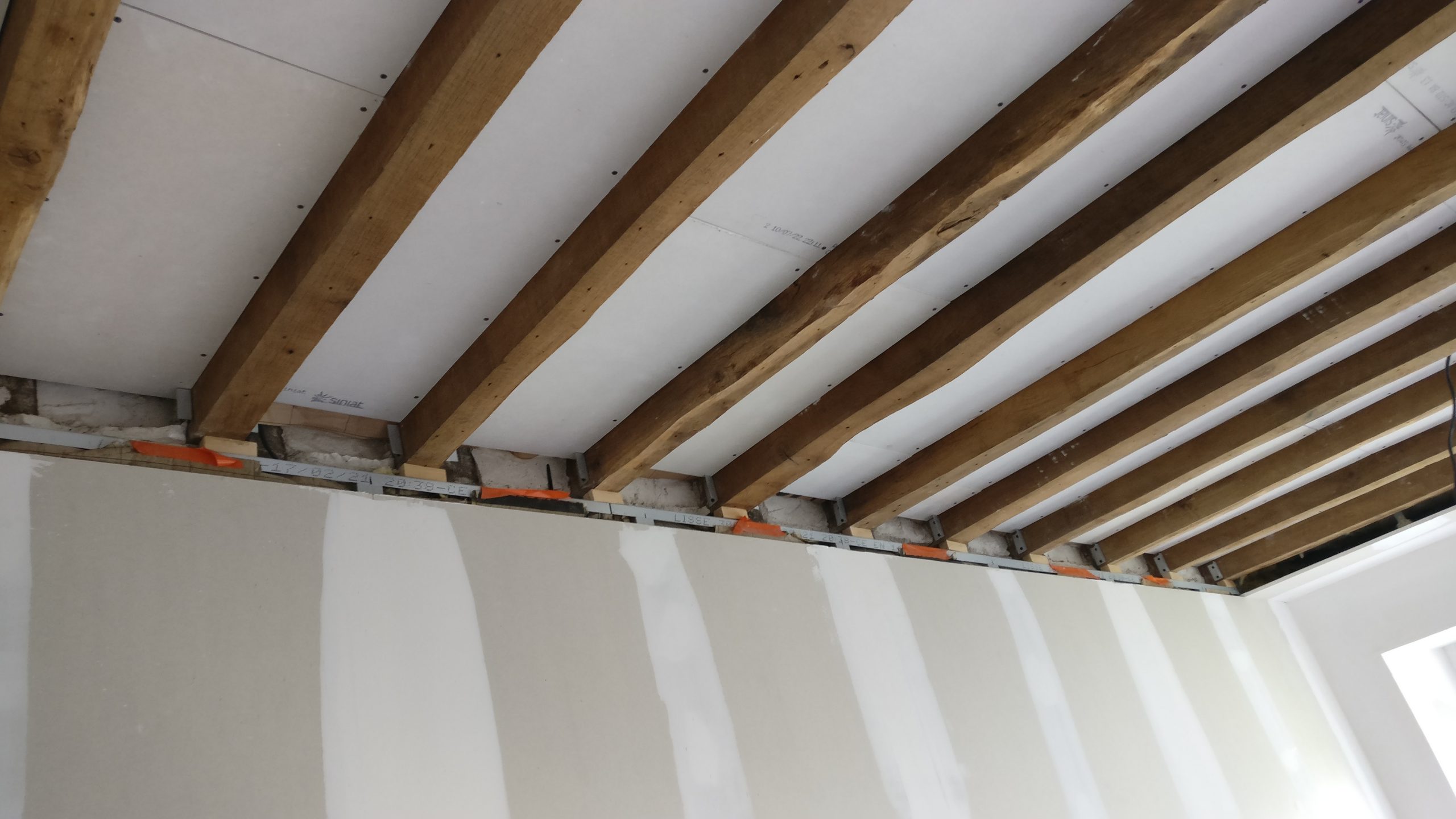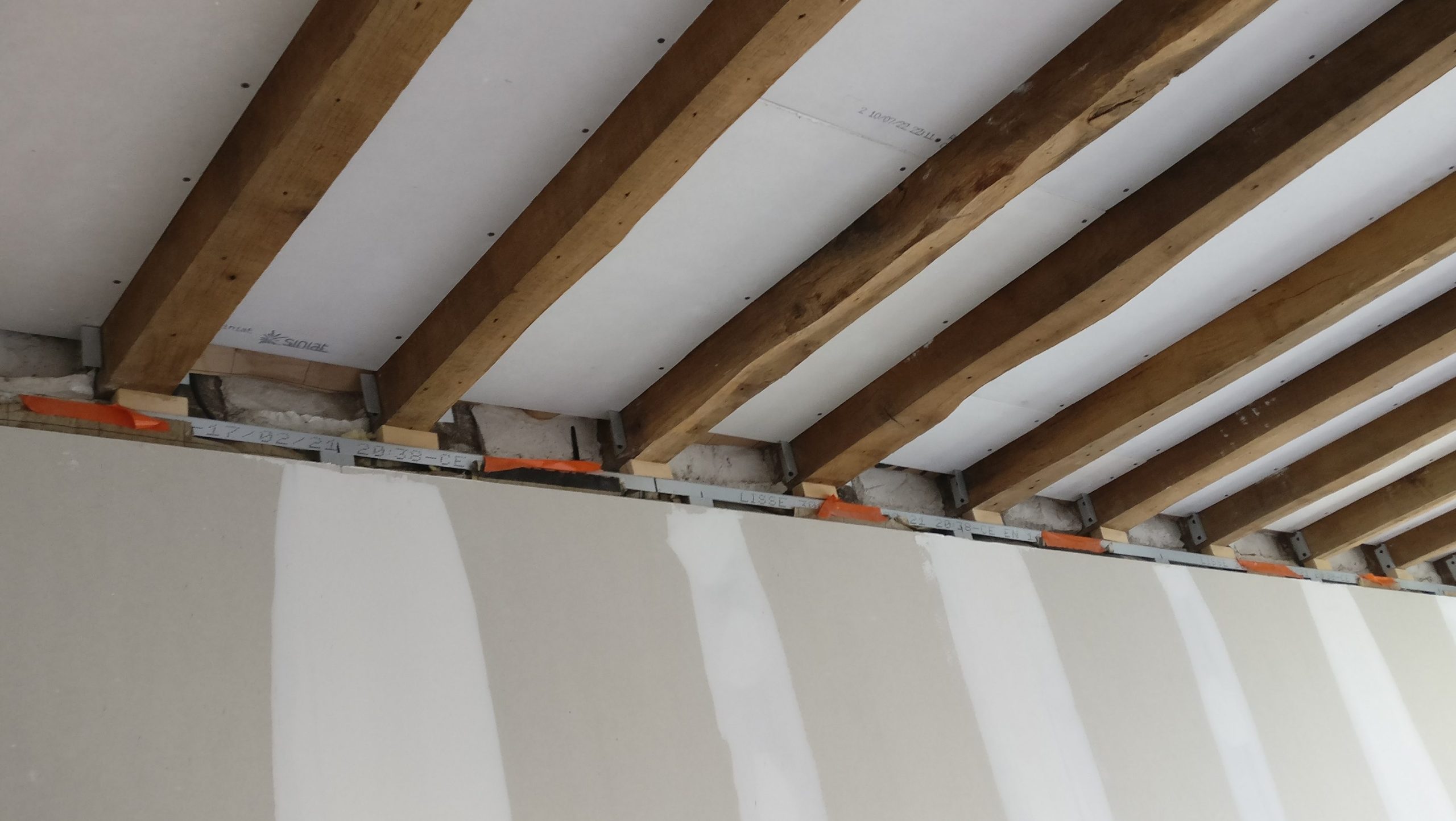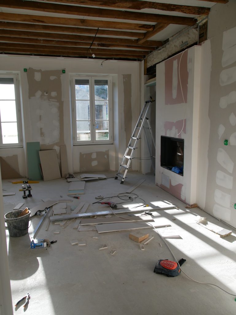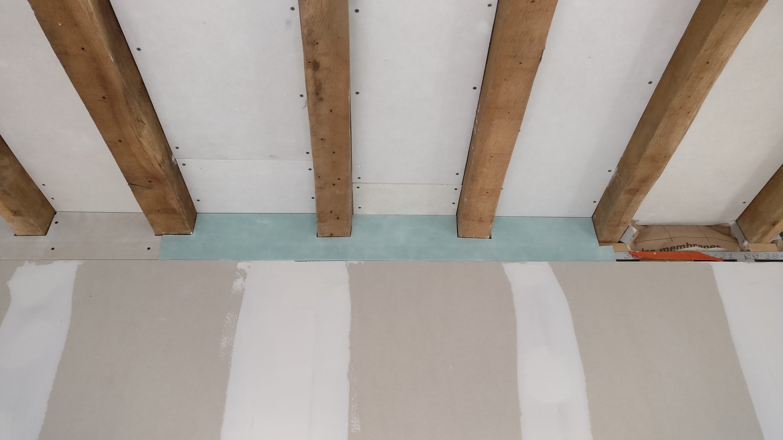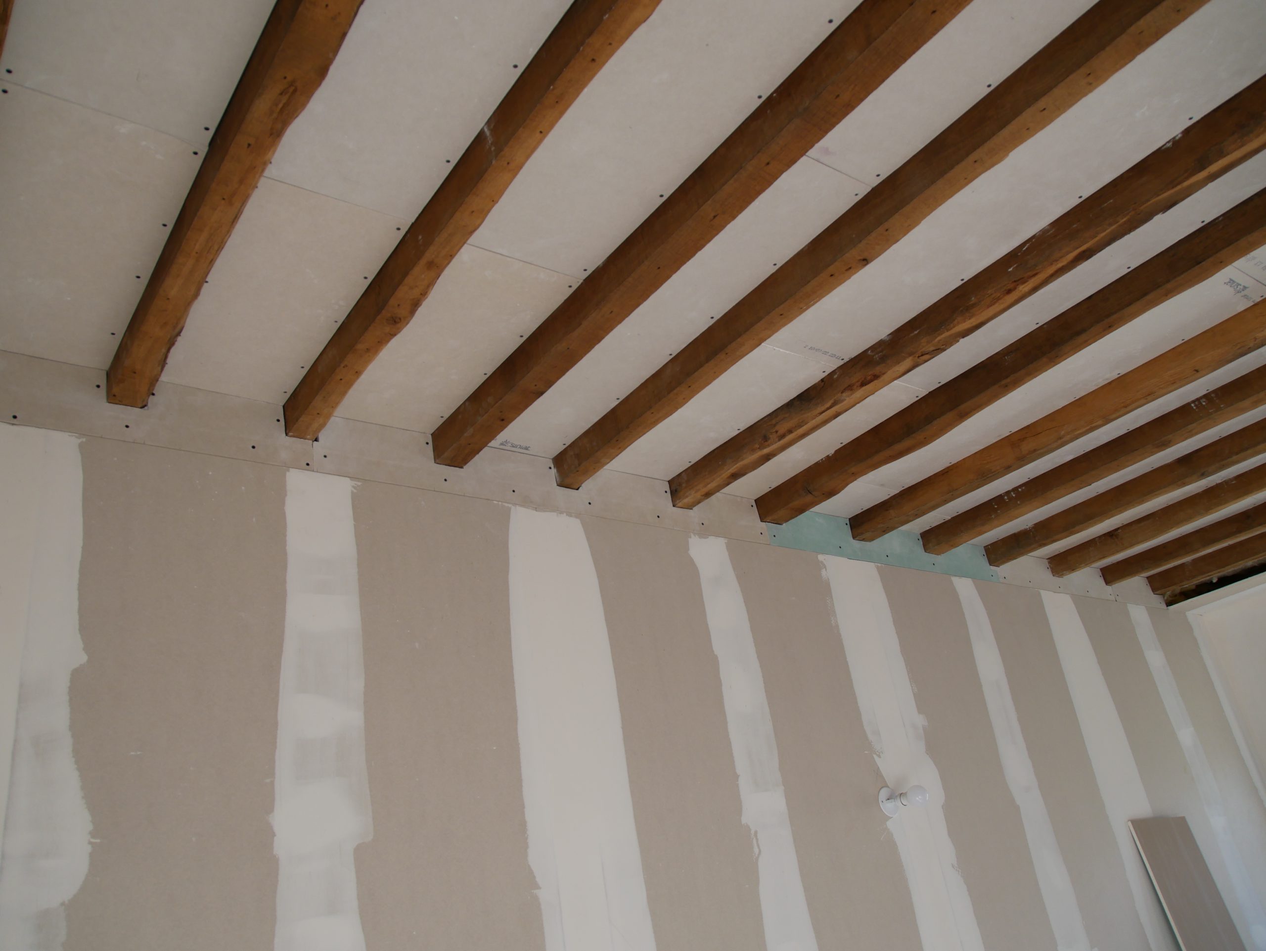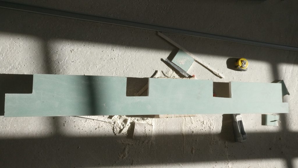 Au programme de cette fin de semaine finir les murs de placo. Pour pouvoir couler le plancher chauffant dans les temps, j’avais arrêté les plaques à 3 mètres de hauteur, soit 10 cm sous les poutres. Il me reste à combler tout ça maintenant que le plafond est fait.