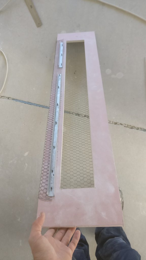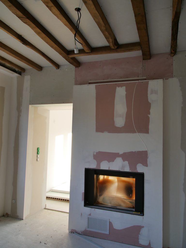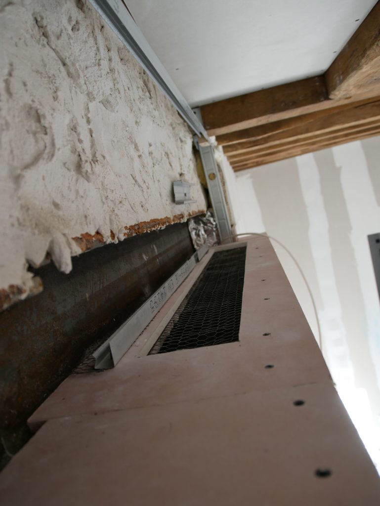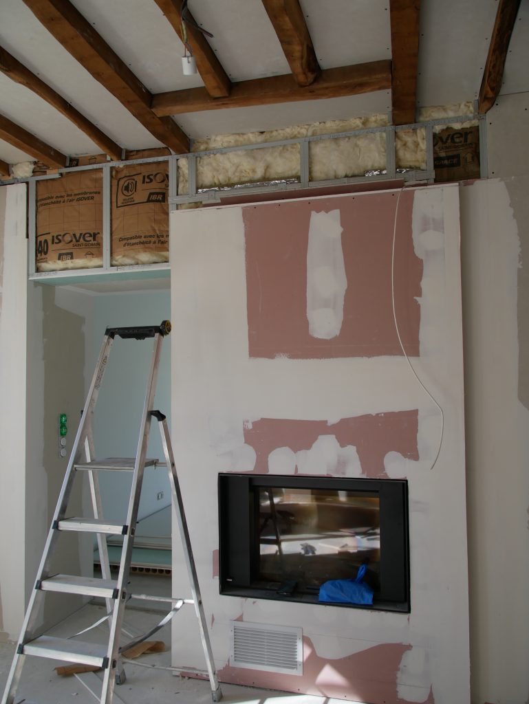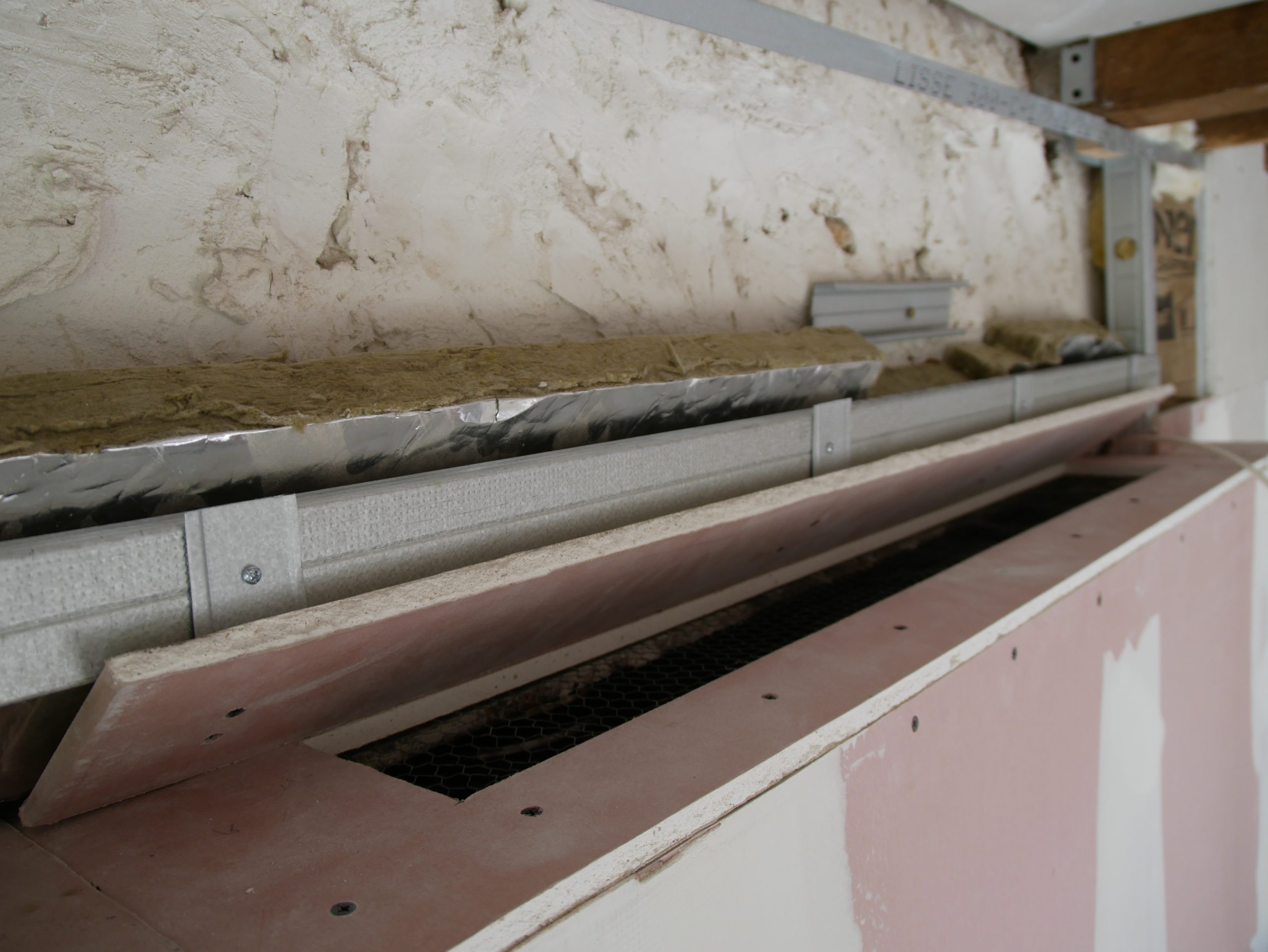 De l’autre coté c’est un peu plus compliqué car il y a la cheminée. Je dois faire une aération sur le dessus pour laisser l’air chaud s’évacuer. Problème : il n’y a pas assez de place entre le mur en placo et le devant de la cheminée… solution : faire une encoche dans le mur pour agrandir la surface d’évacuation. Pour éviter que des objets puissent tomber dans la hotte de la cheminée, j’ai récupéré du grillage à lapin et j’en ai fait une grille. J’ai ensuite fixé un placo en biais au dessus pour renvoyer l’air chaud.