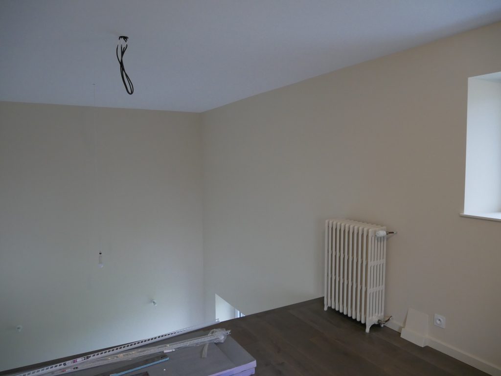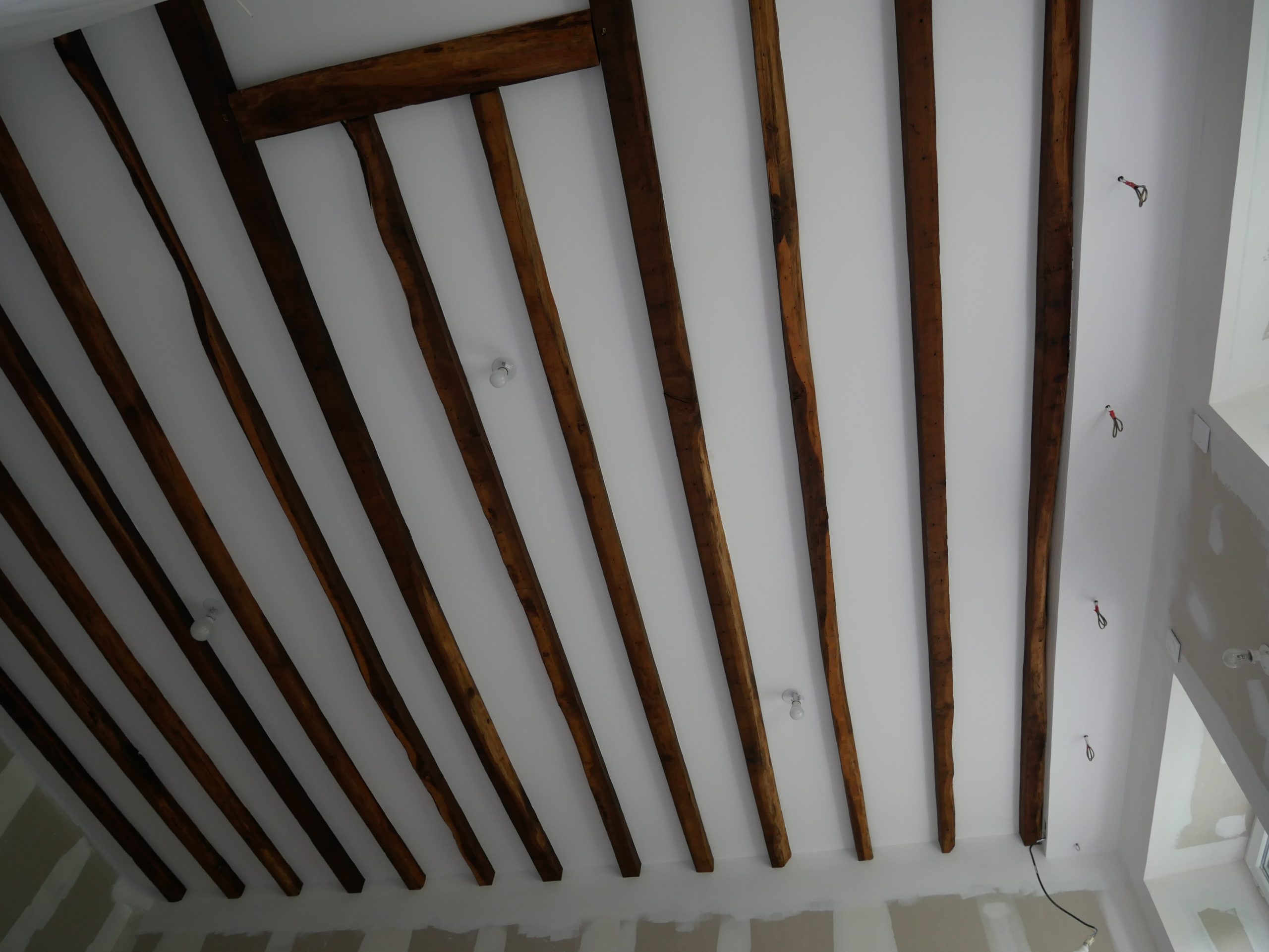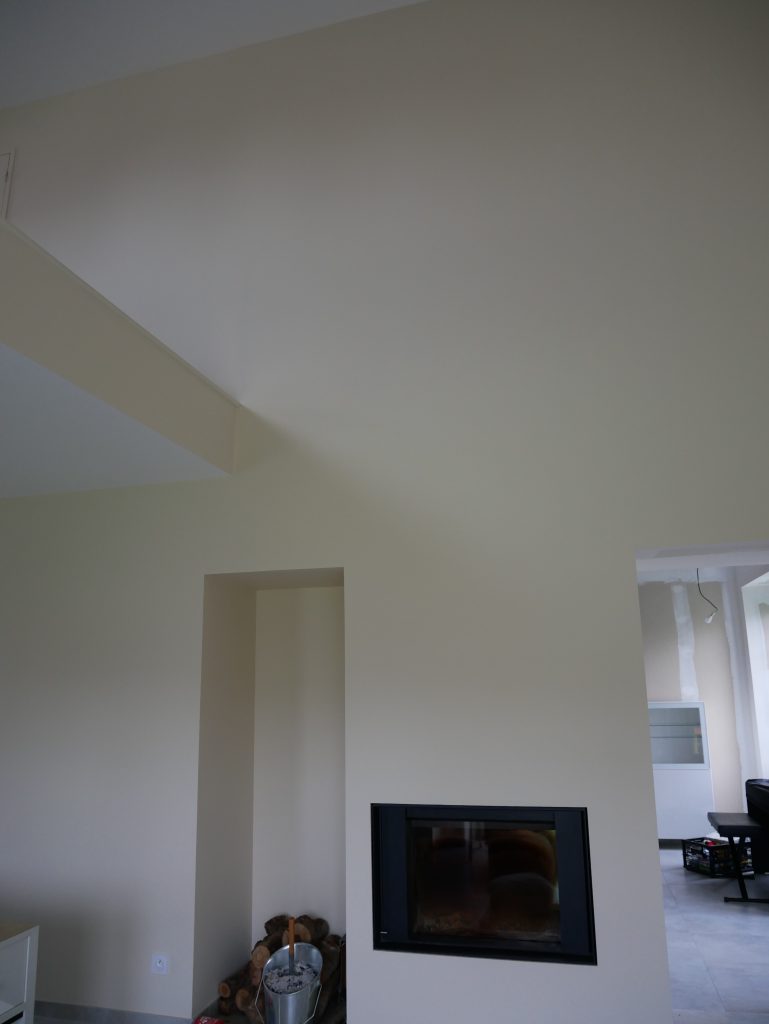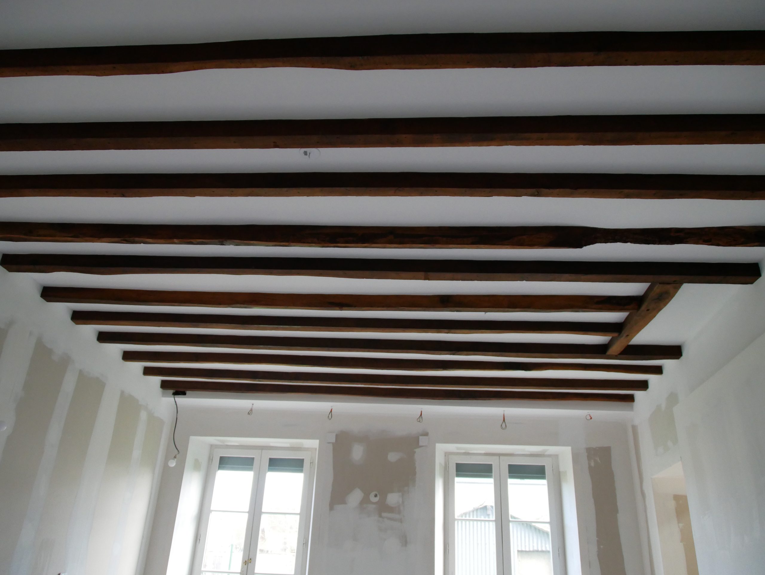 - Enduire et peindre le plafond du salon et passer du saturateur bois sur les poutres apparentes